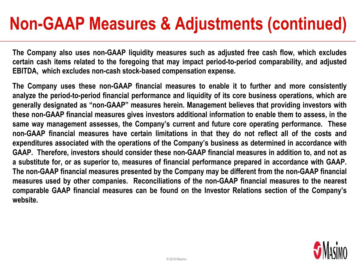 © 2019 Masimo Non-GAAP Measures & Adjustments (continued) The Company also uses non-GAAP liquidity measures such as adjusted free cash flow, which excludes certain cash items related to the foregoing that may impact period-to-period comparability, and adjusted EBITDA, which excludes non-cash stock-based compensation expense. The Company uses these non-GAAP financial measures to enable it to further and more consistently analyze the period-to-period financial performance and liquidity of its core business operations, which are generally designated as “non-GAAP” measures herein. Management believes that providing investors with these non-GAAP financial measures gives investors additional information to enable them to assess, in the same way management assesses, the Company’s current and future core operating performance. These non-GAAP financial measures have certain limitations in that they do not reflect all of the costs and expenditures associated with the operations of the Company’s business as determined in accordance with GAAP. Therefore, investors should consider these non-GAAP financial measures in addition to, and not as a substitute for, or as superior to, measures of financial performance prepared in accordance with GAAP. The non-GAAP financial measures presented by the Company may be different from the non-GAAP financial measures used by other companies. Reconciliations of the non-GAAP financial measures to the nearest comparable GAAP financial measures can be found on the Investor Relations section of the Company’s website.