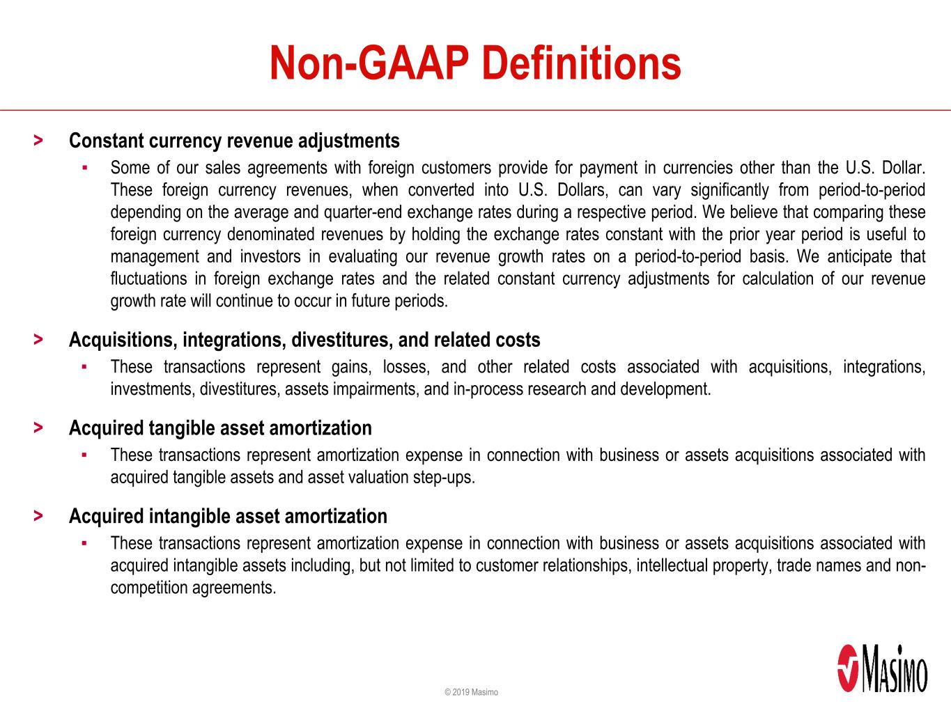 © 2019 Masimo Non-GAAP Definitions > Constant currency revenue adjustments ▪ Some of our sales agreements with foreign customers provide for payment in currencies other than the U.S. Dollar. These foreign currency revenues, when converted into U.S. Dollars, can vary significantly from period-to-period depending on the average and quarter-end exchange rates during a respective period. We believe that comparing these foreign currency denominated revenues by holding the exchange rates constant with the prior year period is useful to management and investors in evaluating our revenue growth rates on a period-to-period basis. We anticipate that fluctuations in foreign exchange rates and the related constant currency adjustments for calculation of our revenue growth rate will continue to occur in future periods. > Acquisitions, integrations, divestitures, and related costs ▪ These transactions represent gains, losses, and other related costs associated with acquisitions, integrations, investments, divestitures, assets impairments, and in-process research and development. > Acquired tangible asset amortization ▪ These transactions represent amortization expense in connection with business or assets acquisitions associated with acquired tangible assets and asset valuation step-ups. > Acquired intangible asset amortization ▪ These transactions represent amortization expense in connection with business or assets acquisitions associated with acquired intangible assets including, but not limited to customer relationships, intellectual property, trade names and non- competition agreements.
