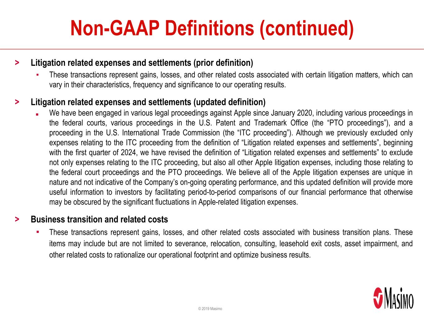 © 2019 Masimo Non-GAAP Definitions (continued) > Litigation related expenses and settlements (prior definition) ▪ These transactions represent gains, losses, and other related costs associated with certain litigation matters, which can vary in their characteristics, frequency and significance to our operating results. > Litigation related expenses and settlements (updated definition) ■ We have been engaged in various legal proceedings against Apple since January 2020, including various proceedings in the federal courts, various proceedings in the U.S. Patent and Trademark Office (the “PTO proceedings”), and a proceeding in the U.S. International Trade Commission (the “ITC proceeding”). Although we previously excluded only expenses relating to the ITC proceeding from the definition of “Litigation related expenses and settlements”, beginning with the first quarter of 2024, we have revised the definition of “Litigation related expenses and settlements” to exclude not only expenses relating to the ITC proceeding, but also all other Apple litigation expenses, including those relating to the federal court proceedings and the PTO proceedings. We believe all of the Apple litigation expenses are unique in nature and not indicative of the Company’s on-going operating performance, and this updated definition will provide more useful information to investors by facilitating period-to-period comparisons of our financial performance that otherwise may be obscured by the significant fluctuations in Apple-related litigation expenses. > Business transition and related costs ▪ These transactions represent gains, losses, and other related costs associated with business transition plans. These items may include but are not limited to severance, relocation, consulting, leasehold exit costs, asset impairment, and other related costs to rationalize our operational footprint and optimize business results.