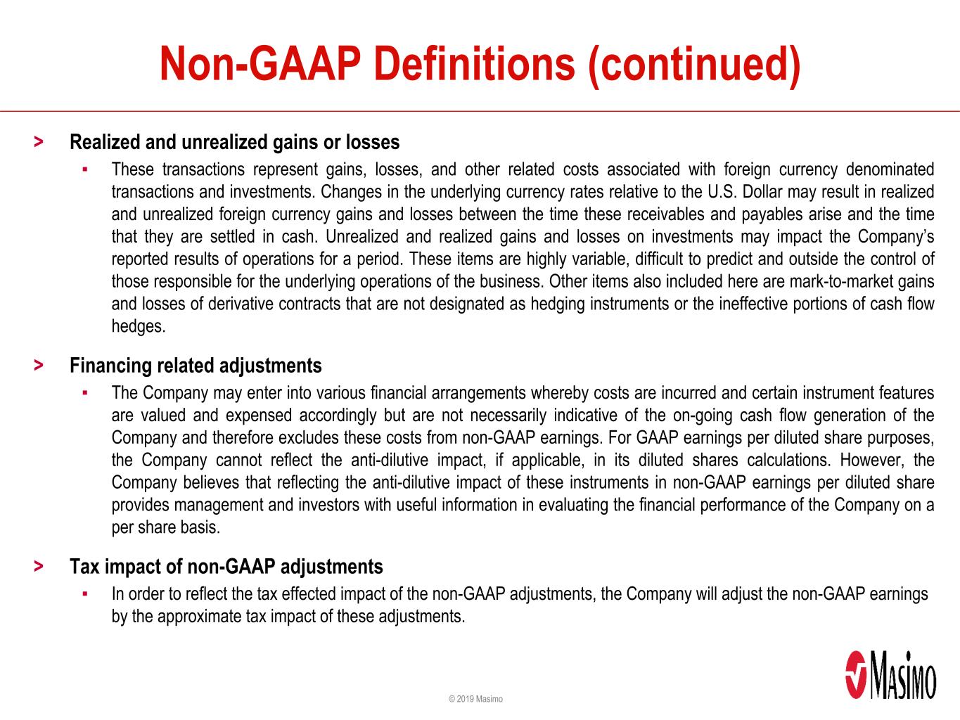 © 2019 Masimo Non-GAAP Definitions (continued) > Realized and unrealized gains or losses ▪ These transactions represent gains, losses, and other related costs associated with foreign currency denominated transactions and investments. Changes in the underlying currency rates relative to the U.S. Dollar may result in realized and unrealized foreign currency gains and losses between the time these receivables and payables arise and the time that they are settled in cash. Unrealized and realized gains and losses on investments may impact the Company’s reported results of operations for a period. These items are highly variable, difficult to predict and outside the control of those responsible for the underlying operations of the business. Other items also included here are mark-to-market gains and losses of derivative contracts that are not designated as hedging instruments or the ineffective portions of cash flow hedges. > Financing related adjustments ▪ The Company may enter into various financial arrangements whereby costs are incurred and certain instrument features are valued and expensed accordingly but are not necessarily indicative of the on-going cash flow generation of the Company and therefore excludes these costs from non-GAAP earnings. For GAAP earnings per diluted share purposes, the Company cannot reflect the anti-dilutive impact, if applicable, in its diluted shares calculations. However, the Company believes that reflecting the anti-dilutive impact of these instruments in non-GAAP earnings per diluted share provides management and investors with useful information in evaluating the financial performance of the Company on a per share basis. > Tax impact of non-GAAP adjustments ▪ In order to reflect the tax effected impact of the non-GAAP adjustments, the Company will adjust the non-GAAP earnings by the approximate tax impact of these adjustments.