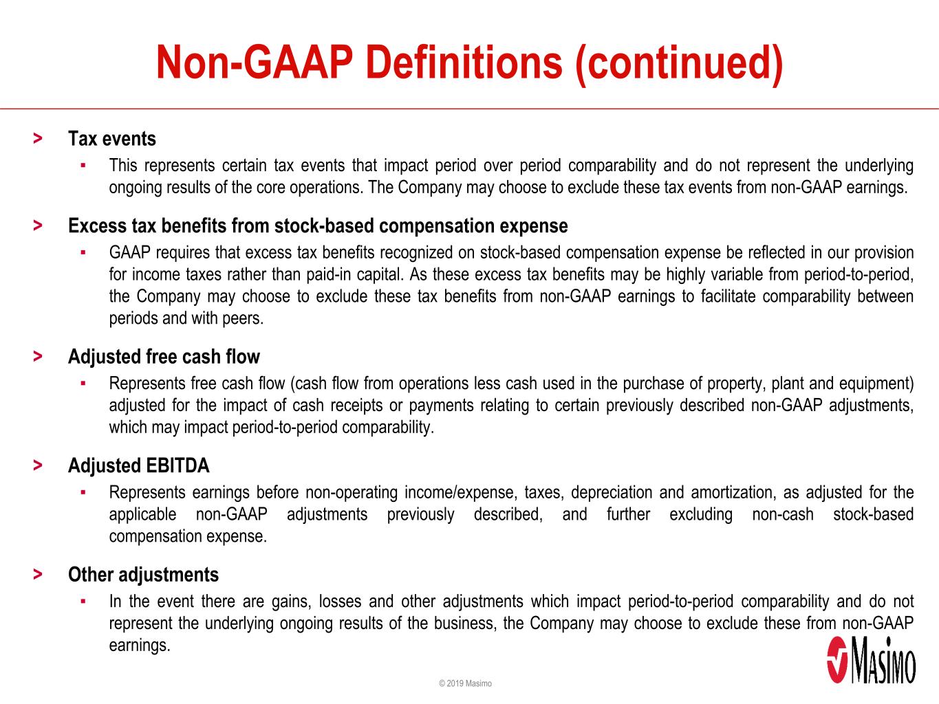 © 2019 Masimo Non-GAAP Definitions (continued) > Tax events ▪ This represents certain tax events that impact period over period comparability and do not represent the underlying ongoing results of the core operations. The Company may choose to exclude these tax events from non-GAAP earnings. > Excess tax benefits from stock-based compensation expense ▪ GAAP requires that excess tax benefits recognized on stock-based compensation expense be reflected in our provision for income taxes rather than paid-in capital. As these excess tax benefits may be highly variable from period-to-period, the Company may choose to exclude these tax benefits from non-GAAP earnings to facilitate comparability between periods and with peers. > Adjusted free cash flow ▪ Represents free cash flow (cash flow from operations less cash used in the purchase of property, plant and equipment) adjusted for the impact of cash receipts or payments relating to certain previously described non-GAAP adjustments, which may impact period-to-period comparability. > Adjusted EBITDA ▪ Represents earnings before non-operating income/expense, taxes, depreciation and amortization, as adjusted for the applicable non-GAAP adjustments previously described, and further excluding non-cash stock-based compensation expense. > Other adjustments ▪ In the event there are gains, losses and other adjustments which impact period-to-period comparability and do not represent the underlying ongoing results of the business, the Company may choose to exclude these from non-GAAP earnings.