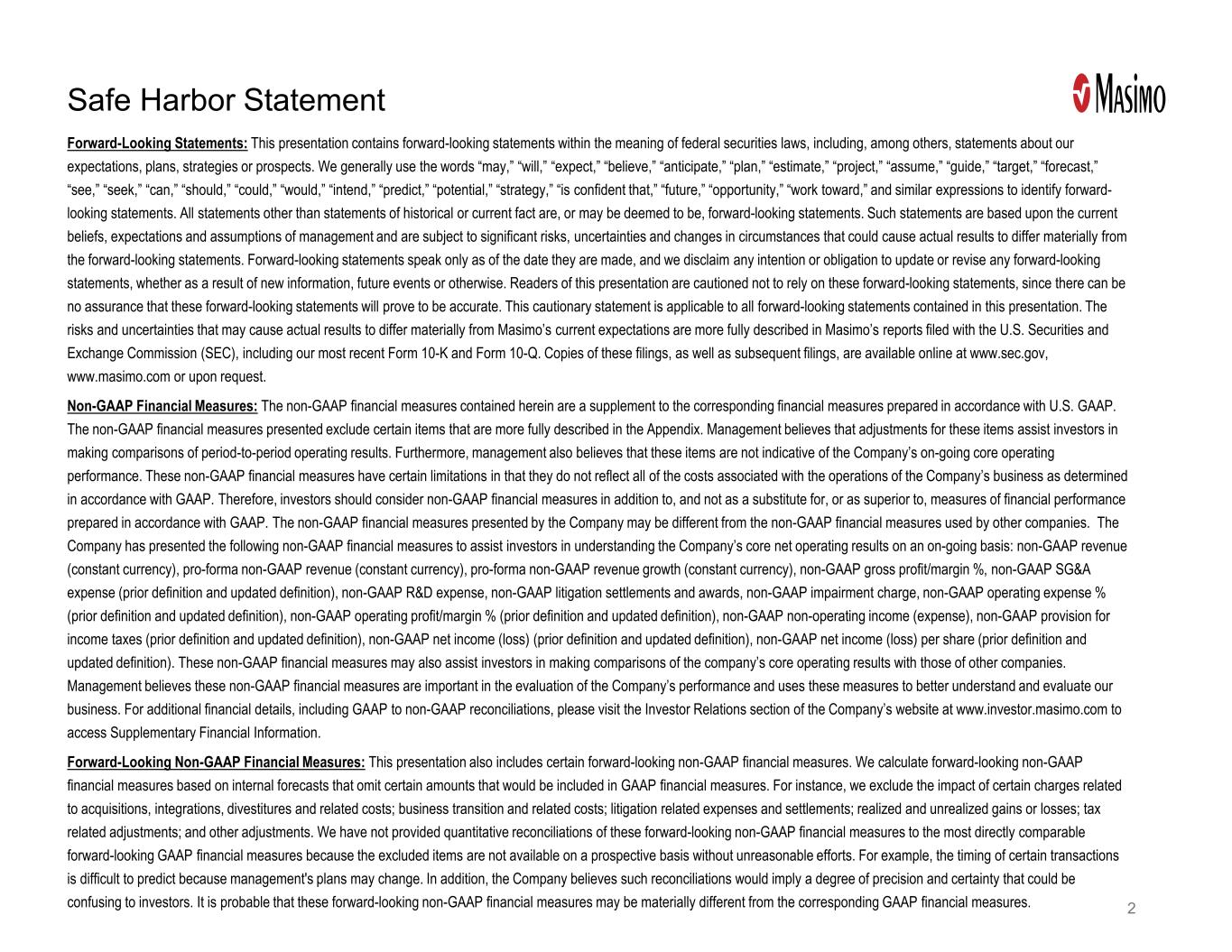 Safe Harbor Statement Forward-Looking Statements: This presentation contains forward-looking statements within the meaning of federal securities laws, including, among others, statements about our expectations, plans, strategies or prospects. We generally use the words “may,” “will,” “expect,” “believe,” “anticipate,” “plan,” “estimate,” “project,” “assume,” “guide,” “target,” “forecast,” “see,” “seek,” “can,” “should,” “could,” “would,” “intend,” “predict,” “potential,” “strategy,” “is confident that,” “future,” “opportunity,” “work toward,” and similar expressions to identify forward- looking statements. All statements other than statements of historical or current fact are, or may be deemed to be, forward-looking statements. Such statements are based upon the current beliefs, expectations and assumptions of management and are subject to significant risks, uncertainties and changes in circumstances that could cause actual results to differ materially from the forward-looking statements. Forward-looking statements speak only as of the date they are made, and we disclaim any intention or obligation to update or revise any forward-looking statements, whether as a result of new information, future events or otherwise. Readers of this presentation are cautioned not to rely on these forward-looking statements, since there can be no assurance that these forward-looking statements will prove to be accurate. This cautionary statement is applicable to all forward-looking statements contained in this presentation. The risks and uncertainties that may cause actual results to differ materially from Masimo’s current expectations are more fully described in Masimo’s reports filed with the U.S. Securities and Exchange Commission (SEC), including our most recent Form 10-K and Form 10-Q. Copies of these filings, as well as subsequent filings, are available online at www.sec.gov, www.masimo.com or upon request. Non-GAAP Financial Measures: The non-GAAP financial measures contained herein are a supplement to the corresponding financial measures prepared in accordance with U.S. GAAP. The non-GAAP financial measures presented exclude certain items that are more fully described in the Appendix. Management believes that adjustments for these items assist investors in making comparisons of period-to-period operating results. Furthermore, management also believes that these items are not indicative of the Company’s on-going core operating performance. These non-GAAP financial measures have certain limitations in that they do not reflect all of the costs associated with the operations of the Company’s business as determined in accordance with GAAP. Therefore, investors should consider non-GAAP financial measures in addition to, and not as a substitute for, or as superior to, measures of financial performance prepared in accordance with GAAP. The non-GAAP financial measures presented by the Company may be different from the non-GAAP financial measures used by other companies. The Company has presented the following non-GAAP financial measures to assist investors in understanding the Company’s core net operating results on an on-going basis: non-GAAP revenue (constant currency), pro-forma non-GAAP revenue (constant currency), pro-forma non-GAAP revenue growth (constant currency), non-GAAP gross profit/margin %, non-GAAP SG&A expense (prior definition and updated definition), non-GAAP R&D expense, non-GAAP litigation settlements and awards, non-GAAP impairment charge, non-GAAP operating expense % (prior definition and updated definition), non-GAAP operating profit/margin % (prior definition and updated definition), non-GAAP non-operating income (expense), non-GAAP provision for income taxes (prior definition and updated definition), non-GAAP net income (loss) (prior definition and updated definition), non-GAAP net income (loss) per share (prior definition and updated definition). These non-GAAP financial measures may also assist investors in making comparisons of the company’s core operating results with those of other companies. Management believes these non-GAAP financial measures are important in the evaluation of the Company’s performance and uses these measures to better understand and evaluate our business. For additional financial details, including GAAP to non-GAAP reconciliations, please visit the Investor Relations section of the Company’s website at www.investor.masimo.com to access Supplementary Financial Information. Forward-Looking Non-GAAP Financial Measures: This presentation also includes certain forward-looking non-GAAP financial measures. We calculate forward-looking non-GAAP financial measures based on internal forecasts that omit certain amounts that would be included in GAAP financial measures. For instance, we exclude the impact of certain charges related to acquisitions, integrations, divestitures and related costs; business transition and related costs; litigation related expenses and settlements; realized and unrealized gains or losses; tax related adjustments; and other adjustments. We have not provided quantitative reconciliations of these forward-looking non-GAAP financial measures to the most directly comparable forward-looking GAAP financial measures because the excluded items are not available on a prospective basis without unreasonable efforts. For example, the timing of certain transactions is difficult to predict because management's plans may change. In addition, the Company believes such reconciliations would imply a degree of precision and certainty that could be confusing to investors. It is probable that these forward-looking non-GAAP financial measures may be materially different from the corresponding GAAP financial measures. 2