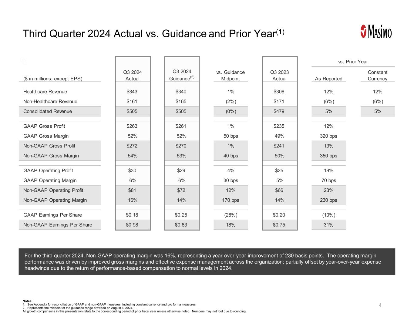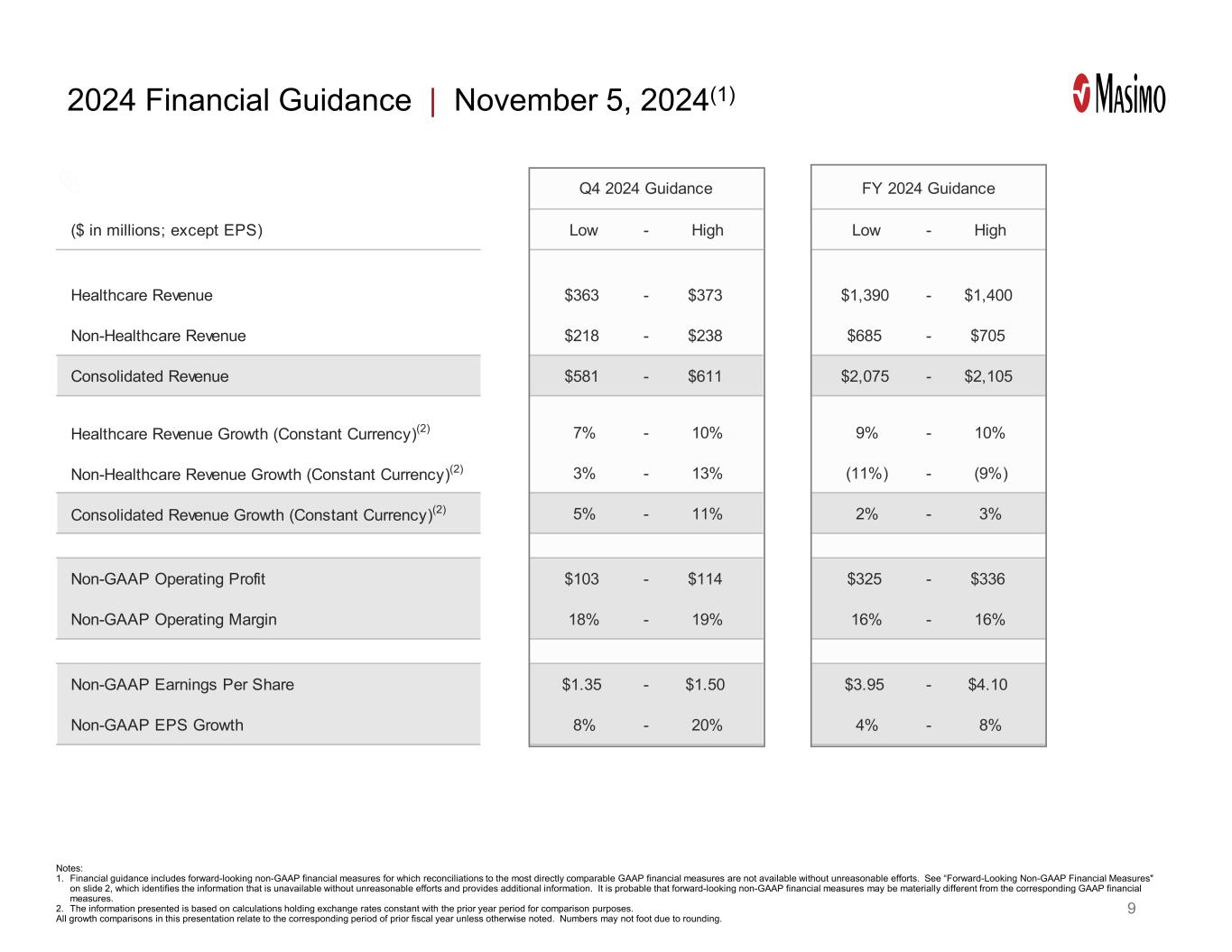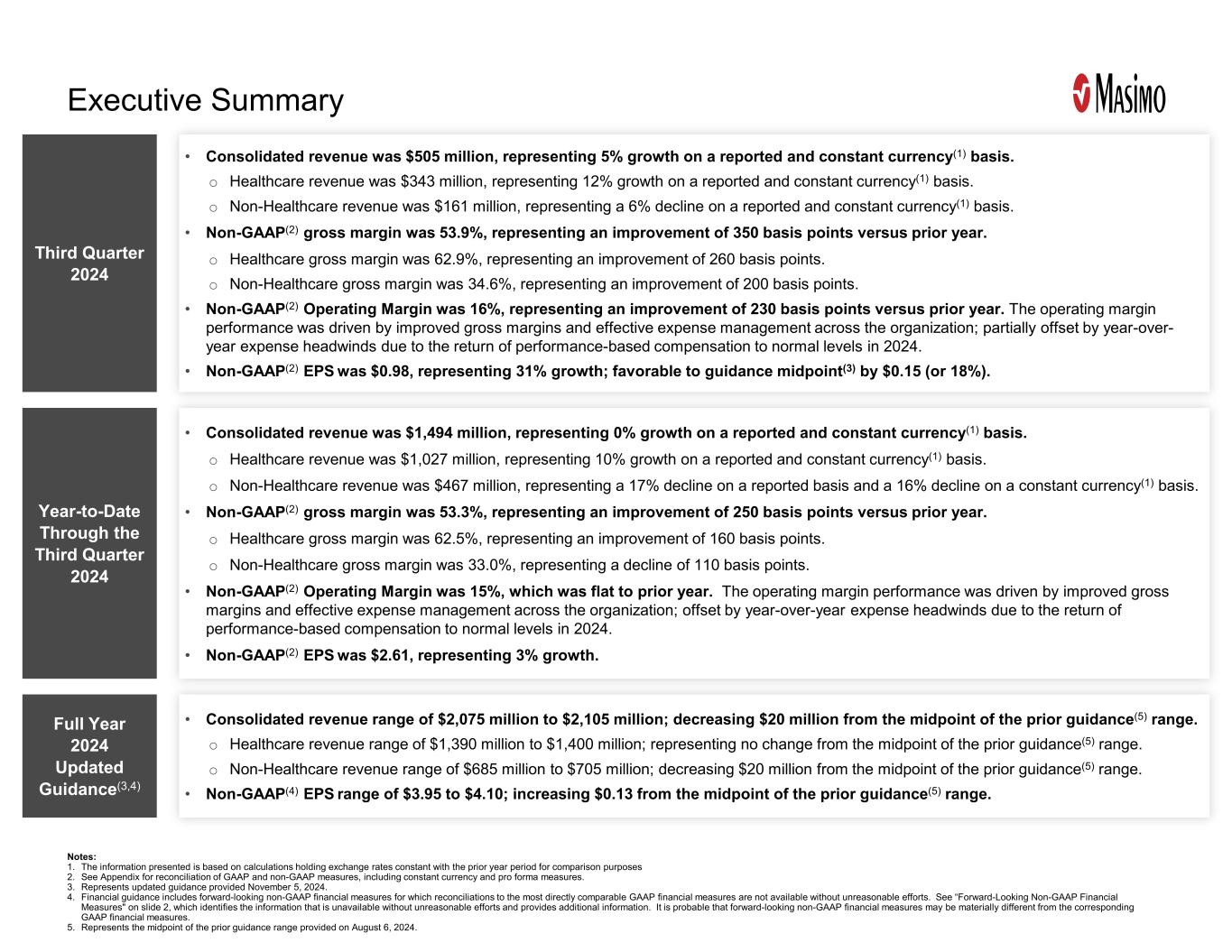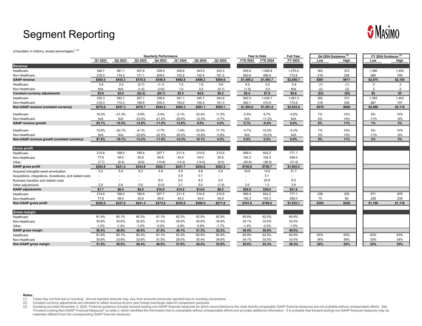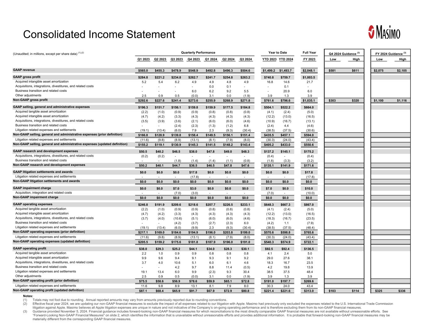 Consolidated Income Statement Notes: (1) Totals may not foot due to rounding. Annual reported amounts may vary from amounts previously reported due to rounding conventions. (2) Effective fiscal year 2024, we are updating our non-GAAP financial measures to exclude the impact of all expenses related to our litigation with Apple. Masimo had previously only excluded the expenses related to the U.S. International Trade Commission litigation against Apple. Masimo believes all Apple litigation expenses are unique in nature and not indicative of the Company’s on-going operating performance and is therefore excluding them from its non-GAAP financial measures. (3) Guidance provided November 5, 2024. Financial guidance includes forward-looking non-GAAP financial measures for which reconciliations to the most directly comparable GAAP financial measures are not available without unreasonable efforts. See “Forward-Looking Non-GAAP Financial Measures" on slide 2, which identifies the information that is unavailable without unreasonable efforts and provides additional information. It is probable that forward-looking non-GAAP financial measures may be materially different from the corresponding GAAP financial measures. (Unaudited; in millions, except per share data) (1),(2) Quarterly Performance Year to Date Full Year Q4 2024 Guidance (3) FY 2024 Guidance (3) Q1 2023 Q2 2023 Q3 2023 Q4 2023 Q1 2024 Q2 2024 Q3 2024 YTD 2023 YTD 2024 FY 2023 Low High Low High GAAP revenue $565.0 $455.3 $478.9 $548.9 $492.8 $496.3 $504.6 $1,499.2 $1,493.7 $2,048.1 $581 $611 $2,075 $2,105 GAAP gross profit $284.8 $221.2 $234.8 $262.7 $241.7 $254.8 $263.2 $740.8 $759.7 $1,003.5 Acquired intangible asset amortization 5.2 5.4 6.2 4.9 4.9 4.8 4.9 16.8 14.6 21.7 Acquisitions, integrations, divestitures, and related costs - - - - 0.0 0.1 - - 0.1 - Business transition and related costs - - - 6.0 6.2 9.2 5.5 - 20.9 6.0 Other adjustments 2.5 0.9 0.5 (0.0) 3.1 0.0 (1.9) 3.9 1.3 3.9 Non-GAAP gross profit $292.6 $227.6 $241.4 $273.6 $255.9 $268.9 $271.8 $761.6 $796.6 $1,035.1 $303 $320 $1,100 $1,116 GAAP selling, general and administrative expenses $196.3 $151.7 $156.1 $159.8 $159.9 $177.5 $184.8 $504.1 $522.2 $664.0 Acquired tangible asset amortization (2.2) (1.0) (0.9) (0.9) (0.8) (0.8) (0.8) (4.1) (2.4) (5.0) Acquired intangible asset amortization (4.7) (4.2) (3.3) (4.3) (4.3) (4.3) (4.3) (12.2) (13.0) (16.5) Acquisitions, integrations, divestitures, and related costs (3.5) (3.9) (3.6) (2.1) (6.0) (6.0) (4.6) (10.9) (16.7) (13.1) Business transition and related costs - - (2.4) (2.3) (1.3) (1.2) 6.8 (2.4) 4.4 (4.6) Litigation related expenses and settlements (19.1) (13.4) (6.0) 7.9 2.3 (9.3) (30.4) (38.5) (37.5) (30.6) Non-GAAP selling, general and administrative expenses (prior definition) $166.8 $128.9 $139.8 $158.4 $149.5 $156.1 $151.4 $435.5 $457.1 $594.0 Litigation related expenses and settlements (11.6) (9.8) (8.9) (13.1) (8.1) (7.9) (8.0) (30.3) (24.0) (43.4) Non-GAAP selling, general and administrative expenses (updated definition) $155.2 $119.1 $130.9 $145.3 $141.5 $148.2 $143.4 $405.2 $433.0 $550.6 GAAP research and development expenses $50.5 $40.2 $46.5 $38.0 $47.8 $49.0 $48.3 $137.2 $145.1 $175.2 Acquisitions, integrations, divestitures, and related costs (0.2) (0.2) - - - - - (0.4) - (0.4) Business transition and related costs - - (1.8) (1.4) (1.4) (1.1) (0.8) (1.8) (3.3) (3.2) Non-GAAP research and development expenses $50.2 $40.1 $44.7 $36.5 $46.5 $47.8 $47.6 $135.1 $141.9 $171.6 GAAP litigation settlements and awards $0.0 $0.0 $0.0 $17.8 $0.0 $0.0 $0.0 $0.0 $0.0 $17.8 Litigation related expenses and settlements - - - (17.8) - - - - - (17.8) Non-GAAP litigation settlements and awards $0.0 $0.0 $0.0 $0.0 $0.0 $0.0 $0.0 $0.0 $0.0 $0.0 GAAP impairment charge $0.0 $0.0 $7.0 $3.0 $0.0 $0.0 $0.0 $7.0 $0.0 $10.0 Acquisition, integration and related costs - - (7.0) (3.0) - - - (7.0) - (10.0) Non-GAAP impairment charge $0.0 $0.0 $0.0 $0.0 $0.0 $0.0 $0.0 $0.0 $0.0 $0.0 GAAP operating expenses $246.8 $191.9 $209.6 $218.6 $207.7 $226.5 $233.1 $648.3 $667.3 $867.0 Acquired tangible asset amortization (2.2) (1.0) (0.9) (0.9) (0.8) (0.8) (0.8) (4.1) (2.4) (5.0) Acquired intangible asset amortization (4.7) (4.2) (3.3) (4.3) (4.3) (4.3) (4.3) (12.2) (13.0) (16.5) Acquisitions, integrations, divestitures, and related costs (3.7) (4.0) (10.6) (5.1) (6.0) (6.0) (4.6) (18.3) (16.7) (23.5) Business transition and related costs - - (4.2) (3.7) (2.7) (2.3) 6.0 (4.2) 1.1 (7.9) Litigation related expenses and settlements (19.1) (13.4) (6.0) (9.9) 2.3 (9.3) (30.4) (38.5) (37.5) (48.4) Non-GAAP operating expenses (prior definition) $217.1 $169.0 $184.6 $194.9 $196.0 $203.8 $199.0 $570.6 $598.8 $765.6 Litigation related expenses and settlements (11.6) (9.8) (8.9) (13.1) (8.1) (7.9) (8.0) (30.3) (24.0) (43.4) Non-GAAP operating expenses (updated definition) $205.5 $159.2 $175.6 $181.8 $187.9 $196.0 $191.0 $540.3 $574.9 $722.1 GAAP operating profit $38.0 $29.3 $25.2 $44.1 $34.0 $28.3 $30.1 $92.5 $92.4 $136.5 Acquired tangible asset amortization 2.2 1.0 0.9 0.9 0.8 0.8 0.8 4.1 2.4 5.0 Acquired intangible asset amortization 9.9 9.6 9.4 9.1 9.3 9.1 9.2 29.0 27.6 38.1 Acquisitions, integrations, divestitures, and related costs 3.7 4.0 10.6 5.1 6.0 6.1 4.6 18.3 16.7 23.5 Business transition and related costs - - 4.2 9.7 8.8 11.4 (0.5) 4.2 19.8 13.9 Litigation related expenses and settlements 19.1 13.4 6.0 9.9 (2.3) 9.3 30.4 38.5 37.5 48.4 Other adjustments 2.5 0.9 0.5 (0.0) 3.1 0.0 (1.9) 3.9 1.3 3.9 Non-GAAP operating profit (prior definition) $75.5 $58.6 $56.9 $78.6 $59.9 $65.1 $72.8 $191.0 $197.7 $269.6 Litigation related expenses and settlements 11.6 9.8 8.9 13.1 8.1 7.9 8.0 30.3 24.0 43.4 Non-GAAP operating profit (updated definition) $87.1 $68.4 $65.9 $91.7 $67.9 $72.9 $80.8 $221.4 $221.6 $313.0 $103 $114 $325 $336