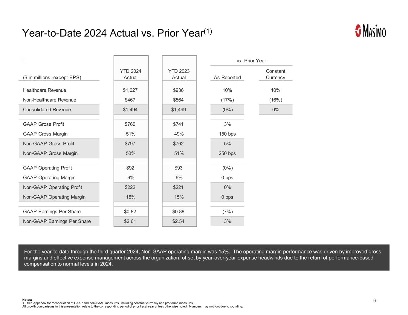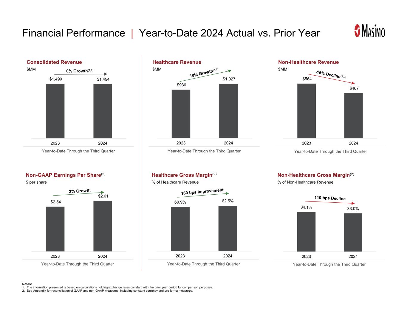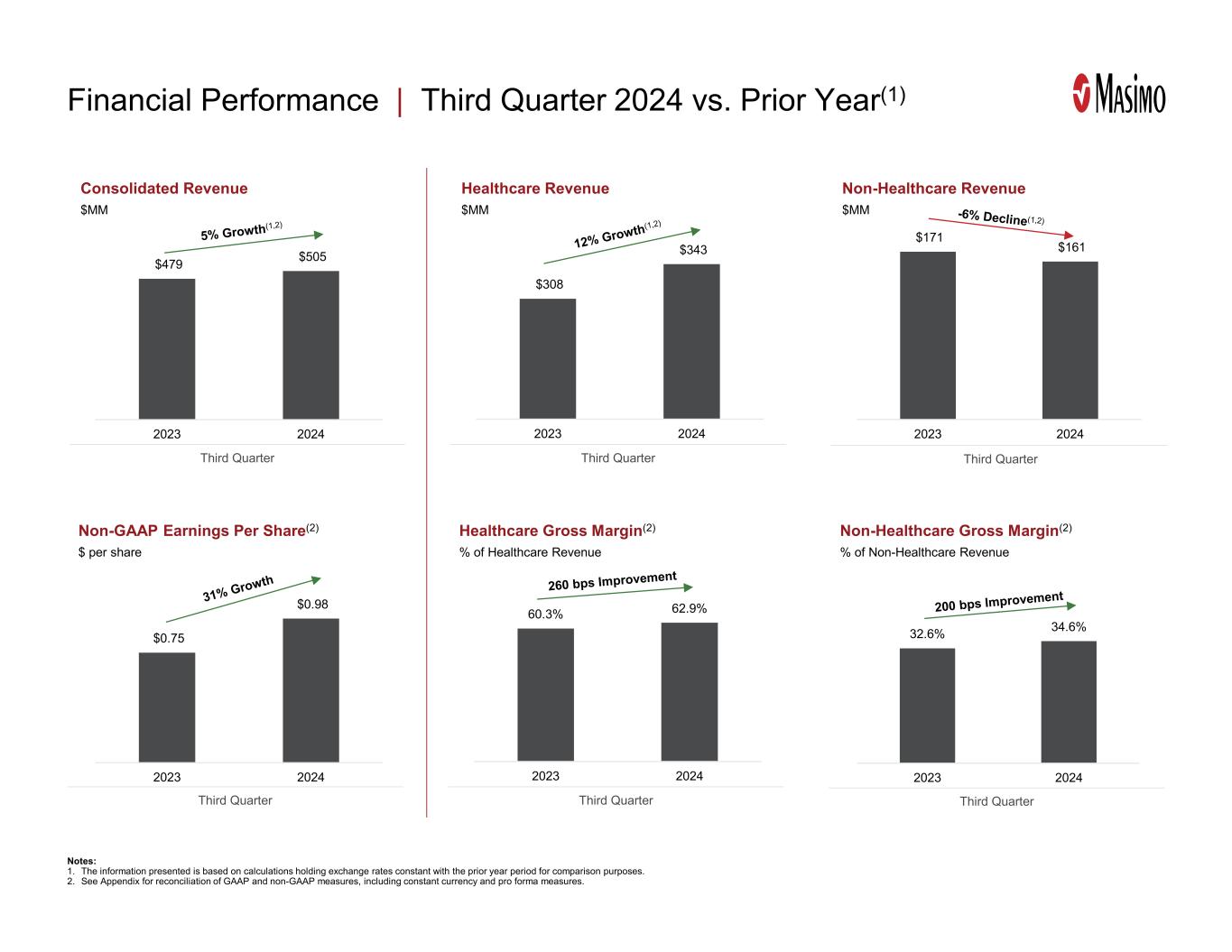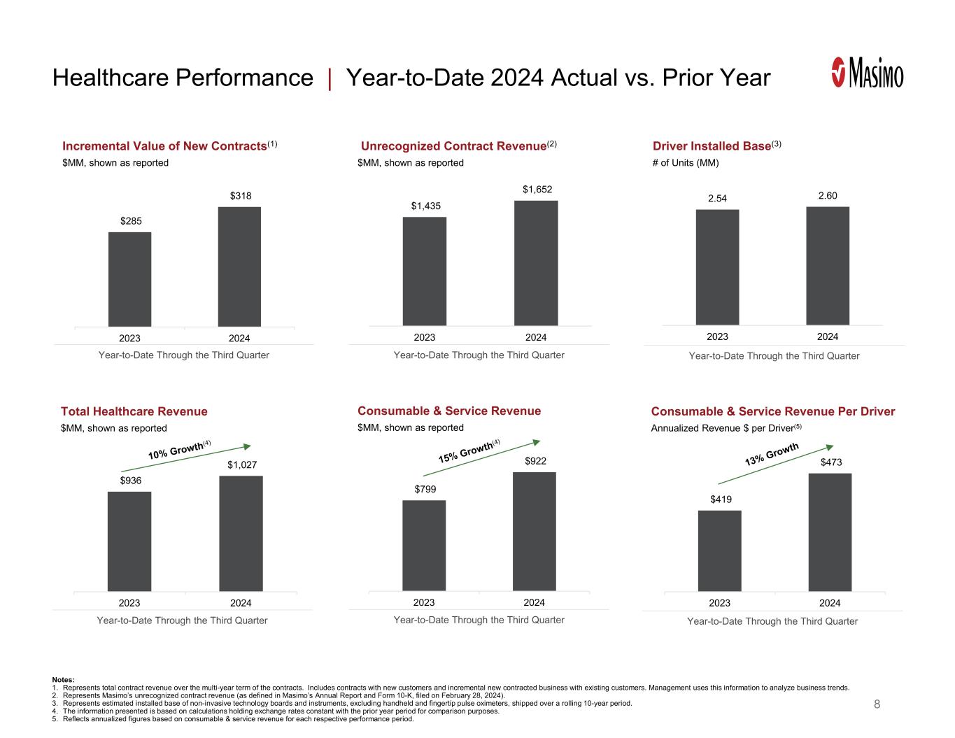 $1,435 $1,652 2023 2024 Healthcare Performance | Year-to-Date 2024 Actual vs. Prior Year Year-to-Date Through the Third Quarter Total Healthcare Revenue $MM, shown as reported Year-to-Date Through the Third Quarter Unrecognized Contract Revenue(2) $MM, shown as reported Year-to-Date Through the Third Quarter Driver Installed Base(3) # of Units (MM) Year-to-Date Through the Third Quarter Incremental Value of New Contracts(1) $MM, shown as reported Year-to-Date Through the Third Quarter Consumable & Service Revenue $MM, shown as reported Year-to-Date Through the Third Quarter Notes: 1. Represents total contract revenue over the multi-year term of the contracts. Includes contracts with new customers and incremental new contracted business with existing customers. Management uses this information to analyze business trends. 2. Represents Masimo’s unrecognized contract revenue (as defined in Masimo’s Annual Report and Form 10-K, filed on February 28, 2024). 3. Represents estimated installed base of non-invasive technology boards and instruments, excluding handheld and fingertip pulse oximeters, shipped over a rolling 10-year period. 4. The information presented is based on calculations holding exchange rates constant with the prior year period for comparison purposes. 5. Reflects annualized figures based on consumable & service revenue for each respective performance period. $936 $1,027 2023 2024 $799 $922 2023 2024 Consumable & Service Revenue Per Driver Annualized Revenue $ per Driver(5) $285 $318 2023 2024 $419 $473 2023 2024 2.54 2.60 2023 2024 8
