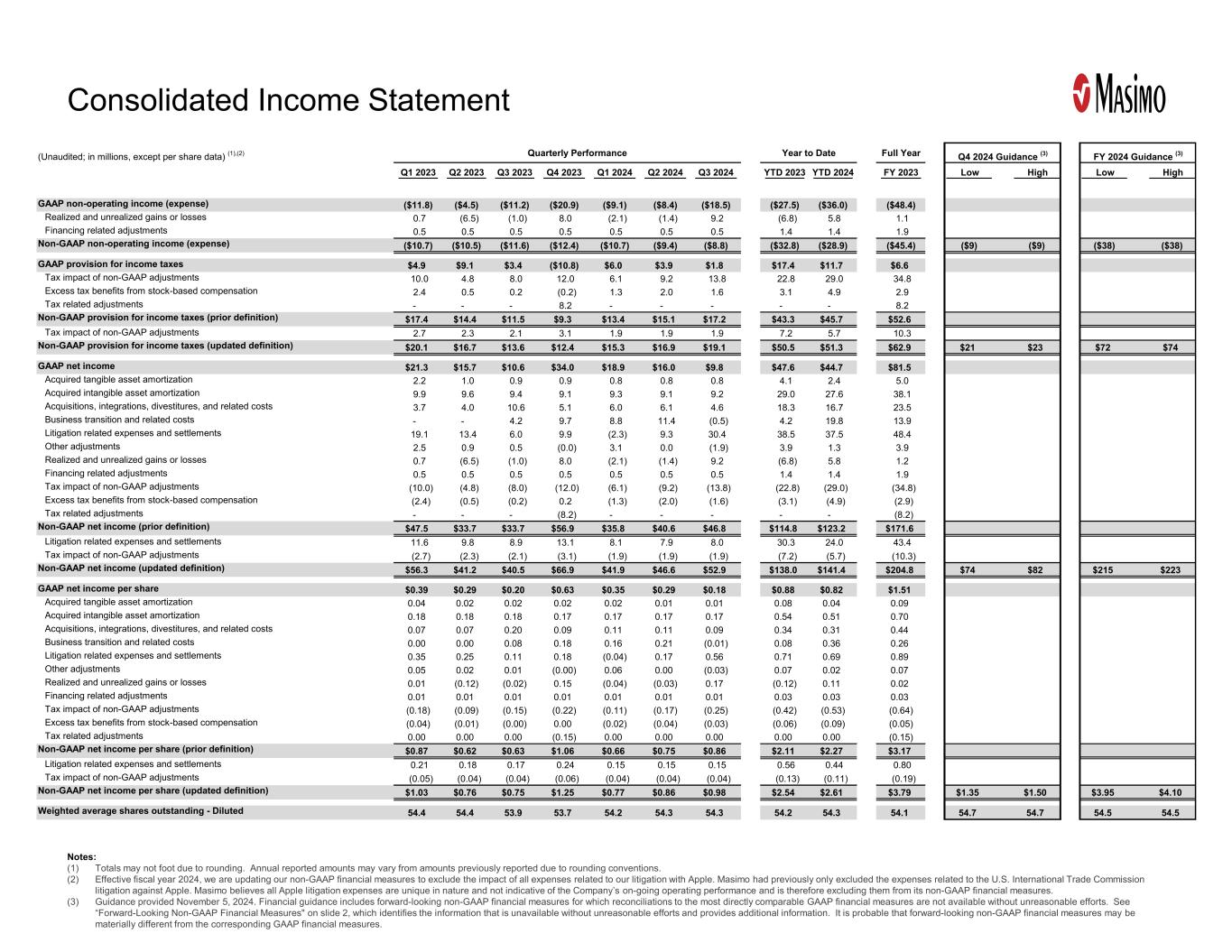 Consolidated Income Statement Notes: (1) Totals may not foot due to rounding. Annual reported amounts may vary from amounts previously reported due to rounding conventions. (2) Effective fiscal year 2024, we are updating our non-GAAP financial measures to exclude the impact of all expenses related to our litigation with Apple. Masimo had previously only excluded the expenses related to the U.S. International Trade Commission litigation against Apple. Masimo believes all Apple litigation expenses are unique in nature and not indicative of the Company’s on-going operating performance and is therefore excluding them from its non-GAAP financial measures. (3) Guidance provided November 5, 2024. Financial guidance includes forward-looking non-GAAP financial measures for which reconciliations to the most directly comparable GAAP financial measures are not available without unreasonable efforts. See “Forward-Looking Non-GAAP Financial Measures" on slide 2, which identifies the information that is unavailable without unreasonable efforts and provides additional information. It is probable that forward-looking non-GAAP financial measures may be materially different from the corresponding GAAP financial measures. (Unaudited; in millions, except per share data) (1),(2) Quarterly Performance Year to Date Full Year Q4 2024 Guidance (3) FY 2024 Guidance (3) Q1 2023 Q2 2023 Q3 2023 Q4 2023 Q1 2024 Q2 2024 Q3 2024 YTD 2023 YTD 2024 FY 2023 Low High Low High GAAP non-operating income (expense) ($11.8) ($4.5) ($11.2) ($20.9) ($9.1) ($8.4) ($18.5) ($27.5) ($36.0) ($48.4) Realized and unrealized gains or losses 0.7 (6.5) (1.0) 8.0 (2.1) (1.4) 9.2 (6.8) 5.8 1.1 Financing related adjustments 0.5 0.5 0.5 0.5 0.5 0.5 0.5 1.4 1.4 1.9 Non-GAAP non-operating income (expense) ($10.7) ($10.5) ($11.6) ($12.4) ($10.7) ($9.4) ($8.8) ($32.8) ($28.9) ($45.4) ($9) ($9) ($38) ($38) GAAP provision for income taxes $4.9 $9.1 $3.4 ($10.8) $6.0 $3.9 $1.8 $17.4 $11.7 $6.6 Tax impact of non-GAAP adjustments 10.0 4.8 8.0 12.0 6.1 9.2 13.8 22.8 29.0 34.8 Excess tax benefits from stock-based compensation 2.4 0.5 0.2 (0.2) 1.3 2.0 1.6 3.1 4.9 2.9 Tax related adjustments - - - 8.2 - - - - - 8.2 Non-GAAP provision for income taxes (prior definition) $17.4 $14.4 $11.5 $9.3 $13.4 $15.1 $17.2 $43.3 $45.7 $52.6 Tax impact of non-GAAP adjustments 2.7 2.3 2.1 3.1 1.9 1.9 1.9 7.2 5.7 10.3 Non-GAAP provision for income taxes (updated definition) $20.1 $16.7 $13.6 $12.4 $15.3 $16.9 $19.1 $50.5 $51.3 $62.9 $21 $23 $72 $74 GAAP net income $21.3 $15.7 $10.6 $34.0 $18.9 $16.0 $9.8 $47.6 $44.7 $81.5 Acquired tangible asset amortization 2.2 1.0 0.9 0.9 0.8 0.8 0.8 4.1 2.4 5.0 Acquired intangible asset amortization 9.9 9.6 9.4 9.1 9.3 9.1 9.2 29.0 27.6 38.1 Acquisitions, integrations, divestitures, and related costs 3.7 4.0 10.6 5.1 6.0 6.1 4.6 18.3 16.7 23.5 Business transition and related costs - - 4.2 9.7 8.8 11.4 (0.5) 4.2 19.8 13.9 Litigation related expenses and settlements 19.1 13.4 6.0 9.9 (2.3) 9.3 30.4 38.5 37.5 48.4 Other adjustments 2.5 0.9 0.5 (0.0) 3.1 0.0 (1.9) 3.9 1.3 3.9 Realized and unrealized gains or losses 0.7 (6.5) (1.0) 8.0 (2.1) (1.4) 9.2 (6.8) 5.8 1.2 Financing related adjustments 0.5 0.5 0.5 0.5 0.5 0.5 0.5 1.4 1.4 1.9 Tax impact of non-GAAP adjustments (10.0) (4.8) (8.0) (12.0) (6.1) (9.2) (13.8) (22.8) (29.0) (34.8) Excess tax benefits from stock-based compensation (2.4) (0.5) (0.2) 0.2 (1.3) (2.0) (1.6) (3.1) (4.9) (2.9) Tax related adjustments - - - (8.2) - - - - - (8.2) Non-GAAP net income (prior definition) $47.5 $33.7 $33.7 $56.9 $35.8 $40.6 $46.8 $114.8 $123.2 $171.6 Litigation related expenses and settlements 11.6 9.8 8.9 13.1 8.1 7.9 8.0 30.3 24.0 43.4 Tax impact of non-GAAP adjustments (2.7) (2.3) (2.1) (3.1) (1.9) (1.9) (1.9) (7.2) (5.7) (10.3) Non-GAAP net income (updated definition) $56.3 $41.2 $40.5 $66.9 $41.9 $46.6 $52.9 $138.0 $141.4 $204.8 $74 $82 $215 $223 GAAP net income per share $0.39 $0.29 $0.20 $0.63 $0.35 $0.29 $0.18 $0.88 $0.82 $1.51 Acquired tangible asset amortization 0.04 0.02 0.02 0.02 0.02 0.01 0.01 0.08 0.04 0.09 Acquired intangible asset amortization 0.18 0.18 0.18 0.17 0.17 0.17 0.17 0.54 0.51 0.70 Acquisitions, integrations, divestitures, and related costs 0.07 0.07 0.20 0.09 0.11 0.11 0.09 0.34 0.31 0.44 Business transition and related costs 0.00 0.00 0.08 0.18 0.16 0.21 (0.01) 0.08 0.36 0.26 Litigation related expenses and settlements 0.35 0.25 0.11 0.18 (0.04) 0.17 0.56 0.71 0.69 0.89 Other adjustments 0.05 0.02 0.01 (0.00) 0.06 0.00 (0.03) 0.07 0.02 0.07 Realized and unrealized gains or losses 0.01 (0.12) (0.02) 0.15 (0.04) (0.03) 0.17 (0.12) 0.11 0.02 Financing related adjustments 0.01 0.01 0.01 0.01 0.01 0.01 0.01 0.03 0.03 0.03 Tax impact of non-GAAP adjustments (0.18) (0.09) (0.15) (0.22) (0.11) (0.17) (0.25) (0.42) (0.53) (0.64) Excess tax benefits from stock-based compensation (0.04) (0.01) (0.00) 0.00 (0.02) (0.04) (0.03) (0.06) (0.09) (0.05) Tax related adjustments 0.00 0.00 0.00 (0.15) 0.00 0.00 0.00 0.00 0.00 (0.15) Non-GAAP net income per share (prior definition) $0.87 $0.62 $0.63 $1.06 $0.66 $0.75 $0.86 $2.11 $2.27 $3.17 Litigation related expenses and settlements 0.21 0.18 0.17 0.24 0.15 0.15 0.15 0.56 0.44 0.80 Tax impact of non-GAAP adjustments (0.05) (0.04) (0.04) (0.06) (0.04) (0.04) (0.04) (0.13) (0.11) (0.19) Non-GAAP net income per share (updated definition) $1.03 $0.76 $0.75 $1.25 $0.77 $0.86 $0.98 $2.54 $2.61 $3.79 $1.35 $1.50 $3.95 $4.10 Weighted average shares outstanding - Diluted 54.4 54.4 53.9 53.7 54.2 54.3 54.3 54.2 54.3 54.1 54.7 54.7 54.5 54.5