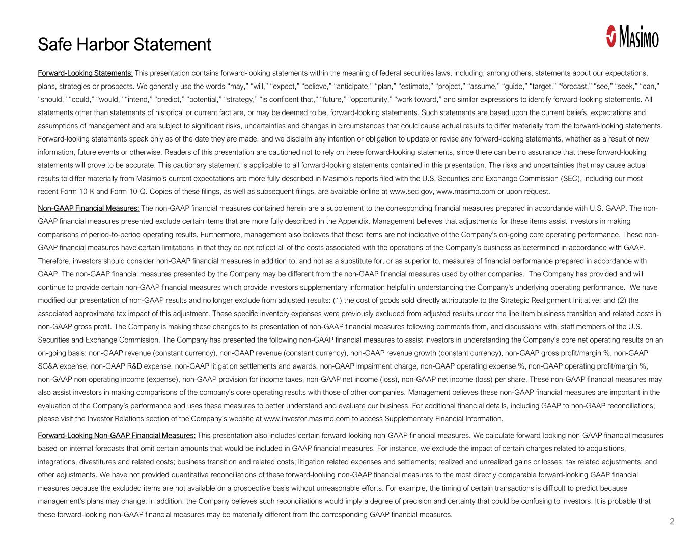 Safe Harbor Statement Forward-Looking Statements: This presentation contains forward-looking statements within the meaning of federal securities laws, including, among others, statements about our expectations, plans, strategies or prospects. We generally use the words “may,” “will,” “expect,” “believe,” “anticipate,” “plan,” “estimate,” “project,” “assume,” “guide,” “target,” “forecast,” “see,” “seek,” “can,” “should,” “could,” “would,” “intend,” “predict,” “potential,” “strategy,” “is confident that,” “future,” “opportunity,” “work toward,” and similar expressions to identify forward-looking statements. All statements other than statements of historical or current fact are, or may be deemed to be, forward-looking statements. Such statements are based upon the current beliefs, expectations and assumptions of management and are subject to significant risks, uncertainties and changes in circumstances that could cause actual results to differ materially from the forward-looking statements. Forward-looking statements speak only as of the date they are made, and we disclaim any intention or obligation to update or revise any forward-looking statements, whether as a result of new information, future events or otherwise. Readers of this presentation are cautioned not to rely on these forward-looking statements, since there can be no assurance that these forward-looking statements will prove to be accurate. This cautionary statement is applicable to all forward-looking statements contained in this presentation. The risks and uncertainties that may cause actual results to differ materially from Masimo’s current expectations are more fully described in Masimo’s reports filed with the U.S. Securities and Exchange Commission (SEC), including our most recent Form 10-K and Form 10-Q. Copies of these filings, as well as subsequent filings, are available online at www.sec.gov, www.masimo.com or upon request. Non-GAAP Financial Measures: The non-GAAP financial measures contained herein are a supplement to the corresponding financial measures prepared in accordance with U.S. GAAP. The non- GAAP financial measures presented exclude certain items that are more fully described in the Appendix. Management believes that adjustments for these items assist investors in making comparisons of period-to-period operating results. Furthermore, management also believes that these items are not indicative of the Company’s on-going core operating performance. These non- GAAP financial measures have certain limitations in that they do not reflect all of the costs associated with the operations of the Company’s business as determined in accordance with GAAP. Therefore, investors should consider non-GAAP financial measures in addition to, and not as a substitute for, or as superior to, measures of financial performance prepared in accordance with GAAP. The non-GAAP financial measures presented by the Company may be different from the non-GAAP financial measures used by other companies. The Company has provided and will continue to provide certain non-GAAP financial measures which provide investors supplementary information helpful in understanding the Company’s underlying operating performance. We have modified our presentation of non-GAAP results and no longer exclude from adjusted results: (1) the cost of goods sold directly attributable to the Strategic Realignment Initiative; and (2) the associated approximate tax impact of this adjustment. These specific inventory expenses were previously excluded from adjusted results under the line item business transition and related costs in non-GAAP gross profit. The Company is making these changes to its presentation of non-GAAP financial measures following comments from, and discussions with, staff members of the U.S. Securities and Exchange Commission. The Company has presented the following non-GAAP financial measures to assist investors in understanding the Company’s core net operating results on an on-going basis: non-GAAP revenue (constant currency), non-GAAP revenue (constant currency), non-GAAP revenue growth (constant currency), non-GAAP gross profit/margin %, non-GAAP SG&A expense, non-GAAP R&D expense, non-GAAP litigation settlements and awards, non-GAAP impairment charge, non-GAAP operating expense %, non-GAAP operating profit/margin %, non-GAAP non-operating income (expense), non-GAAP provision for income taxes, non-GAAP net income (loss), non-GAAP net income (loss) per share. These non-GAAP financial measures may also assist investors in making comparisons of the company’s core operating results with those of other companies. Management believes these non-GAAP financial measures are important in the evaluation of the Company’s performance and uses these measures to better understand and evaluate our business. For additional financial details, including GAAP to non-GAAP reconciliations, please visit the Investor Relations section of the Company’s website at www.investor.masimo.com to access Supplementary Financial Information. Forward-Looking Non-GAAP Financial Measures: This presentation also includes certain forward-looking non-GAAP financial measures. We calculate forward-looking non-GAAP financial measures based on internal forecasts that omit certain amounts that would be included in GAAP financial measures. For instance, we exclude the impact of certain charges related to acquisitions, integrations, divestitures and related costs; business transition and related costs; litigation related expenses and settlements; realized and unrealized gains or losses; tax related adjustments; and other adjustments. We have not provided quantitative reconciliations of these forward-looking non-GAAP financial measures to the most directly comparable forward-looking GAAP financial measures because the excluded items are not available on a prospective basis 