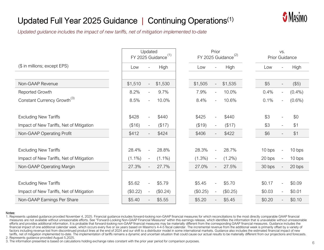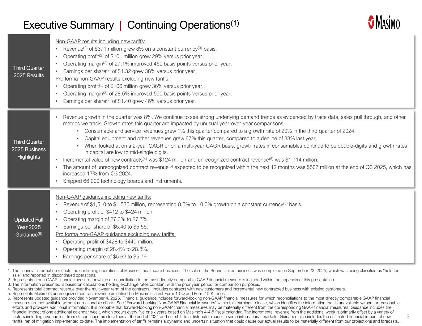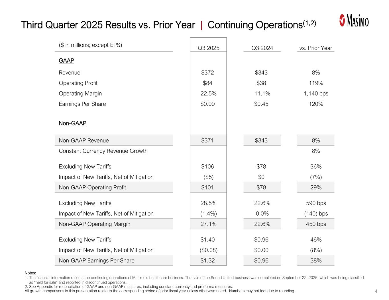 Executive Summary | Continuing Operations(1) Third Quarter 2025 Results Non-GAAP results including new tariffs: • Revenue(2) of $371 million grew 8% on a constant currency(3) basis. • Operating profit(2) of $101 million grew 29% versus prior year. • Operating margin(2) of 27.1% improved 450 basis points versus prior year. • Earnings per share(2) of $1.32 grew 38% versus prior year. Pro forma non-GAAP results excluding new tariffs: • Operating profit(2) of $106 million grew 36% versus prior year. • Operating margin(2) of 28.5% improved 590 basis points versus prior year. • Earnings per share(2) of $1.40 grew 46% versus prior year. 3 1. The financial information reflects the continuing operations of Masimo’s healthcare business. The sale of the Sound United business was completed on September 22, 2025; which was being classified as “held for sale” and reported in discontinued operations. 2. Represents a non-GAAP financial measure for which a reconciliation to the most directly comparable GAAP financial measure is included within the appendix of this presentation. 3. The information presented is based on calculations holding exchange rates constant with the prior year period for comparison purposes. 4. Represents total contract revenue over the multi-year term of the contracts. Includes contracts with new customers and incremental new contracted business with existing customers. 5. Represents Masimo’s unrecognized contract revenue as defined in Masimo’s latest Form 10-Q and Form 10-K filings. 6. Represents updated guidance provided November 4, 2025. Financial guidance includes forward-looking non-GAAP financial measures for which reconciliations to the most directly comparable GAAP financial measures are not available without unreasonable efforts. See “Forward-Looking Non-GAAP Financial Measures" within this earnings release, which identifies the information that is unavailable without unreasonable efforts and provides additional information. It is probable that forward-looking non-GAAP financial measures may be materially different from the corresponding GAAP financial measures. Guidance includes the financial impact of one additional calendar week, which occurs every five or six years based on Masimo’s 4-4-5 fiscal calendar. The incremental revenue from the additional week is primarily offset by a variety of factors including revenue lost from discontinued product lines at the end of 2024 and our shift to a distributor model in some international markets. Guidance also includes the estimated financial impact of new tariffs, net of mitigation implemented to-date. The implementation of tariffs remains a dynamic and uncertain situation that could cause our actual results to be materially different from our projections and forecasts. Updated Full Year 2025 Guidance(6) Non-GAAP guidance including new tariffs: • Revenue of $1,510 to $1,530 million, representing 8.5% to 10.0% growth on a constant currency(3) basis. • Operating profit of $412 to $424 million. • Operating margin of 27.3% to 27.7%. • Earnings per share of $5.40 to $5.55. Pro forma non-GAAP guidance excluding new tariffs: • Operating profit of $428 to $440 million. • Operating margin of 28.4% to 28.8%. • Earnings per share of $5.62 to $5.79. Third Quarter 2025 Business Highlights • Revenue growth in the quarter was 8%. We continue to see strong underlying demand trends as evidenced by trace data, sales pull through, and other metrics we track. Growth rates this quarter are impacted by unusual year-over-year comparisons. • Consumable and service revenues grew 1% this quarter compared to a growth rate of 20% in the third quarter of 2024. • Capital equipment and other revenues grew 67% this quarter, compared to a decline of 33% last year. • When looked at on a 2-year CAGR or on a multi-year CAGR basis, growth rates in consumables continue to be double-digits and growth rates in capital are low to mid-single digits. • Incremental value of new contracts(4) was $124 million and unrecognized contract revenue(5) was $1,714 million. • The amount of unrecognized contract revenue(5) expected to be recognized within the next 12 months was $507 million at the end of Q3 2025, which has increased 17% from Q3 2024. • Shipped 66,000 technology boards and instruments.