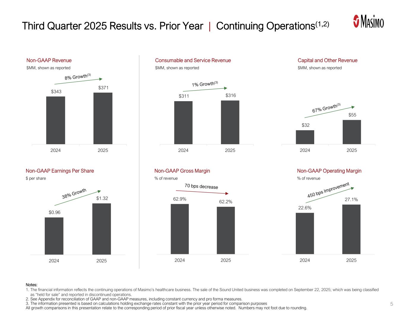 ($ in millions; except EPS) GAAP Revenue $372 $343 8% Operating Profit $84 $38 119% Operating Margin 22.5% 11.1% 1,140 bps Earnings Per Share $0.99 $0.45 120% Non-GAAP Non-GAAP Revenue $371 $343 8% Constant Currency Revenue Growth 8% Excluding New Tariffs $106 $78 36% Impact of New Tariffs, Net of Mitigation ($5) $0 (7%) Non-GAAP Operating Profit $101 $78 29% Excluding New Tariffs 28.5% 22.6% 590 bps Impact of New Tariffs, Net of Mitigation (1.4%) 0.0% (140) bps Non-GAAP Operating Margin 27.1% 22.6% 450 bps Excluding New Tariffs $1.40 $0.96 46% Impact of New Tariffs, Net of Mitigation ($0.08) $0.00 (8%) Non-GAAP Earnings Per Share $1.32 $0.96 38% vs. Prior YearQ3 2025 Q3 2024 Third Quarter 2025 Results vs. Prior Year | Continuing Operations(1,2) Notes: 1. The financial information reflects the continuing operations of Masimo’s healthcare business. The sale of the Sound United business was completed on September 22, 2025; which was being classified as “held for sale” and reported in discontinued operations. 2. See Appendix for reconciliation of GAAP and non-GAAP measures, including constant currency and pro forma measures. All growth comparisons in this presentation relate to the corresponding period of prior fiscal year unless otherwise noted. Numbers may not foot due to rounding. 4