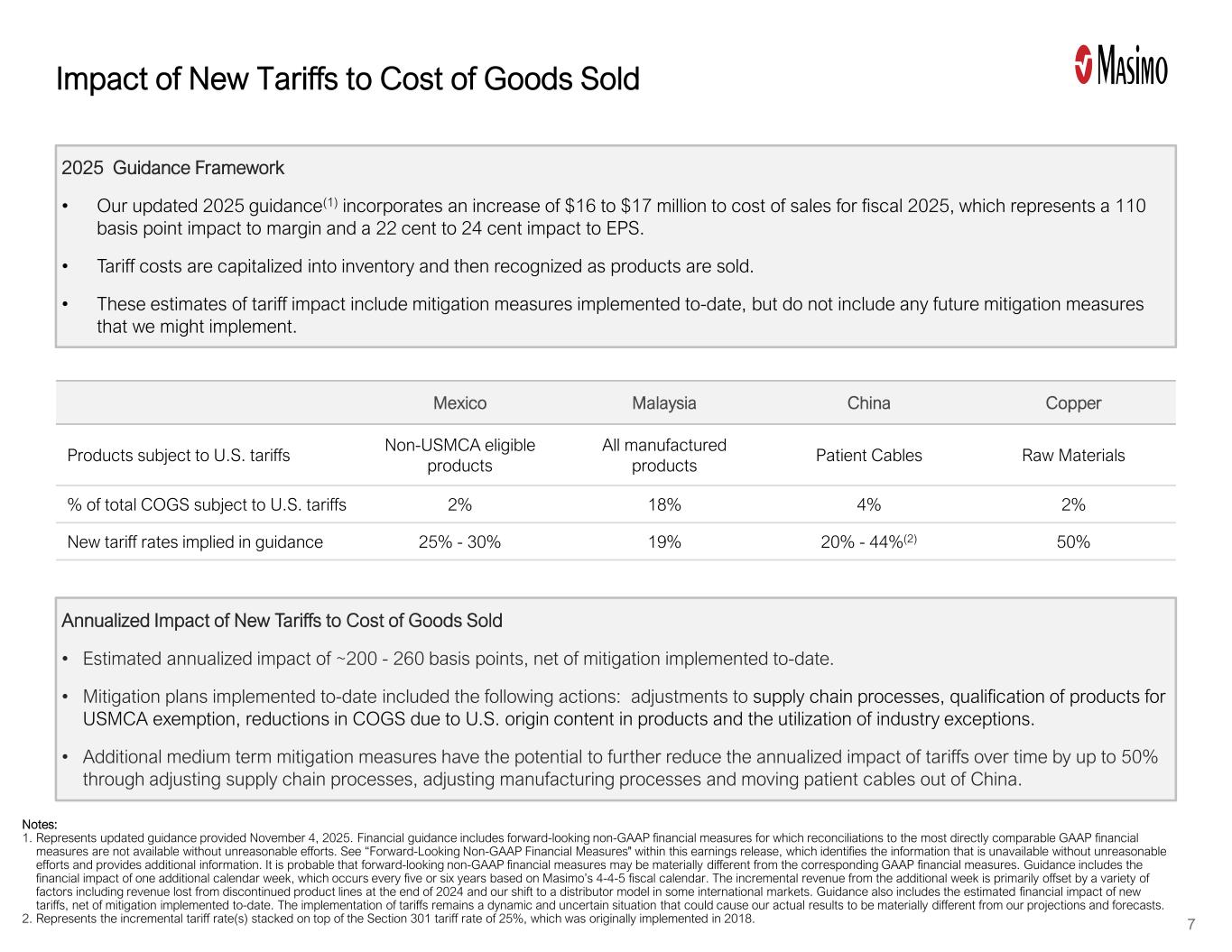 ($ in millions; except EPS) Low - High Low - High Low - High Non-GAAP Revenue $1,510 - $1,530 $1,505 - $1,535 $5 - ($5) Reported Growth 8.2% - 9.7% 7.9% - 10.0% 0.4% - (0.4%) Constant Currency Growth 8.5% - 10.0% 8.4% - 10.6% 0.1% - (0.6%) Excluding New Tariffs $428 - $440 $425 - $440 $3 - $0 Impact of New Tariffs, Net of Mitigation ($16) - ($17) ($19) - ($17) $3 - $1 Non-GAAP Operating Profit $412 - $424 $406 - $422 $6 - $1 Excluding New Tariffs 28.4% - 28.8% 28.3% - 28.7% 10 bps - 10 bps Impact of New Tariffs, Net of Mitigation (1.1%) - (1.1%) (1.3%) - (1.2%) 20 bps - 10 bps Non-GAAP Operating Margin 27.3% - 27.7% 27.0% - 27.5% 30 bps - 20 bps Excluding New Tariffs $5.62 - $5.79 $5.45 - $5.70 $0.17 - $0.09 Impact of New Tariffs, Net of Mitigation ($0.22) - ($0.24) ($0.25) - ($0.25) $0.03 - $0.01 Non-GAAP Earnings Per Share $5.40 - $5.55 $5.20 - $5.45 $0.20 - $0.10 Updated FY 2025 Guidance Prior FY 2025 Guidance vs. Prior Guidance 6 Updated guidance includes the impact of new tariffs, net of mitigation implemented to-date Notes: 1. Represents updated guidance provided November 4, 2025. Financial guidance includes forward-looking non-GAAP financial measures for which reconciliations to the most directly comparable GAAP financial measures are not available without unreasonable efforts. See “Forward-Looking Non-GAAP Financial Measures" within this earnings release, which identifies the information that is unavailable without unreasonable efforts and provides additional information. It is probable that forward-looking non-GAAP financial measures may be materially different from the corresponding GAAP financial measures. Guidance includes the financial impact of one additional calendar week, which occurs every five or six years based on Masimo’s 4-4-5 fiscal calendar. The incremental revenue from the additional week is primarily offset by a variety of factors including revenue lost from discontinued product lines at the end of 2024 and our shift to a distributor model in some international markets. Guidance also includes the estimated financial impact of new tariffs, net of mitigation implemented to-date. The implementation of tariffs remains a dynamic and uncertain situation that could cause our actual results to be materially different from our projections and forecasts. 2. Represents guidance provided August 5,2025. 3. The information presented is based on calculations holding exchange rates constant with the prior year period for comparison purposes. (1) (2) Updated Full Year 2025 Guidance | Continuing Operations(1) (3)