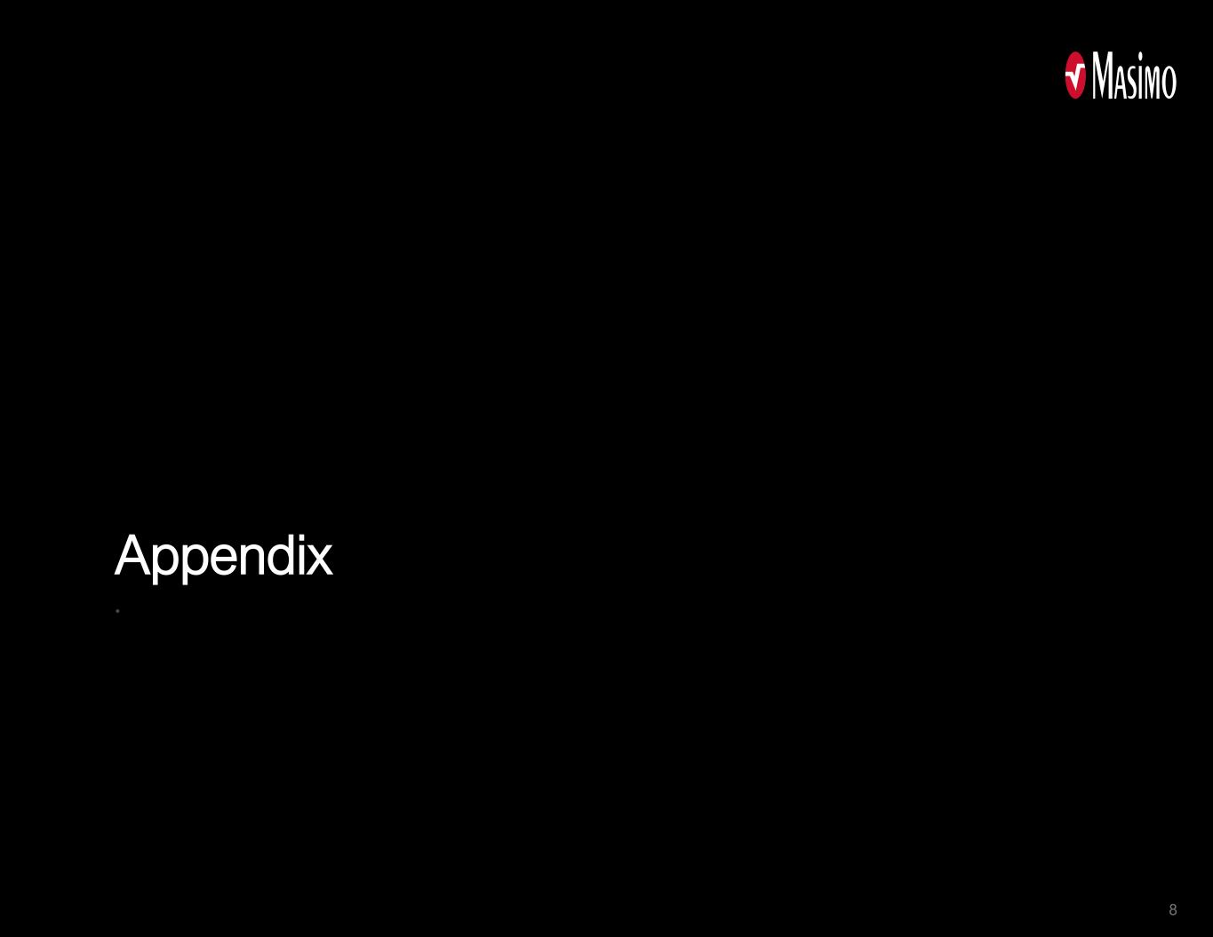7 Notes: 1. Represents updated guidance provided November 4, 2025. Financial guidance includes forward-looking non-GAAP financial measures for which reconciliations to the most directly comparable GAAP financial measures are not available without unreasonable efforts. See “Forward-Looking Non-GAAP Financial Measures" within this earnings release, which identifies the information that is unavailable without unreasonable efforts and provides additional information. It is probable that forward-looking non-GAAP financial measures may be materially different from the corresponding GAAP financial measures. Guidance includes the financial impact of one additional calendar week, which occurs every five or six years based on Masimo’s 4-4-5 fiscal calendar. The incremental revenue from the additional week is primarily offset by a variety of factors including revenue lost from discontinued product lines at the end of 2024 and our shift to a distributor model in some international markets. Guidance also includes the estimated financial impact of new tariffs, net of mitigation implemented to-date. The implementation of tariffs remains a dynamic and uncertain situation that could cause our actual results to be materially different from our projections and forecasts. 2. Represents the incremental tariff rate(s) stacked on top of the Section 301 tariff rate of 25%, which was originally implemented in 2018. Impact of New Tariffs to Cost of Goods Sold Mexico Malaysia China Copper Products subject to U.S. tariffs Non-USMCA eligible products All manufactured products Patient Cables Raw Materials % of total COGS subject to U.S. tariffs 2% 18% 4% 2% New tariff rates implied in guidance 25% - 30% 19% 20% - 44%(2) 50% 2025 Guidance Framework • Our updated 2025 guidance(1) incorporates an increase of $16 to $17 million to cost of sales for fiscal 2025, which represents a 110 basis point impact to margin and a 22 cent to 24 cent impact to EPS. • Tariff costs are capitalized into inventory and then recognized as products are sold. • These estimates of tariff impact include mitigation measures implemented to-date, but do not include any future mitigation measures that we might implement. Annualized Impact of New Tariffs to Cost of Goods Sold • Estimated annualized impact of ~200 - 260 basis points, net of mitigation implemented to-date. • Mitigation plans implemented to-date included the following actions: adjustments to supply chain processes, qualification of products for USMCA exemption, reductions in COGS due to U.S. origin content in products and the utilization of industry exceptions. • Additional medium term mitigation measures have the potential to further reduce the annualized impact of tariffs over time by up to 50% through adjusting supply chain processes, adjusting manufacturing processes and moving patient cables out of China.