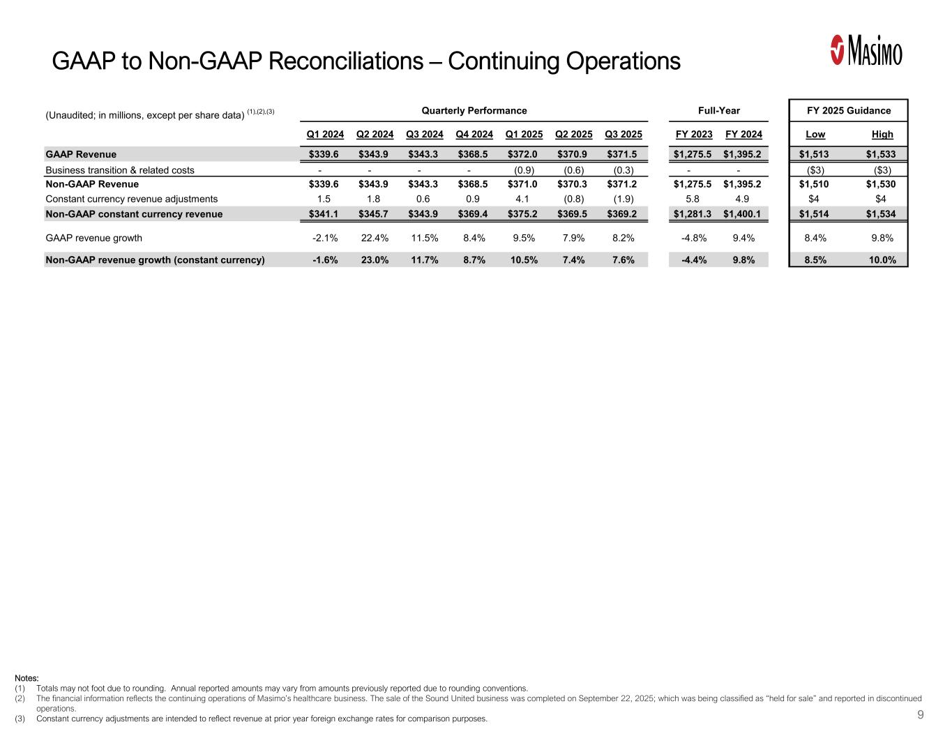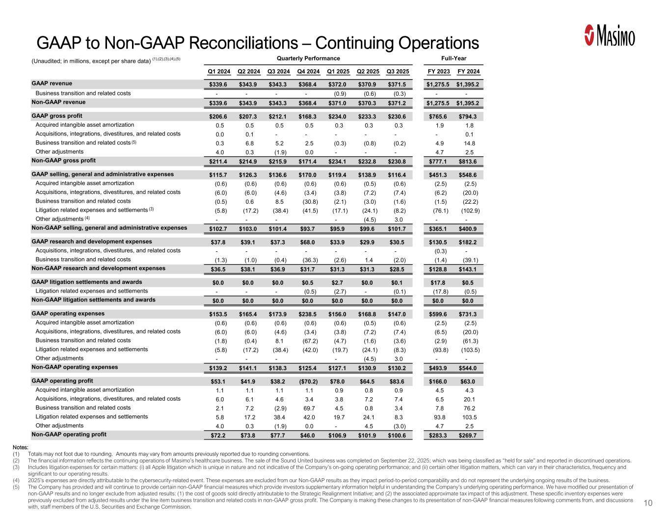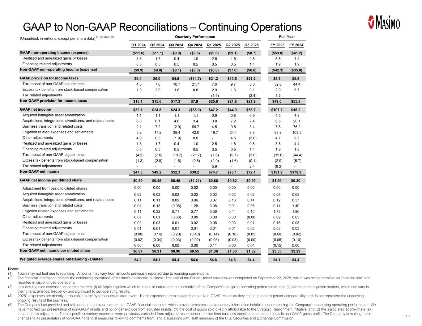 (Unaudited; in millions, except per share data) (1),(2),(3),(4),(5) Quarterly Performance Full-Year Q1 2024 Q2 2024 Q3 2024 Q4 2024 Q1 2025 Q2 2025 Q3 2025 FY 2023 FY 2024 GAAP revenue $339.6 $343.9 $343.3 $368.4 $372.0 $370.9 $371.5 $1,275.5 $1,395.2 Business transition and related costs - - - - (0.9) (0.6) (0.3) - - Non-GAAP revenue $339.6 $343.9 $343.3 $368.4 $371.0 $370.3 $371.2 $1,275.5 $1,395.2 GAAP gross profit $206.6 $207.3 $212.1 $168.3 $234.0 $233.3 $230.6 $765.6 $794.3 Acquired intangible asset amortization 0.5 0.5 0.5 0.5 0.3 0.3 0.3 1.9 1.8 Acquisitions, integrations, divestitures, and related costs 0.0 0.1 - - - - - - 0.1 Business transition and related costs 0.3 6.8 5.2 2.5 (0.3) (0.8) (0.2) 4.9 14.8 Other adjustments 4.0 0.3 (1.9) 0.0 - - - 4.7 2.5 Non-GAAP gross profit $211.4 $214.9 $215.9 $171.4 $234.1 $232.8 $230.8 $777.1 $813.6 GAAP selling, general and administrative expenses $115.7 $126.3 $136.6 $170.0 $119.4 $138.9 $116.4 $451.3 $548.6 Acquired intangible asset amortization (0.6) (0.6) (0.6) (0.6) (0.6) (0.5) (0.6) (2.5) (2.5) Acquisitions, integrations, divestitures, and related costs (6.0) (6.0) (4.6) (3.4) (3.8) (7.2) (7.4) (6.2) (20.0) Business transition and related costs (0.5) 0.6 8.5 (30.8) (2.1) (3.0) (1.6) (1.5) (22.2) Litigation related expenses and settlements (5.8) (17.2) (38.4) (41.5) (17.1) (24.1) (8.2) (76.1) (102.9) Other adjustments - - - - (4.5) 3.0 - - Non-GAAP selling, general and administrative expenses $102.7 $103.0 $101.4 $93.7 $95.9 $99.6 $101.7 $365.1 $400.9 GAAP research and development expenses $37.8 $39.1 $37.3 $68.0 $33.9 $29.9 $30.5 $130.5 $182.2 Acquisitions, integrations, divestitures, and related costs - - - - - - - (0.3) - Business transition and related costs (1.3) (1.0) (0.4) (36.3) (2.6) 1.4 (2.0) (1.4) (39.1) Non-GAAP research and development expenses $36.5 $38.1 $36.9 $31.7 $31.3 $31.3 $28.5 $128.8 $143.1 GAAP litigation settlements and awards $0.0 $0.0 $0.0 $0.5 $2.7 $0.0 $0.1 $17.8 $0.5 Litigation related expenses and settlements - - - (0.5) (2.7) - (0.1) (17.8) (0.5) Non-GAAP litigation settlements and awards $0.0 $0.0 $0.0 $0.0 $0.0 $0.0 $0.0 $0.0 $0.0 GAAP operating expenses $153.5 $165.4 $173.9 $238.5 $156.0 $168.8 $147.0 $599.6 $731.3 Acquired intangible asset amortization (0.6) (0.6) (0.6) (0.6) (0.6) (0.5) (0.6) (2.5) (2.5) Acquisitions, integrations, divestitures, and related costs (6.0) (6.0) (4.6) (3.4) (3.8) (7.2) (7.4) (6.5) (20.0) Business transition and related costs (1.8) (0.4) 8.1 (67.2) (4.7) (1.6) (3.6) (2.9) (61.3) Litigation related expenses and settlements (5.8) (17.2) (38.4) (42.0) (19.7) (24.1) (8.3) (93.8) (103.5) Other adjustments - - - - (4.5) 3.0 - - Non-GAAP operating expenses $139.2 $141.1 $138.3 $125.4 $127.1 $130.9 $130.2 $493.9 $544.0 GAAP operating profit $53.1 $41.9 $38.2 ($70.2) $78.0 $64.5 $83.6 $166.0 $63.0 Acquired intangible asset amortization 1.1 1.1 1.1 1.1 0.9 0.8 0.9 4.5 4.3 Acquisitions, integrations, divestitures, and related costs 6.0 6.1 4.6 3.4 3.8 7.2 7.4 6.5 20.1 Business transition and related costs 2.1 7.2 (2.9) 69.7 4.5 0.8 3.4 7.8 76.2 Litigation related expenses and settlements 5.8 17.2 38.4 42.0 19.7 24.1 8.3 93.8 103.5 Other adjustments 4.0 0.3 (1.9) 0.0 - 4.5 (3.0) 4.7 2.5 Non-GAAP operating profit $72.2 $73.8 $77.7 $46.0 $106.9 $101.9 $100.6 $283.3 $269.7 GAAP to Non-GAAP Reconciliations – Continuing Operations Notes: (1) Totals may not foot due to rounding. Amounts may vary from amounts previously reported due to rounding conventions. (2) The financial information reflects the continuing operations of Masimo’s healthcare business. The sale of the Sound United business was completed on September 22, 2025; which was being classified as “held for sale” and reported in discontinued operations. (3) Includes litigation expenses for certain matters: (i) all Apple litigation which is unique in nature and not indicative of the Company’s on-going operating performance; and (ii) certain other litigation matters, which can vary in their characteristics, frequency and significant to our operating results. (4) 2025’s expenses are directly attributable to the cybersecurity-related event. These expenses are excluded from our Non-GAAP results as they impact period-to-period comparability and do not represent the underlying ongoing results of the business. (5) The Company has provided and will continue to provide certain non-GAAP financial measures which provide investors supplementary information helpful in understanding the Company’s underlying operating performance. We have modified our presentation of non-GAAP results and no longer exclude from adjusted results: (1) the cost of goods sold directly attributable to the Strategic Realignment Initiative; and (2) the associated approximate tax impact of this adjustment. These specific inventory expenses were previously excluded from adjusted results under the line item business transition and related costs in non-GAAP gross profit. The Company is making these changes to its presentation of non-GAAP financial measures following comments from, and discussions with, staff members of the U.S. Securities and Exchange Commission. 10 (3) (4) (5)