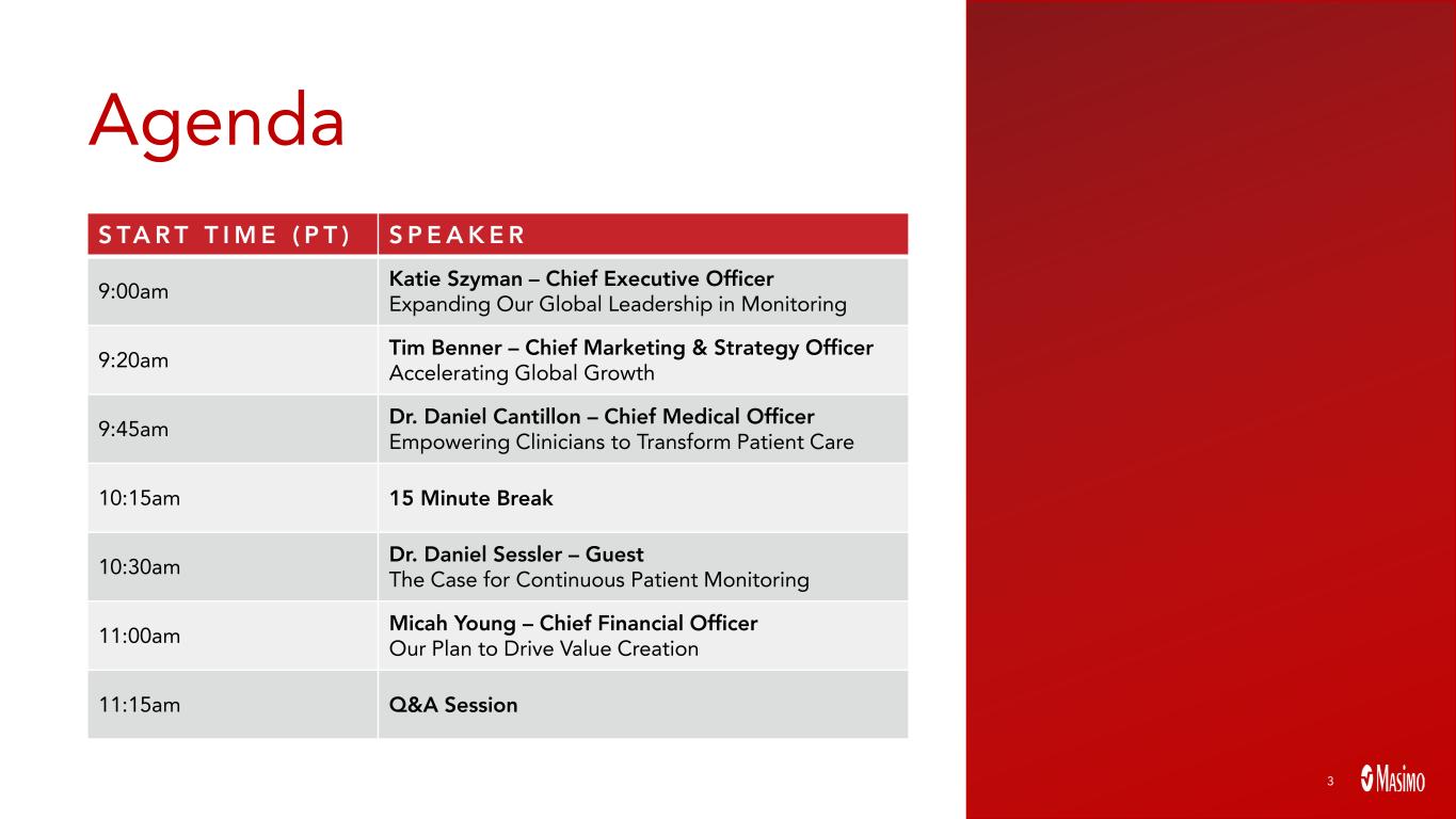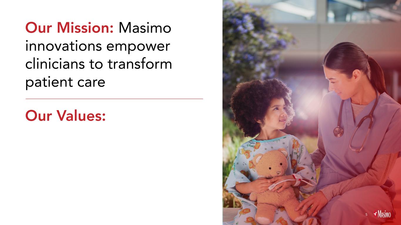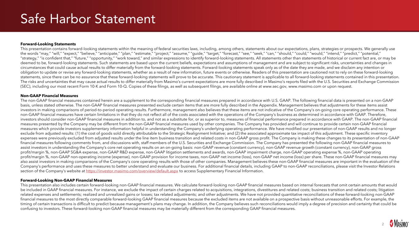 Safe Harbor Statement Forward-Looking Statements This presentation contains forward-looking statements within the meaning of federal securities laws, including, among others, statements about our expectations, plans, strategies or prospects. We generally use the words “may,” “will,” “expect,” “believe,” “anticipate,” “plan,” “estimate,” “project,” “assume,” “guide,” “target,” “forecast,” “see,” “seek,” “can,” “should,” “could,” “would,” “intend,” “predict,” “potential,” “strategy,” “is confident that,” “future,” “opportunity,” “work toward,” and similar expressions to identify forward-looking statements. All statements other than statements of historical or current fact are, or may be deemed to be, forward-looking statements. Such statements are based upon the current beliefs, expectations and assumptions of management and are subject to significant risks, uncertainties and changes in circumstances that could cause actual results to differ materially from the forward-looking statements. Forward-looking statements speak only as of the date they are made, and we disclaim any intention or obligation to update or revise any forward-looking statements, whether as a result of new information, future events or otherwise. Readers of this presentation are cautioned not to rely on these forward-looking statements, since there can be no assurance that these forward-looking statements will prove to be accurate. This cautionary statement is applicable to all forward-looking statements contained in this presentation. The risks and uncertainties that may cause actual results to differ materially from Masimo’s current expectations are more fully described in Masimo’s reports filed with the U.S. Securities and Exchange Commission (SEC), including our most recent Form 10-K and Form 10-Q. Copies of these filings, as well as subsequent filings, are available online at www.sec.gov, www.masimo.com or upon request. Non-GAAP Financial Measures The non-GAAP financial measures contained herein are a supplement to the corresponding financial measures prepared in accordance with U.S. GAAP. The following financial data is presented on a non-GAAP basis, unless stated otherwise. The non-GAAP financial measures presented exclude certain items that are more fully described in the Appendix. Management believes that adjustments for these items assist investors in making comparisons of period-to-period operating results. Furthermore, management also believes that these items are not indicative of the Company’s on-going core operating performance. These non-GAAP financial measures have certain limitations in that they do not reflect all of the costs associated with the operations of the Company’s business as determined in accordance with GAAP. Therefore, investors should consider non-GAAP financial measures in addition to, and not as a substitute for, or as superior to, measures of financial performance prepared in accordance with GAAP. The non-GAAP financial measures presented by the Company may be different from the non-GAAP financial measures used by other companies. The Company has provided and will continue to provide certain non-GAAP financial measures which provide investors supplementary information helpful in understanding the Company’s underlying operating performance. We have modified our presentation of non-GAAP results and no longer exclude from adjusted results: (1) the cost of goods sold directly attributable to the Strategic Realignment Initiative; and (2) the associated approximate tax impact of this adjustment. These specific inventory expenses were previously excluded from adjusted results under the line item business transition and related costs in non-GAAP gross profit. The Company is making these changes to its presentation of non-GAAP financial measures following comments from, and discussions with, staff members of the U.S. Securities and Exchange Commission. The Company has presented the following non-GAAP financial measures to assist investors in understanding the Company’s core net operating results on an on-going basis: non-GAAP revenue (constant currency), non-GAAP revenue growth (constant currency), non-GAAP gross profit/margin %, non-GAAP SG&A expense, non-GAAP R&D expense, non-GAAP litigation settlements and awards, non-GAAP impairment charge, non-GAAP operating expense %, non-GAAP operating profit/margin %, non-GAAP non-operating income (expense), non-GAAP provision for income taxes, non-GAAP net income (loss), non-GAAP net income (loss) per share. These non-GAAP financial measures may also assist investors in making comparisons of the Company’s core operating results with those of other companies. Management believes these non-GAAP financial measures are important in the evaluation of the Company’s performance and uses these measures to better understand and evaluate our business. For additional financial details, including GAAP to non-GAAP reconciliations, please visit the Investor Relations section of the Company’s website at https://investor.masimo.com/overview/default.aspx to access Supplementary Financial Information. Forward-Looking Non-GAAP Financial Measures This presentation also includes certain forward-looking non-GAAP financial measures. We calculate forward-looking non-GAAP financial measures based on internal forecasts that omit certain amounts that would be included in GAAP financial measures. For instance, we exclude the impact of certain charges related to acquisitions, integrations, divestitures and related costs; business transition and related costs; litigation related expenses and settlements; realized and unrealized gains or losses; tax related adjustments; and other adjustments. We have not provided quantitative reconciliations of these forward-looking non-GAAP financial measures to the most directly comparable forward-looking GAAP financial measur