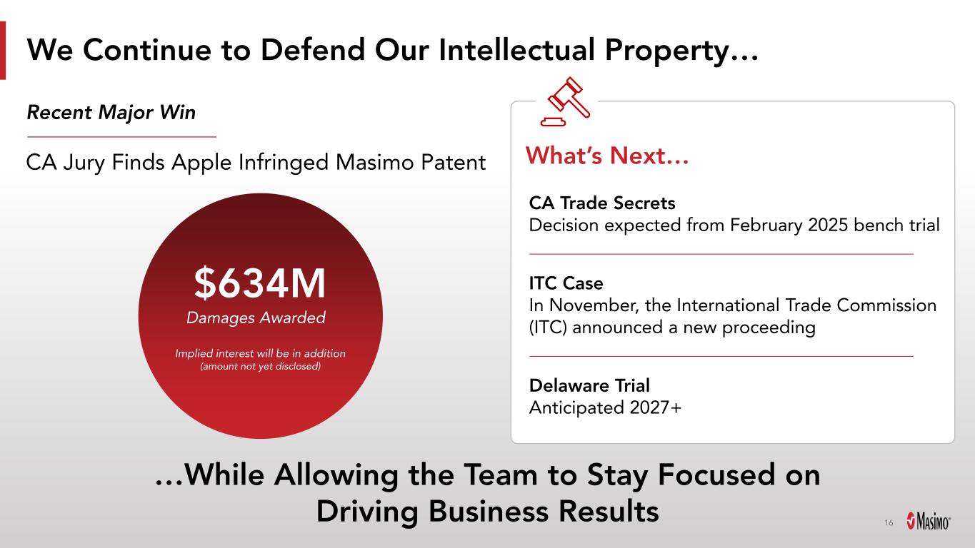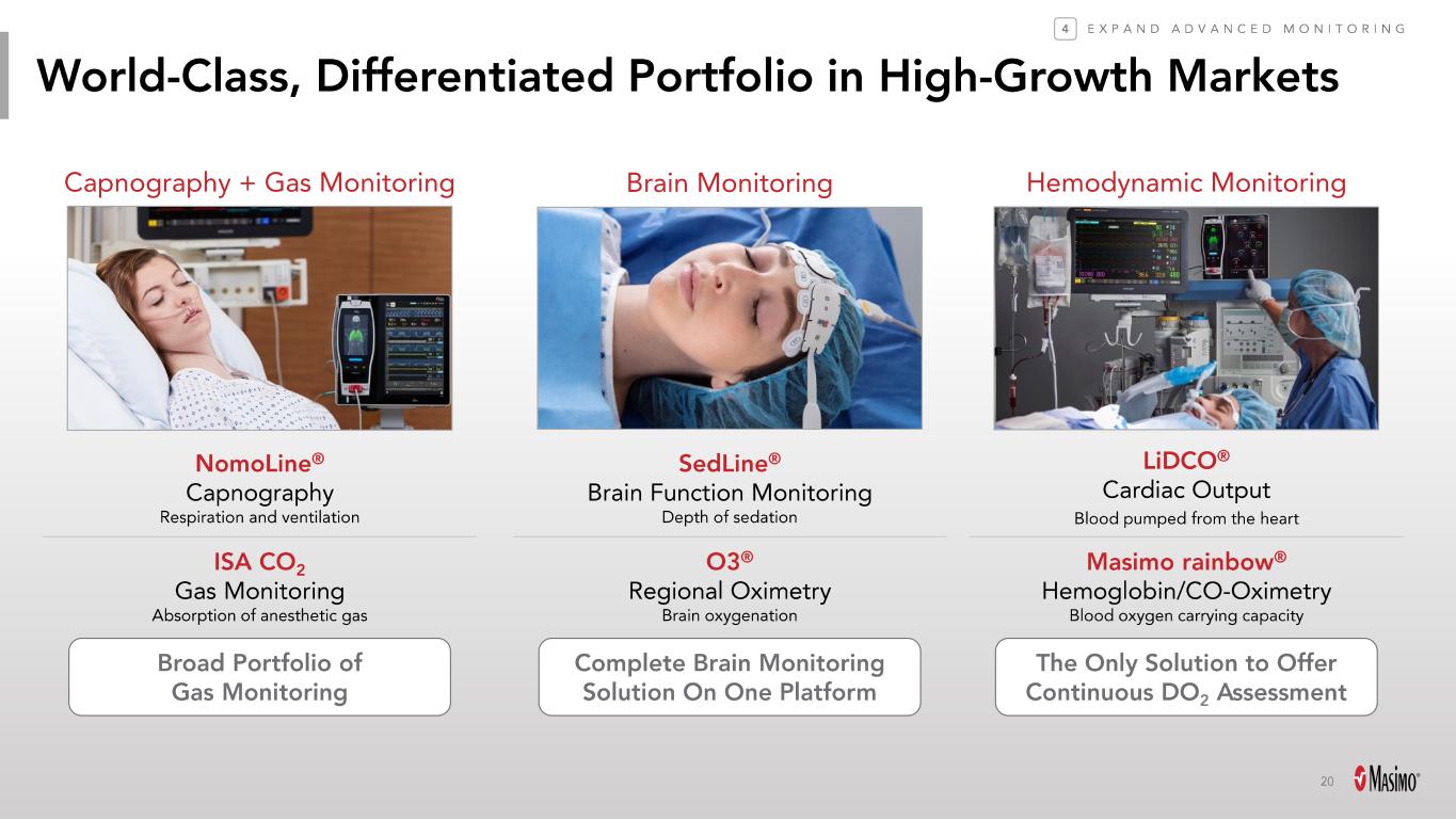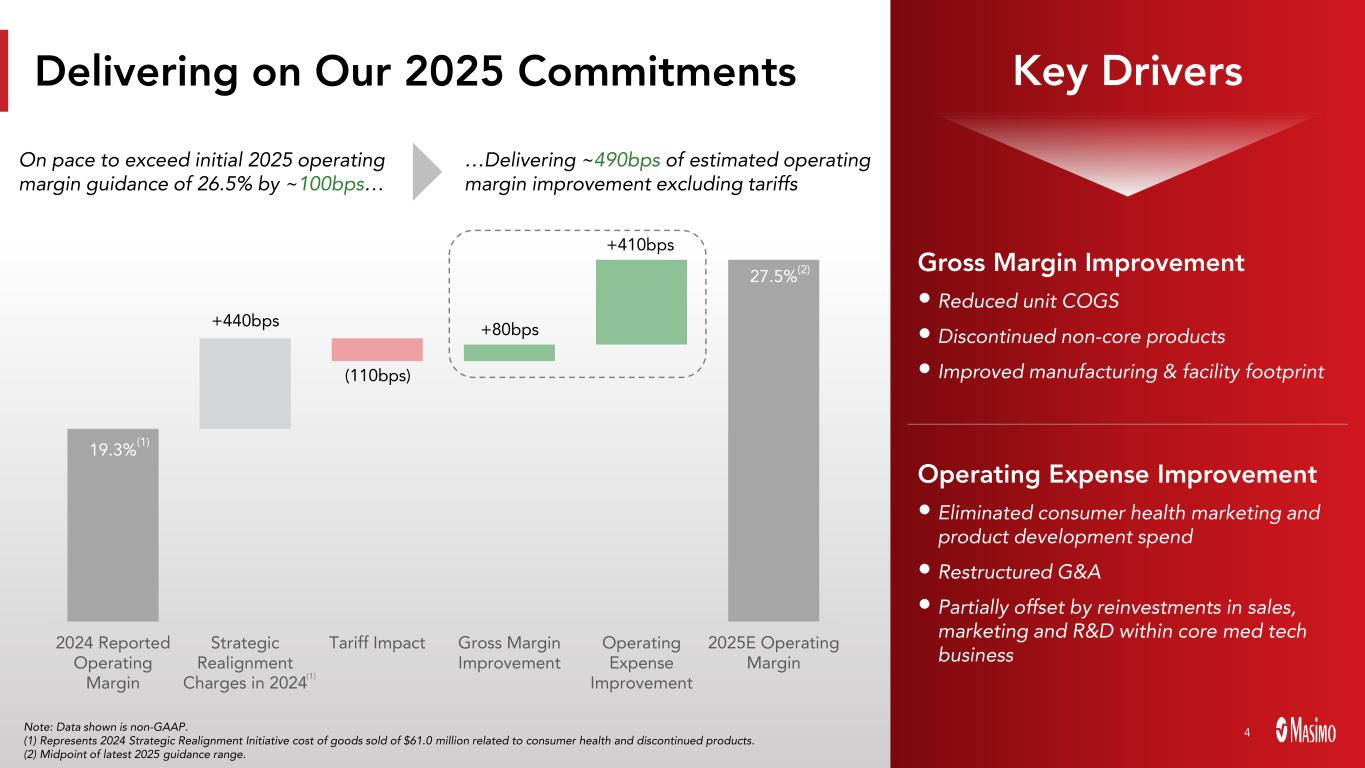 Safe Harbor Statement Forward-Looking Statements This presentation contains forward-looking statements within the meaning of federal securities laws, including, among others, statements about our expectations, plans, strategies or prospects. We generally use the words “may,” “will,” “expect,” “believe,” “anticipate,” “plan,” “estimate,” “project,” “assume,” “guide,” “target,” “forecast,” “see,” “seek,” “can,” “should,” “could,” “would,” “intend,” “predict,” “potential,” “strategy,” “is confident that,” “future,” “opportunity,” “work toward,” and similar expressions to identify forward-looking statements. All statements other than statements of historical or current fact are, or may be deemed to be, forward-looking statements. Such statements are based upon the current beliefs, expectations and assumptions of management and are subject to significant risks, uncertainties and changes in circumstances that could cause actual results to differ materially from the forward-looking statements. Forward-looking statements speak only as of the date they are made, and we disclaim any intention or obligation to update or revise any forward-looking statements, whether as a result of new information, future events or otherwise. Readers of this presentation are cautioned not to rely on these forward-looking statements, since there can be no assurance that these forward-looking statements will prove to be accurate. This cautionary statement is applicable to all forward-looking statements contained in this presentation. The risks and uncertainties that may cause actual results to differ materially from Masimo’s current expectations are more fully described in Masimo’s reports filed with the U.S. Securities and Exchange Commission (SEC), including our most recent Form 10-K and Form 10-Q. Copies of these filings, as well as subsequent filings, are available online at www.sec.gov, www.masimo.com or upon request. Non-GAAP Financial Measures The non-GAAP financial measures contained herein are a supplement to the corresponding financial measures prepared in accordance with U.S. GAAP. The following financial data is presented on a non-GAAP basis, unless stated otherwise. The non-GAAP financial measures presented exclude certain items that are more fully described in the Appendix. Management believes that adjustments for these items assist investors in making comparisons of period-to-period operating results. Furthermore, management also believes that these items are not indicative of the Company’s on-going core operating performance. These non-GAAP financial measures have certain limitations in that they do not reflect all of the costs associated with the operations of the Company’s business as determined in accordance with GAAP. Therefore, investors should consider non-GAAP financial measures in addition to, and not as a substitute for, or as superior to, measures of financial performance prepared in accordance with GAAP. The non-GAAP financial measures presented by the Company may be different from the non-GAAP financial measures used by other companies. The Company has provided and will continue to provide certain non-GAAP financial measures which provide investors supplementary information helpful in understanding the Company’s underlying operating performance. We have modified our presentation of non-GAAP results and no longer exclude from adjusted results: (1) the cost of goods sold directly attributable to the Strategic Realignment Initiative; and (2) the associated approximate tax impact of this adjustment. These specific inventory expenses were previously excluded from adjusted results under the line item business transition and related costs in non-GAAP gross profit. The Company is making these changes to its presentation of non-GAAP financial measures following comments from, and discussions with, staff members of the U.S. Securities and Exchange Commission. The Company has presented the following non-GAAP financial measures to assist investors in understanding the Company’s core net operating results on an on-going basis: non-GAAP revenue (constant currency), non-GAAP revenue growth (constant currency), non-GAAP gross profit/margin %, non-GAAP SG&A expense, non-GAAP R&D expense, non-GAAP litigation settlements and awards, non-GAAP impairment charge, non-GAAP operating expense %, non-GAAP operating profit/margin %, non-GAAP non-operating income (expense), non-GAAP provision for income taxes, non-GAAP net income (loss), non-GAAP net income (loss) per share. These non-GAAP financial measures may also assist investors in making comparisons of the Company’s core operating results with those of other companies. Management believes these non-GAAP financial measures are important in the evaluation of the Company’s performance and uses these measures to better understand and evaluate our business. For additional financial details, including GAAP to non-GAAP reconciliations, please visit the Investor Relations section of the Company’s website at https://investor.masimo.com/overview/default.aspx to access Supplementary Financial Information. Forward-Looking Non-GAAP Financial Measures This presentation also includes certain forward-looking non-GAAP financial measures. We calculate forward-looking non-GAAP financial measures based on internal forecasts that omit certain amounts that would be included in GAAP financial measures. For instance, we exclude the impact of certain charges related to acquisitions, integrations, divestitures and related costs; business transition and related costs; litigation related expenses and settlements; realized and unrealized gains or losses; tax related adjustments; and other adjustments. We have not provided quantitative reconciliations of these forward-looking non-GAAP financial measures to the most directly comparable forward-looking GAAP financial measur
