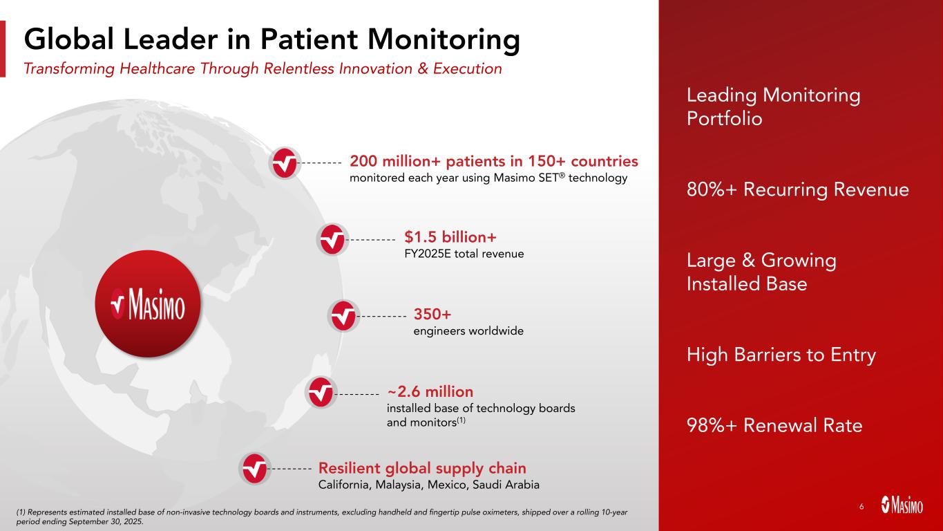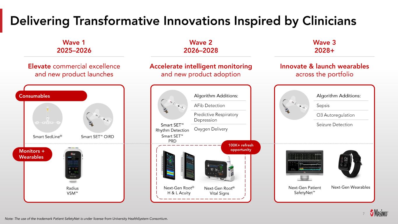 Global Leader in Patient Monitoring (1) Represents estimated installed base of non-invasive technology boards and instruments, excluding handheld and fingertip pulse oximeters, shipped over a rolling 10-year period ending September 30, 2025. 350+ engineers worldwide 200 million+ patients in 150+ countries monitored each year using Masimo SET® technology ~2.6 million installed base of technology boards and monitors(1) $1.5 billion+ FY2025E total revenue Transforming Healthcare Through Relentless Innovation & Execution Resilient global supply chain California, Malaysia, Mexico, Saudi Arabia Leading Monitoring Portfolio 80%+ Recurring Revenue Large & Growing Installed Base High Barriers to Entry 98%+ Renewal Rate 6