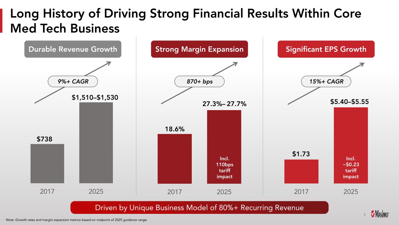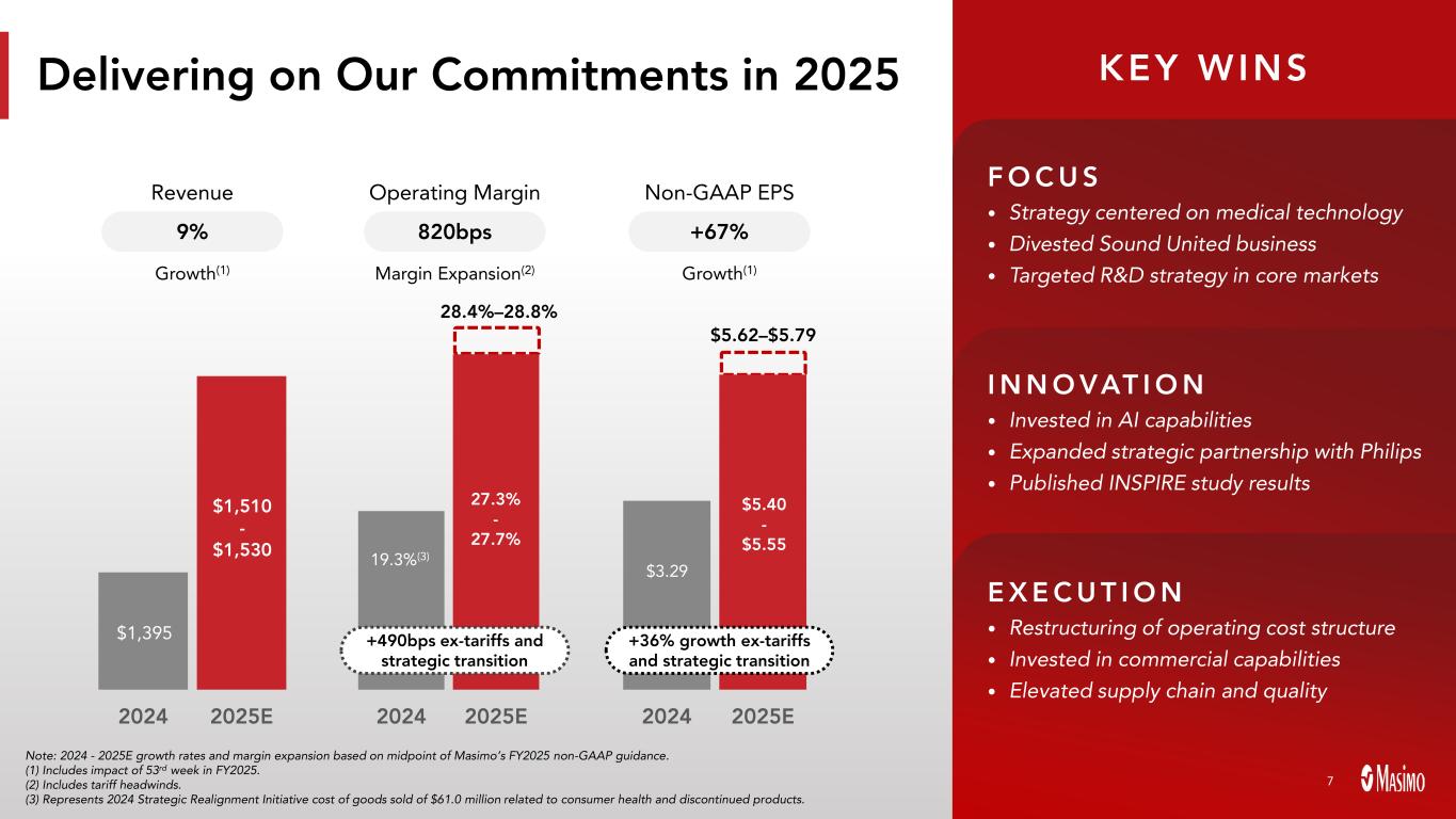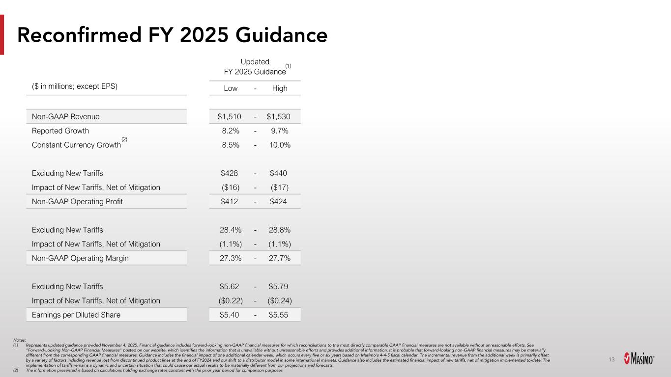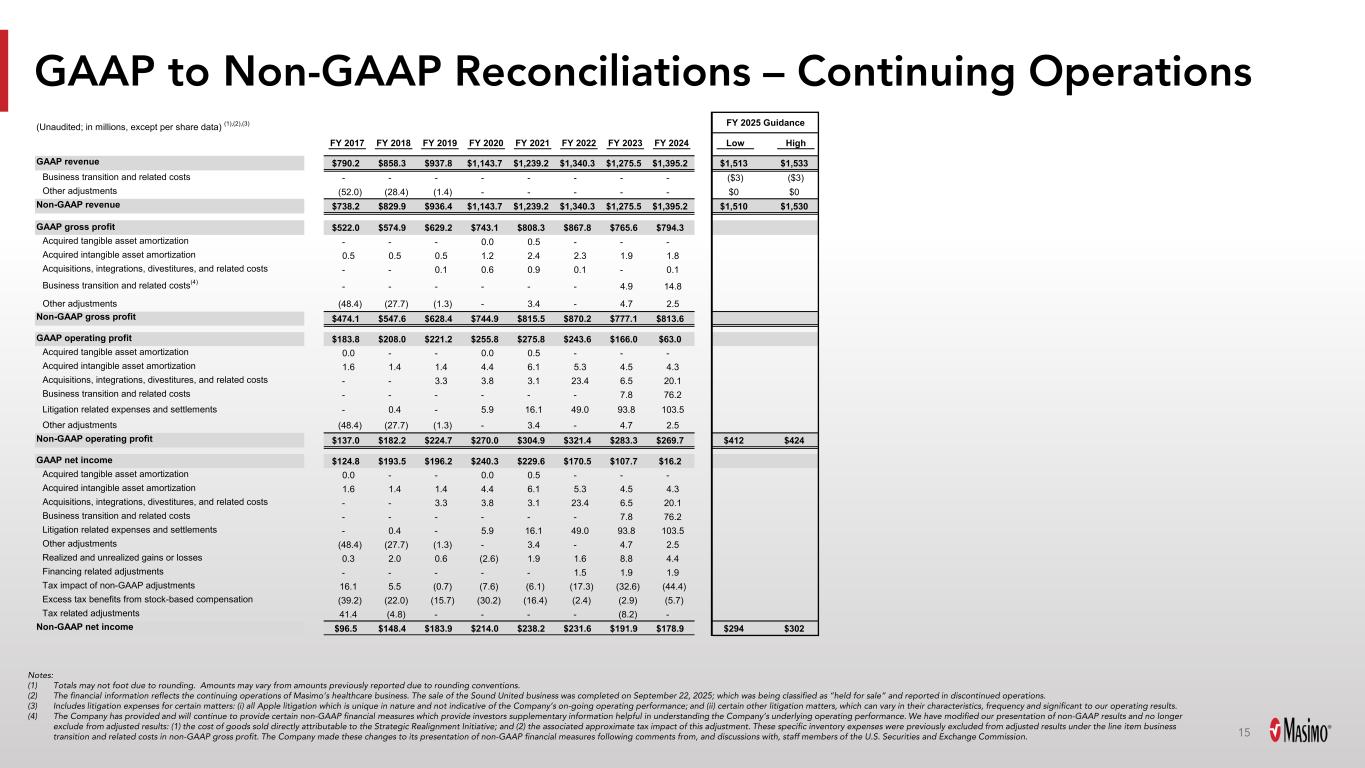 GAAP to Non-GAAP Reconciliations – Continuing Operations Notes: (1) Totals may not foot due to rounding. Amounts may vary from amounts previously reported due to rounding conventions. (2) The financial information reflects the continuing operations of Masimo’s healthcare business. The sale of the Sound United business was completed on September 22, 2025; which was being classified as “held for sale” and reported in discontinued operations. (3) Includes litigation expenses for certain matters: (i) all Apple litigation which is unique in nature and not indicative of the Company’s on-going operating performance; and (ii) certain other litigation matters, which can vary in their characteristics, frequency and significant to our operating results. (4) The Company has provided and will continue to provide certain non-GAAP financial measures which provide investors supplementary information helpful in understanding the Company’s underlying operating performance. We have modified our presentation of non-GAAP results and no longer exclude from adjusted results: (1) the cost of goods sold directly attributable to the Strategic Realignment Initiative; and (2) the associated approximate tax impact of this adjustment. These specific inventory expenses were previously excluded from adjusted results under the line item business transition and related costs in non-GAAP gross profit. The Company made these changes to its presentation of non-GAAP financial measures following comments from, and discussions with, staff members of the U.S. Securities and Exchange Commission. (Unaudited; in millions, except per share data) (1),(2),(3) FY 2025 Guidance FY 2017 FY 2018 FY 2019 FY 2020 FY 2021 FY 2022 FY 2023 FY 2024 Low High GAAP revenue $790.2 $858.3 $937.8 $1,143.7 $1,239.2 $1,340.3 $1,275.5 $1,395.2 $1,513 $1,533 Business transition and related costs - - - - - - - - ($3) ($3) Other adjustments (52.0) (28.4) (1.4) - - - - - $0 $0 Non-GAAP revenue $738.2 $829.9 $936.4 $1,143.7 $1,239.2 $1,340.3 $1,275.5 $1,395.2 $1,510 $1,530 GAAP gross profit $522.0 $574.9 $629.2 $743.1 $808.3 $867.8 $765.6 $794.3 Acquired tangible asset amortization - - - 0.0 0.5 - - - Acquired intangible asset amortization 0.5 0.5 0.5 1.2 2.4 2.3 1.9 1.8 Acquisitions, integrations, divestitures, and related costs - - 0.1 0.6 0.9 0.1 - 0.1 Business transition and related costs(4) - - - - - - 4.9 14.8 Other adjustments (48.4) (27.7) (1.3) - 3.4 - 4.7 2.5 Non-GAAP gross profit $474.1 $547.6 $628.4 $744.9 $815.5 $870.2 $777.1 $813.6 GAAP operating profit $183.8 $208.0 $221.2 $255.8 $275.8 $243.6 $166.0 $63.0 Acquired tangible asset amortization 0.0 - - 0.0 0.5 - - - Acquired intangible asset amortization 1.6 1.4 1.4 4.4 6.1 5.3 4.5 4.3 Acquisitions, integrations, divestitures, and related costs - - 3.3 3.8 3.1 23.4 6.5 20.1 Business transition and related costs - - - - - - 7.8 76.2 Litigation related expenses and settlements - 0.4 - 5.9 16.1 49.0 93.8 103.5 Other adjustments (48.4) (27.7) (1.3) - 3.4 - 4.7 2.5 Non-GAAP operating profit $137.0 $182.2 $224.7 $270.0 $304.9 $321.4 $283.3 $269.7 $412 $424 GAAP net income $124.8 $193.5 $196.2 $240.3 $229.6 $170.5 $107.7 $16.2 Acquired tangible asset amortization 0.0 - - 0.0 0.5 - - - Acquired intangible asset amortization 1.6 1.4 1.4 4.4 6.1 5.3 4.5 4.3 Acquisitions, integrations, divestitures, and related costs - - 3.3 3.8 3.1 23.4 6.5 20.1 Business transition and related costs - - - - - - 7.8 76.2 Litigation related expenses and settlements - 0.4 - 5.9 16.1 49.0 93.8 103.5 Other adjustments (48.4) (27.7) (1.3) - 3.4 - 4.7 2.5 Realized and unrealized gains or losses 0.3 2.0 0.6 (2.6) 1.9 1.6 8.8 4.4 Financing related adjustments - - - - - 1.5 1.9 1.9 Tax impact of non-GAAP adjustments 16.1 5.5 (0.7) (7.6) (6.1) (17.3) (32.6) (44.4) Excess tax benefits from stock-based compensation (39.2) (22.0) (15.7) (30.2) (16.4) (2.4) (2.9) (5.7) Tax related adjustments 41.4 (4.8) - - - - (8.2) - Non-GAAP net income $96.5 $148.4 $183.9 $214.0 $238.2 $231.6 $191.9 $178.9 $294 $302 15