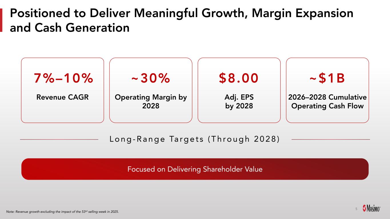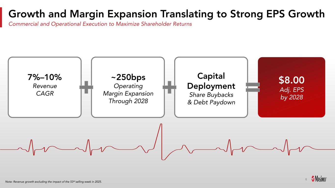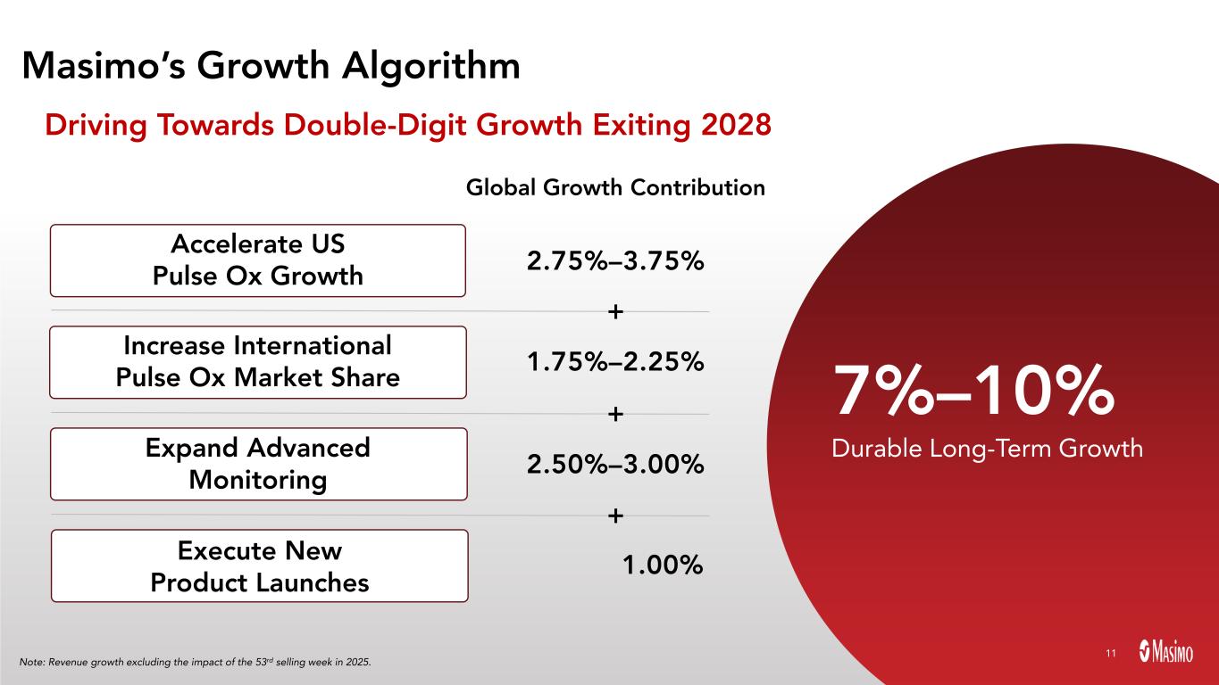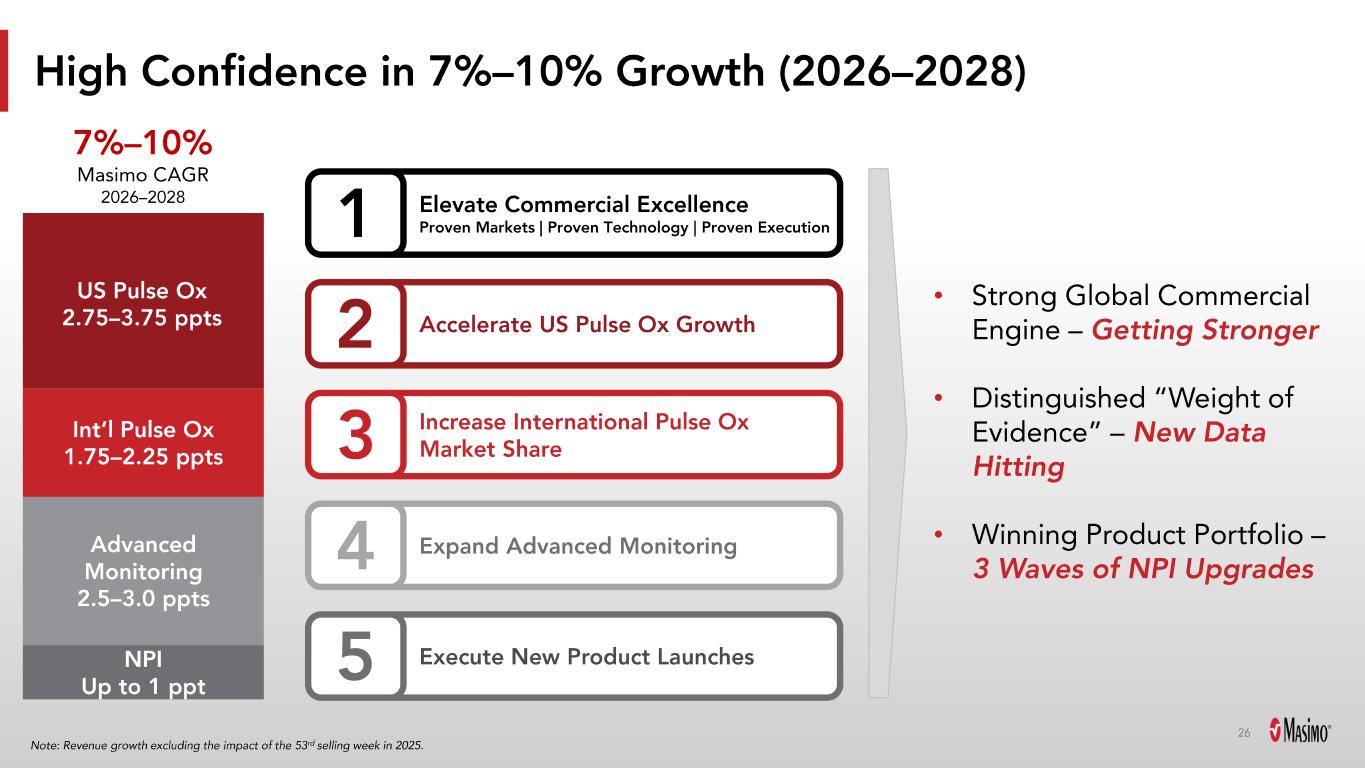 Note: Revenue growth excluding the impact of the 53rd selling week in 2025. Expand Advanced Monitoring 2.50%–3.00% 7%–10% Durable Long-Term Growth Masimo’s Growth Algorithm Driving Towards Double-Digit Growth Exiting 2028 Accelerate US Pulse Ox Growth 2.75%–3.75% Execute New Product Launches Global Growth Contribution Penetrate International Pulse Ox Market 1.75%–2.25% Increase International Pulse Ox Market Share + + + 1.00% 11
