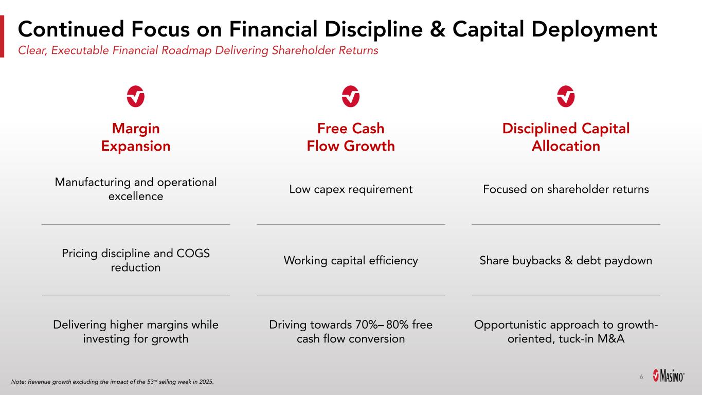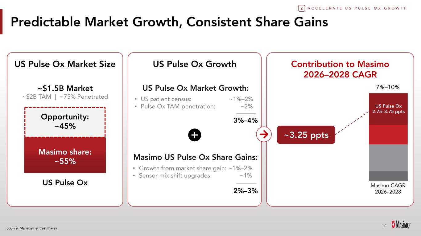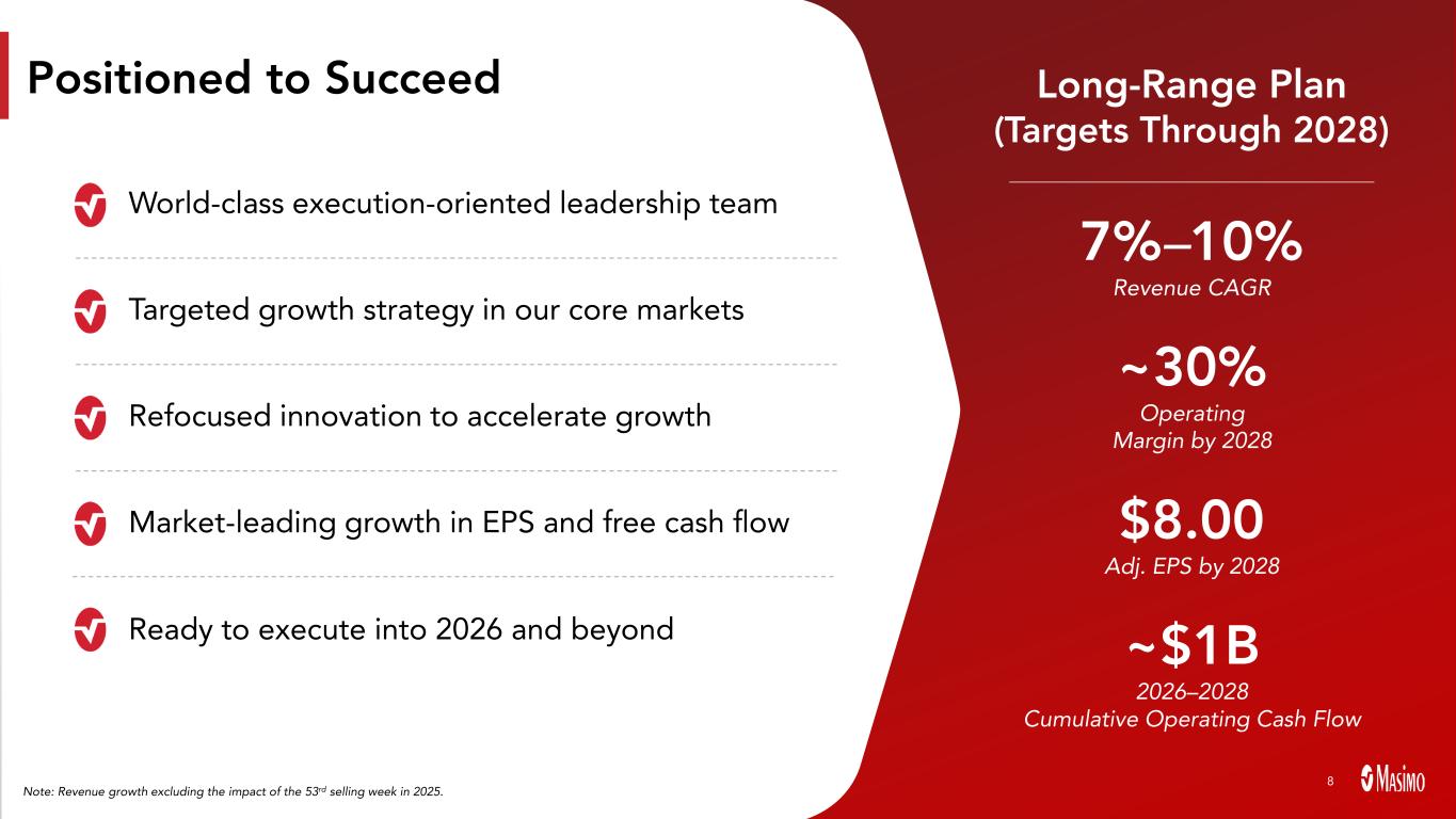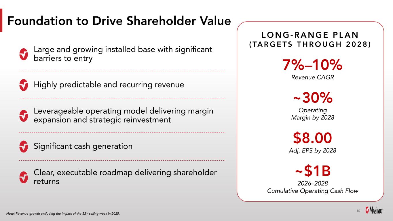 Note: Revenue growth excluding the impact of the 53rd selling week in 2025. Expand Advanced Monitoring 2.50%–3.00% 7%–10% Durable Long-Term Growth Masimo’s Growth Algorithm Driving Towards Double-Digit Growth Exiting 2028 Accelerate US Pulse Ox Growth 2.75%–3.75% Execute New Product Launches Global Growth Contribution Penetrate International Pulse Ox Market 1.75%–2.25% Increase International Pulse Ox Market Share + + + 1.00% 11