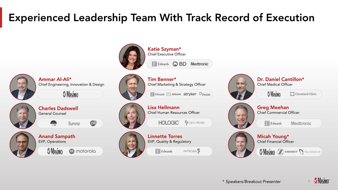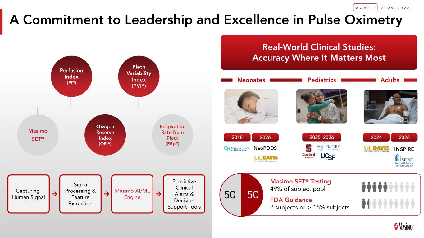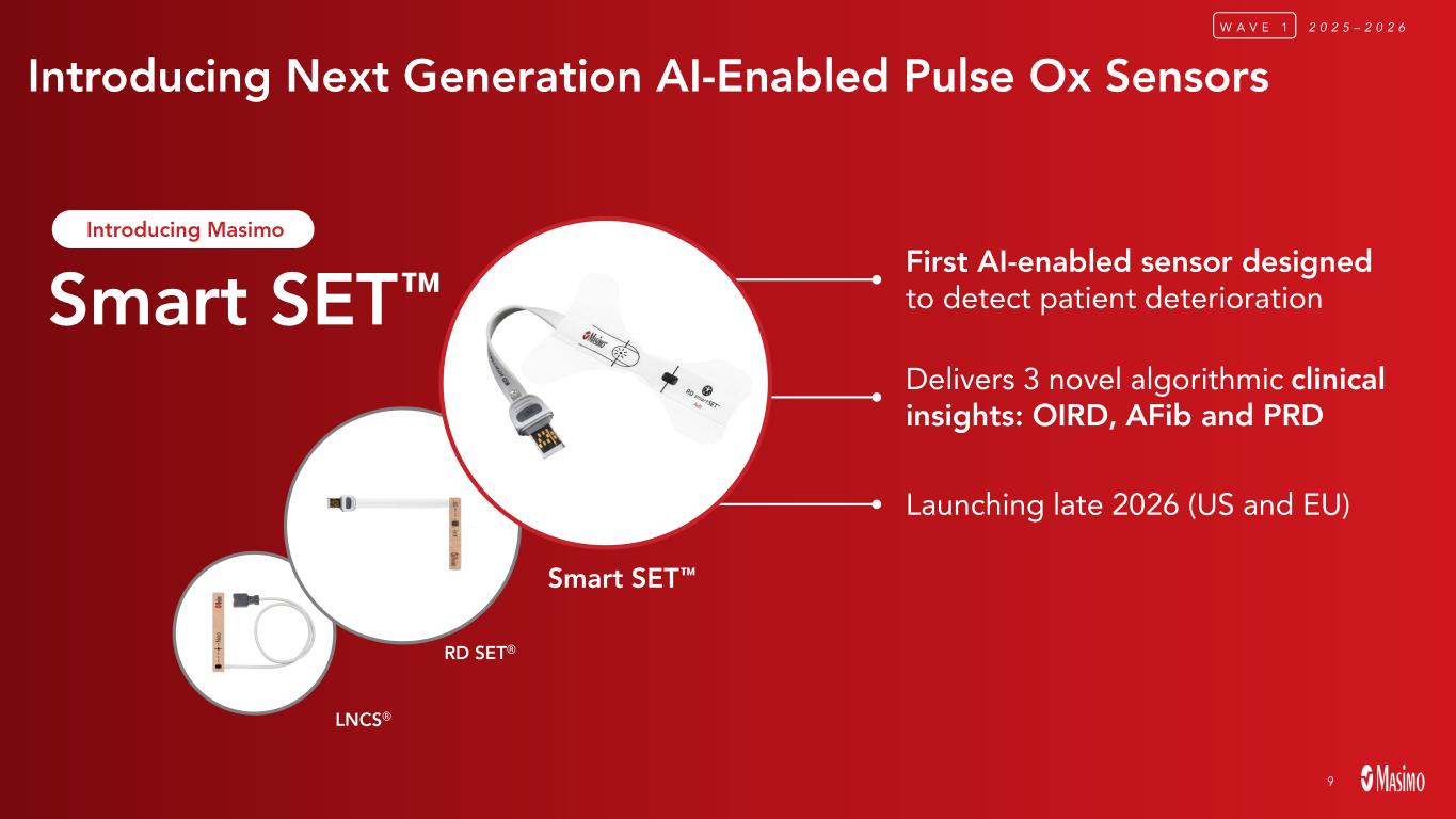WAVE 1 2025 – 2026 A Commitment to Leadership and Excellence in Pulse Oximetry Capturing Human Signal Signal Processing & Feature Extraction Masimo AI/ML Engine Predictive Clinical Alerts & Decision Support Tools Masimo SET ® Testing 49% of subject pool FDA Guidance 2 subjects or > 15% subjects 50 50 NeoPODS PediatricsNeonates Adults 2018 2025 –2026 INSPIRE Masimo SET ® Oxygen Reserve Index (ORi ® ) Respiration Rate from Pleth (RRp ® ) Perfusion Index (Pi® ) Pleth Variability Index (PVi ® ) Real -World Clinical Studies: Accuracy Where It Matters Most 2026 2024 2026 8