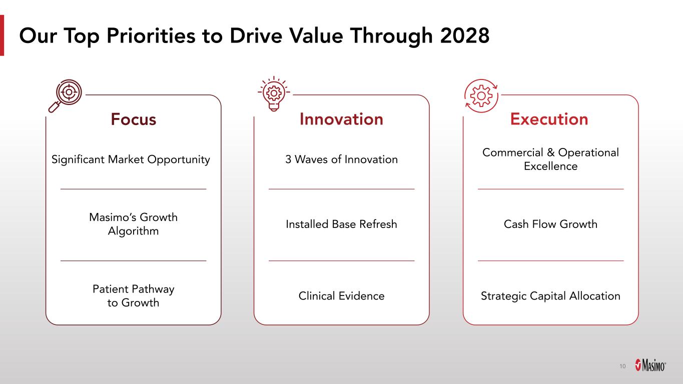 Commercial & Operational Excellence Cash Flow Growth Strategic Capital Allocation ExecutionInnovation 3 Waves of Innovation Installed Base Refresh Clinical Evidence Focus Significant Market Opportunity Masimo’s Growth Algorithm Patient Pathway to Growth Our Top Priorities to Drive Value Through 2028 10
