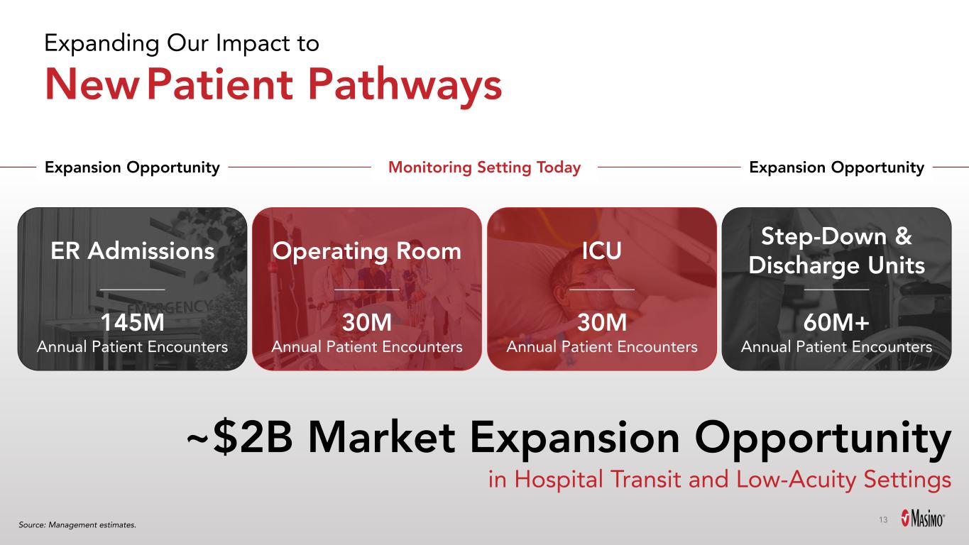 Significant Market Opportunity Across Large Key Markets US Pulse Ox Int'l Pulse Ox Advanced Monitoring Continuous Monitoring ~55% Masimo share ~35% Masimo share ~15% Masimo share $1.5B Market 3%–4% Annual Growth ~$800M Market 6%–8% Annual Growth ~$2.5B Market 5%–9% Annual Growth ~45% opportunity ~65% opportunity ~85% opportunity 98%+ opportunity ~$2B TAM ~1.5x Market Rate 5%–7% Annual Growth ~1.5x Market Rate 10%+ Annual Growth Grow to Match Pulse Ox Market Share Over Time 10%+ Annual Growth Expansion Into Low- Acuity Monitoring (Curb-To-Curb) Long Runway for Masimo Share Capture in Core Markets Market Expansion Masimo Growth Outlook Ample Opportunity for Share Gains in Highly Profitable US and International Markets Source: Management estimates. 12