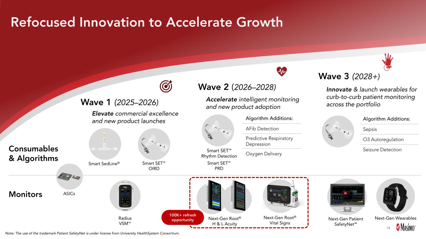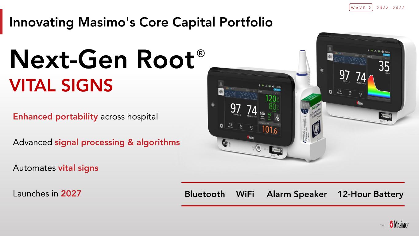 WAVE 2 2026 – 2028 Next -Gen Root Improves hospital workflows with EMR connectivity Hosts totality of Masimo’s smart algorithms Individualized care with advanced detection & prediction Launches in 2027 Innovating Masimo's Core Capital Portfolio ® 13
