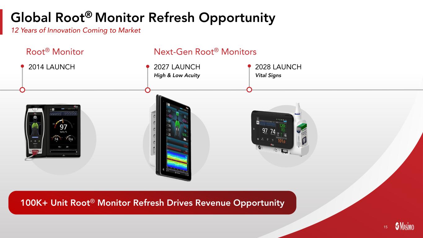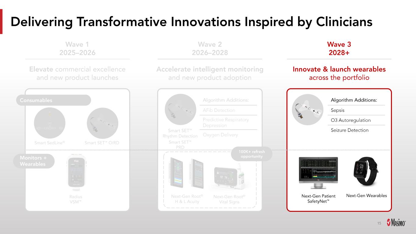 WAVE 2 2026 – 2028 Next -Gen Root VITAL SIGNS Enhanced portability across hospital Advanced signal processing & algorithms Automates vital signs Bluetooth WiFi Alarm Speaker 12 -Hour Battery Innovating Masimo's Core Capital Portfolio Launches in 2027 ® 14