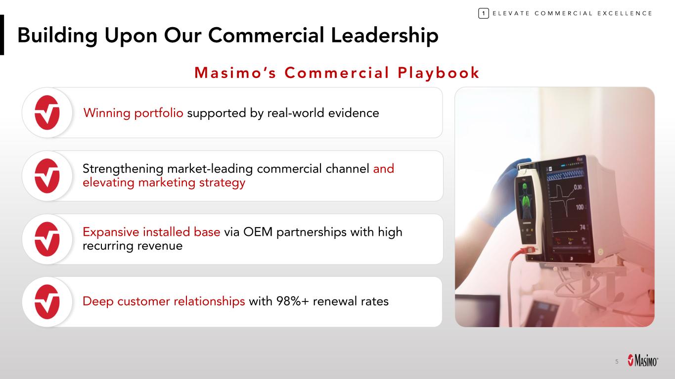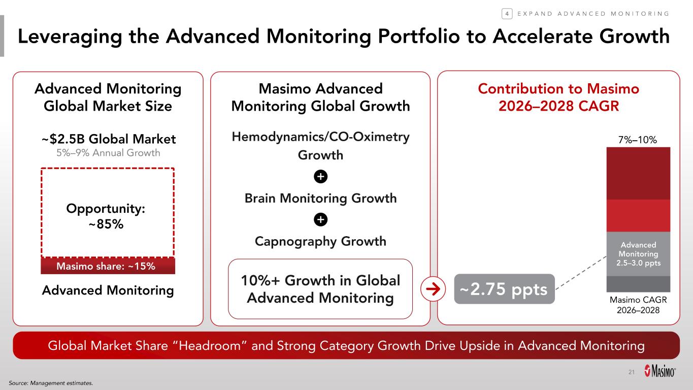 EXPAND ADVANCED MONITORING4 Ad vanced Monitoring 2.5 –3.0 ppts Leveraging the Advanced Monitoring Portfolio to Accelerate Growth Advanced Monitoring Global Market Size Masimo Share: ~55%+ Masimo Advanced Monitoring Global Growth Contribution to Masimo 2026 –2028 CAGR 7% –10% ~2.75 ppts ~$ 2.5B Global Market 5% –9% Annual Growth Advanced Monitoring Opportunity: ~85% Masimo share: ~15% Hemodynamics/CO -Oximetry Growth Brain Monitoring Growth Capnography Growth 10%+ Growth in Global Advanced Monitoring Global Market Share “Headroom” and Strong Category Growth Drive Upside in Advanced Monitoring Source: Management estimates. 21 Masimo CAGR 2026 –2028