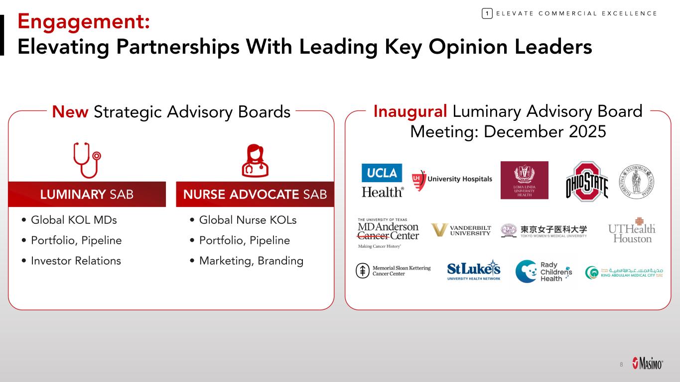 F O C U S • Strategy centered on medical technology • Divested Sound United business • Targeted R&D strategy in core markets I N N O VAT I O N • Invested in AI capabilities • Expanded strategic partnership with Philips • Published INSPIRE study results E X E C U T I O N • Restructuring of operating cost structure • Invested in commercial capabilities • Elevated supply chain and quality Note: 2024 - 2025E growth rates and margin expansion based on midpoint of Masimo’s FY2025 non-GAAP guidance. (1) Includes impact of 53rd week in FY2025. (2) Includes tariff headwinds. (3) Represents 2024 Strategic Realignment Initiative cost of goods sold of $61.0 million related to consumer health and discontinued products. KEY WINS 2024 2025E 9% Revenue Growth(1) 2024 2025E 28.4%–28.8% 19.3%(3) 27.3% - 27.7% 820bps Operating Margin Margin Expansion(2) +490bps ex-tariffs and strategic transition 2024 2025E $3.29 $5.40 - $5.55 $5.62–$5.79 Non-GAAP EPS +67% Growth(1) +36% growth ex-tariffs and strategic transition Delivering on Our Commitments in 2025 7 $1,395 $1,510 - $1,530