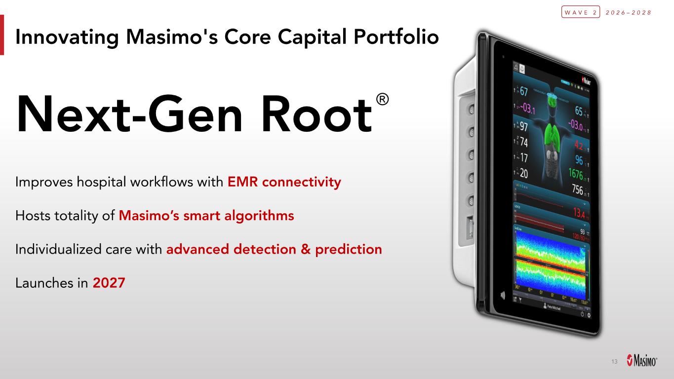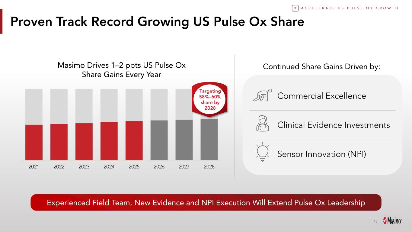 ACCELERATE US PULSE OX GROWTH2 Predictable Market Growth, Consistent Share Gains US Pulse Ox US Pulse Ox Market Size ~$1.5B Market ~$2B TAM | ~75% Penetrated Masimo share: ~55% Opportunity: ~45% 7% –10% US Pulse Ox 2.75 –3.75 ppts Contribution to Masimo 2026 –2028 CAGR Masimo CAGR 2026 –2028 ~3.25 ppts US Pulse Ox Growth US Pulse Ox Market Growth: • US patient census: ~1% –2% • Pulse Ox TAM penetration: ~2% 3% –4% Masimo US Pulse Ox Share Gains: • Growth from market share gain: ~1% –2% • Sensor mix shift upgrades: ~1% 2% –3% Source: Management estimates. 12 7% –10%
