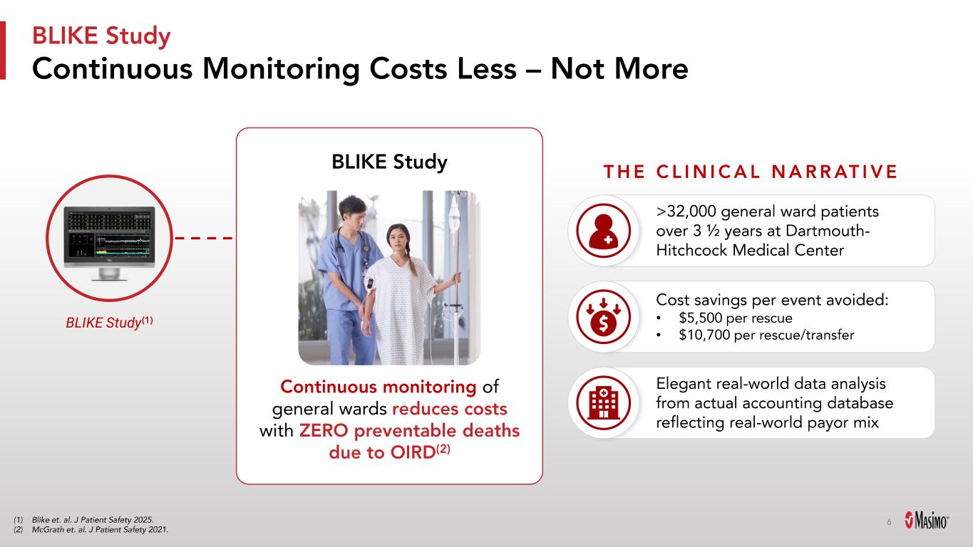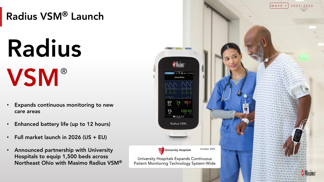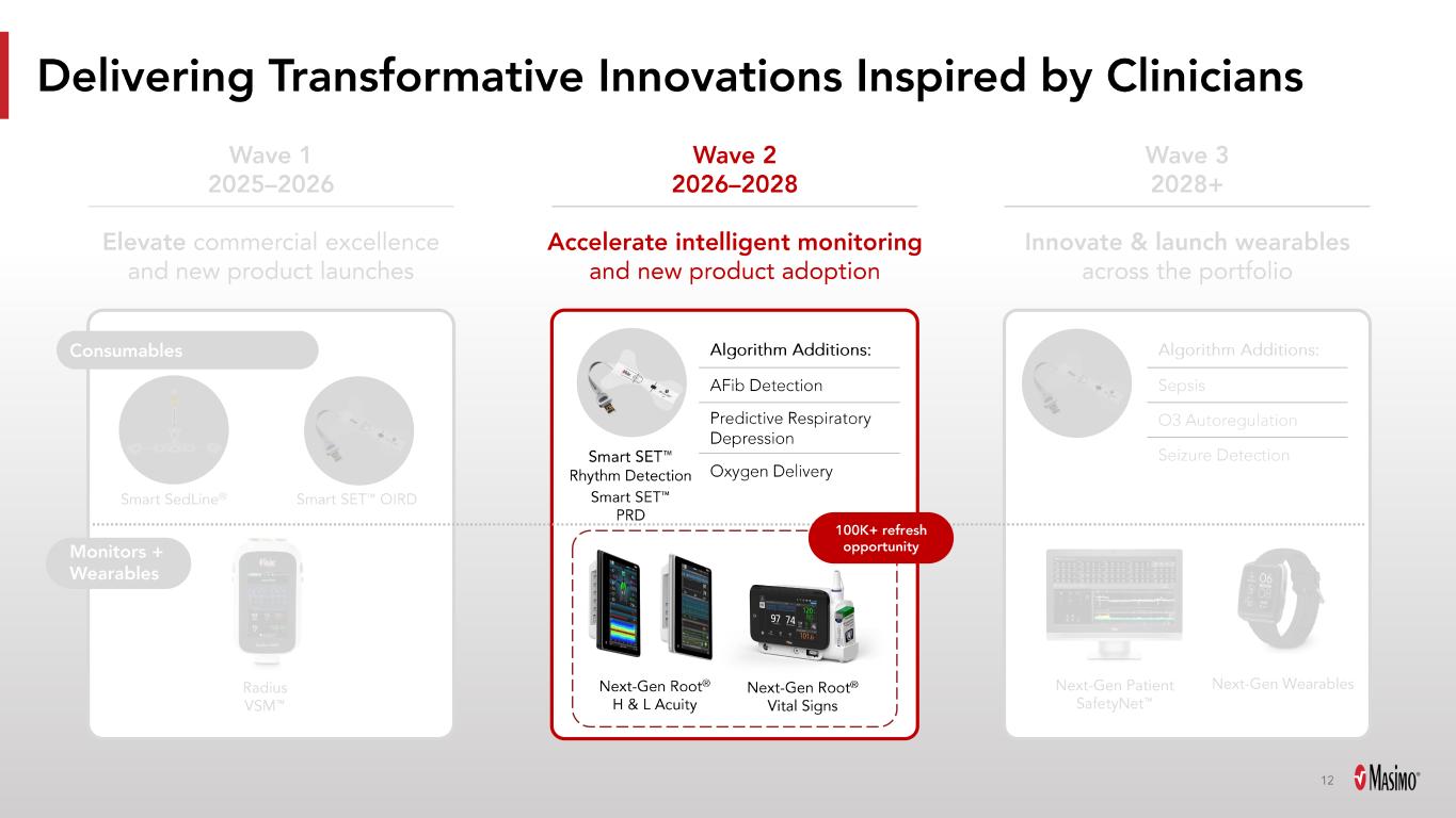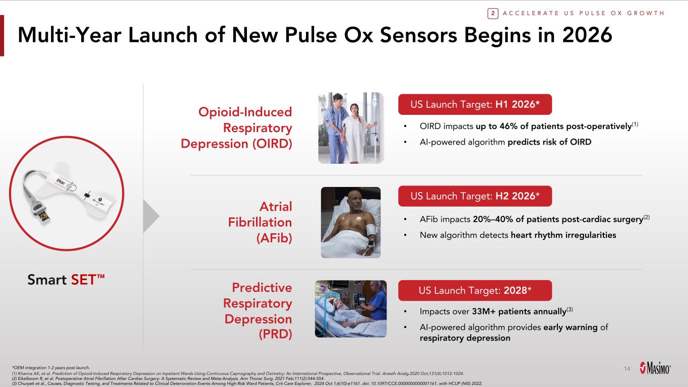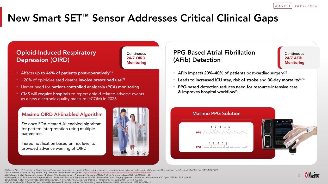 WAVE 1 2025 – 2026 New Smart SET Sensor Addresses Critical Clinical Gaps Opioid -Induced Respiratory Depression ( OIRD ) Continuous 24/7 OIRD Monitoring • Affects up to 46% of patients post -operatively (1) • ~20% of opioid -related deaths involve prescribed use (2) • Unmet need for patient -controlled analgesia (PCA) monitoring • CMS will require hospitals to report opioid -related adverse events as a new electronic quality measure ( eCQM ) in 2026 Masimo OIRD AI -Enabled Algorithm De novo FDA cleared AI -enabled algorithm for pattern interpretation using multiple parameters Tiered notification based on risk level to provided advance warning of OIRD PPG -Based Atrial Fibrillation (AFib ) Detection • AFib impacts 20% –40% of patients post -cardiac surgery (3) • Leads to increased ICU stay , risk of stroke and 30 -day mortality (4,5) • PPG -based detection reduces need for resource -intensive care & improves hospital workflow (6) Masimo PPG Solution Continuous 24/7 A F ib Monitoring 10 (1) Khanna AK, et al. Prediction of Opioid -Induced Respiratory Depression on Inpatient Wards Using Continuous Capnography and Ox imetry: An International Prospective, Observational Trial. Anesth Analg.2020 Oct;131(4):1012 -1024. (2) NIH National Institute on Drug Abuse. Drug Overdose Deaths: Facts and Figures: https://nida.nih.gov/research -topics/trends -statistics/overdose -death -rates (3) Eikelboom R, et al. Postoperative Atrial Fibrillation After Cardiac Surgery: A Systematic Review and Meta -Analysis. Ann Thorac Surg. 2021 Feb;111(2):544 -554. (4) Wang MK, et al. Short -term and Long -term Risk of Stroke in Patients With Perioperative Atrial Fibrillation After Cardiac Surgery : Systematic Review and Meta -analysis. CJC Open.2021 Sep 16;4(1):85 -96. (5) Caldonazo T, et al. Atrial fibrillation after cardiac surgery: A systematic review and meta -analysis. J Thorac Cardiovasc Surg. 2023;165(1):94 -103.e24. (6) Chen W, Khurshid S, Singer DE, et al. Cost -effectiveness of Screening for Atrial Fibrillation Using Wearable Devices. JAMA Healt h Forum. 2022;3(8):e222419