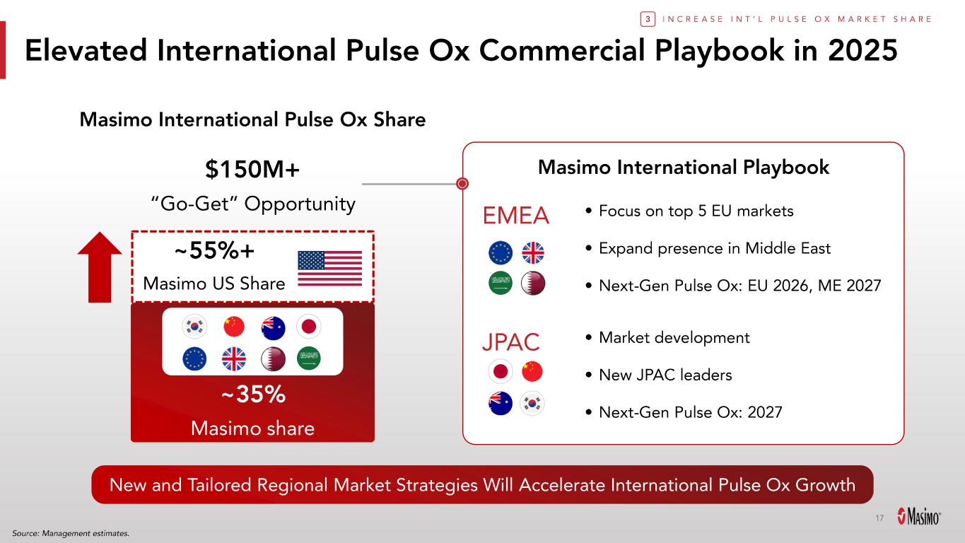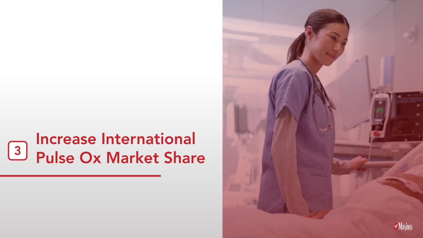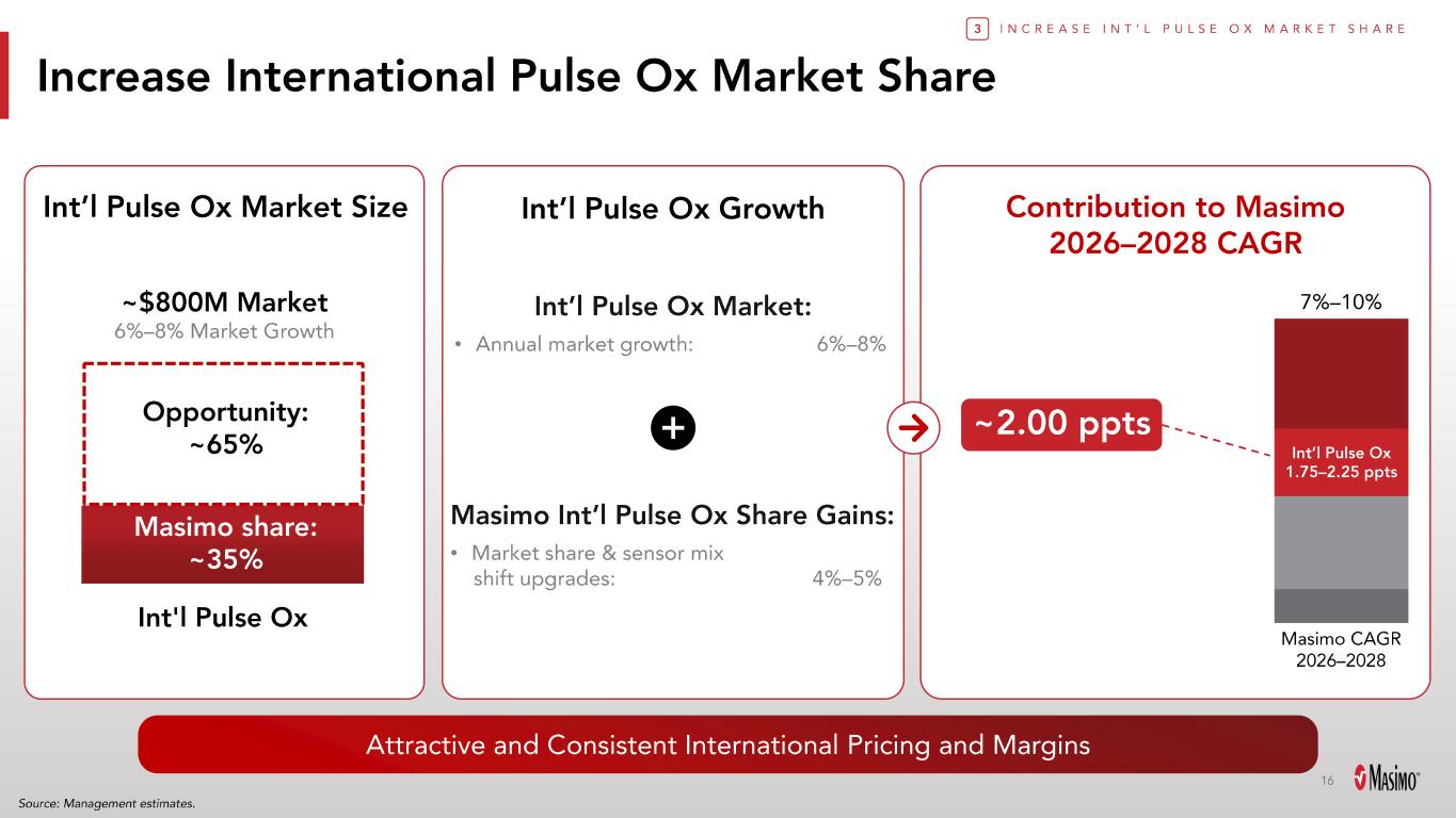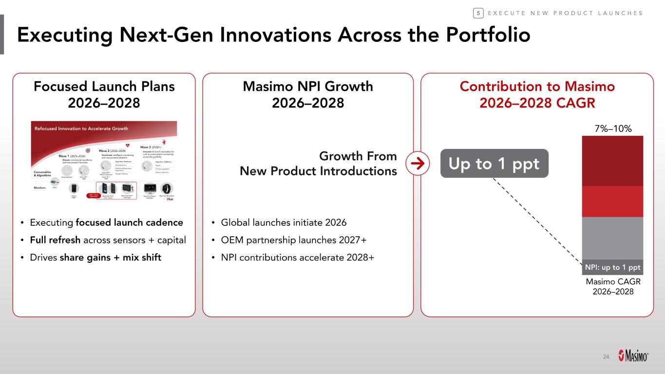 Note: Revenue growth excluding the impact of the 53 rd selling week in 2025. Expand Advanced Monitoring 2.50% –3.00% 7% –10% Durable Long -Term Growth Masimo’s Growth Algorithm Driving Towards Double -Digit Growth Exiting 2028 Accelerate US Pulse Ox Growth 2.75% –3.75% Execute New Product Launches Global Growth Contribution Penetrate International Pulse Ox Market 1.75% –2.25% Increase International Pulse Ox Market Share + + + 1.00% 2