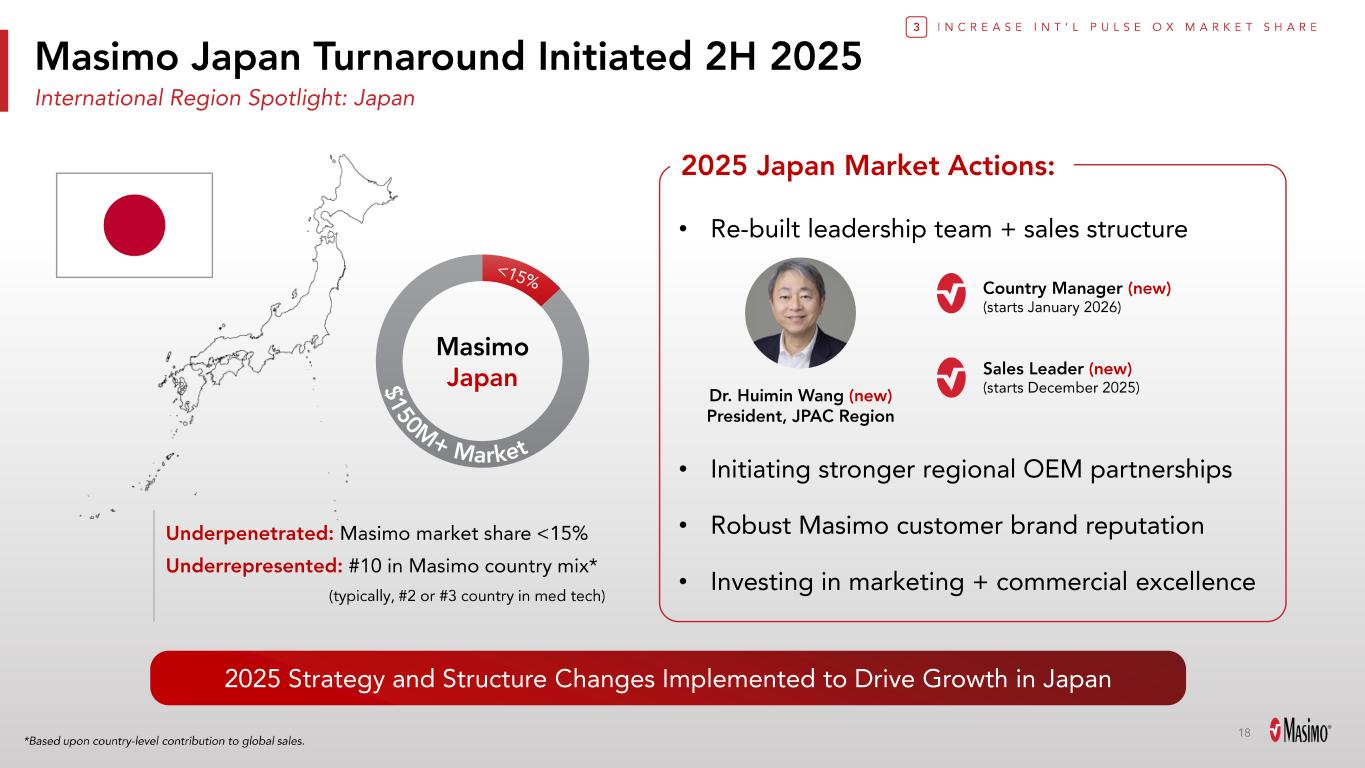 INCREASE INT’L PULSE OX MARKET SHARE3 $ 1 50M + Market *Based upon country -level contribution to global sales. Masimo Japan Turnaround Initiated 2H 2025 International Region Spotlight: Japan Country Manager (new) (starts January 2026) Sales Leader (new) (starts December 2025) Underpenetrated: Masimo market share <15 % Underrepresented: #10 in Masimo country mix* (typically, #2 or #3 country in med tech) Masimo Japan • Re -built leadership team + sales structure • Initiating stronger regional OEM partnerships • Robust Masimo customer brand reputation • Investing in marketing + commercial excellence 2025 Japan Market Actions: 2025 Strategy and Structure Changes Implemented to Drive Growth in Japan Dr. Huimin Wang (new) President, JPAC Region 18