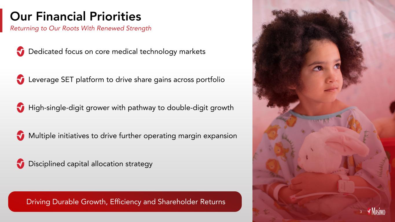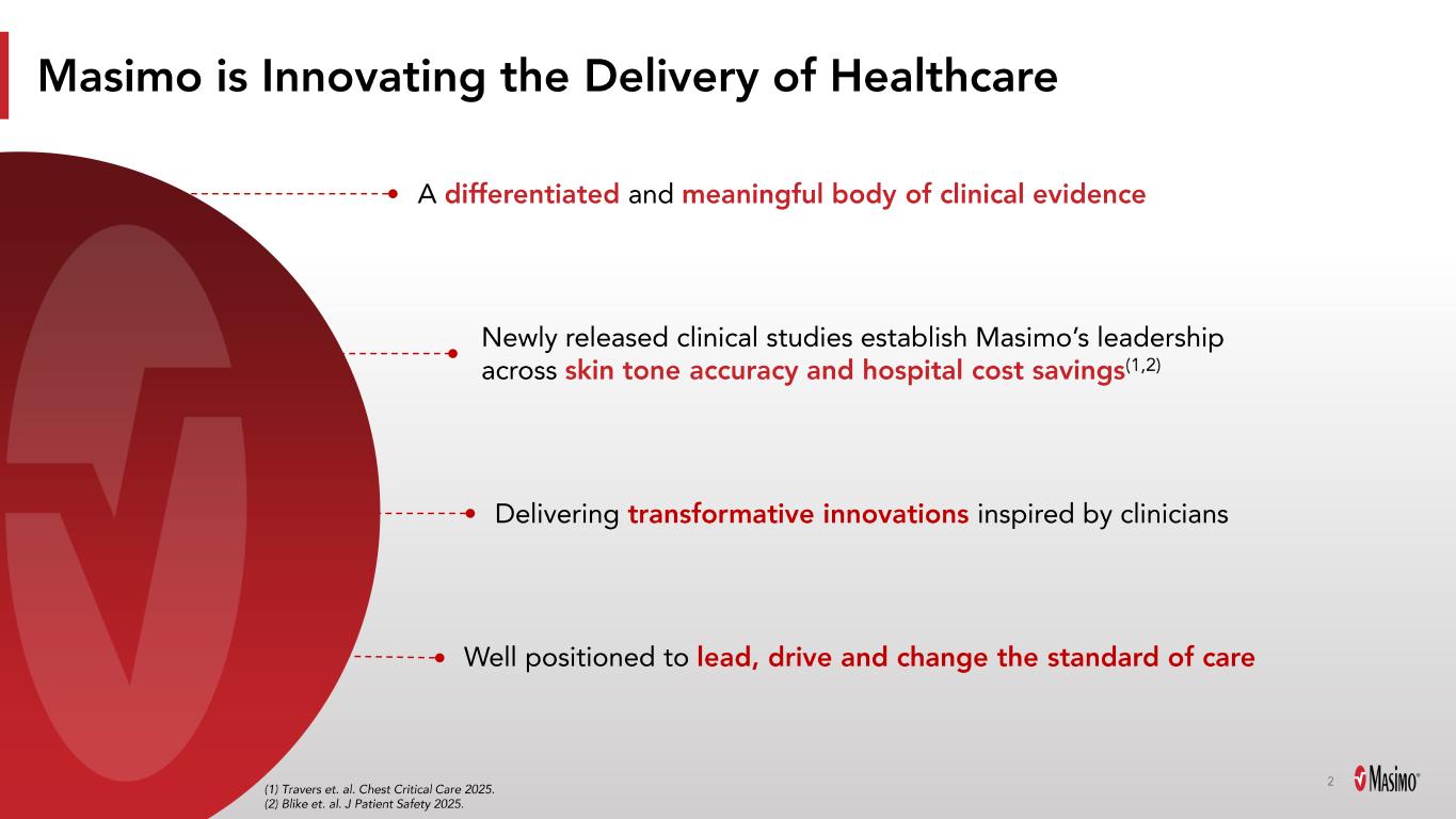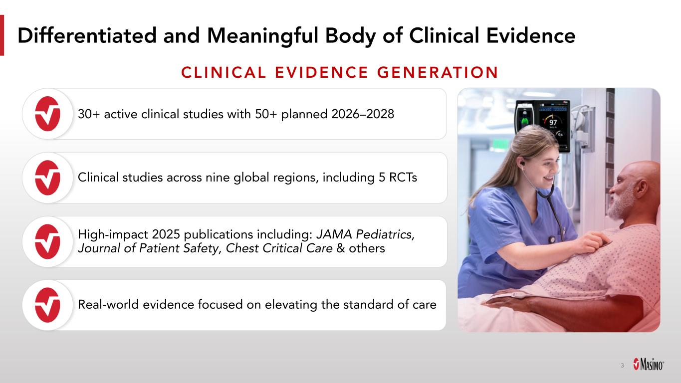 Masimo is Innovating the Delivery of Healthcare A differentiated and meaningful body of clinical evidence Newly released clinical studies establish Masimo’s leadership across skin tone accuracy and hospital cost savings (1,2) Delivering transformative innovations inspired by clinicians Well positioned to lead, drive and change the standard of care (1) Travers et. al. Chest Critical Care 2025. (2) Blike et. al. J Patient Safety 2025. 2