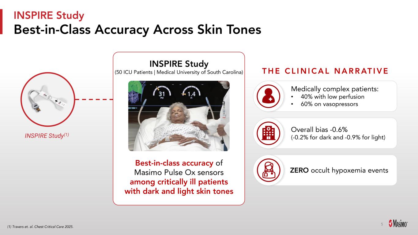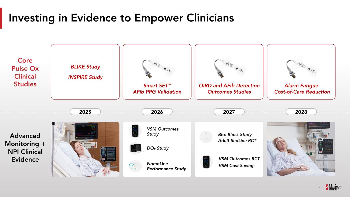 2028 Alarm Fatigue Cost-of-Care Reduction Investing in Evidence to Empower Clinicians Core Pulse Ox Clinical Studies Advanced Monitoring + NPI Clinical Evidence BLIKE Study INSPIRE Study 2025 VSM Outcomes RCT VSM Cost Savings Adult SedLine RCT Bite Block Study 2027 OIRD and AFib Detection Outcomes Studies 2026 Smart SET™ AFib PPG Validation NomoLine Performance Study VSM Outcomes Study DO2 Study 4