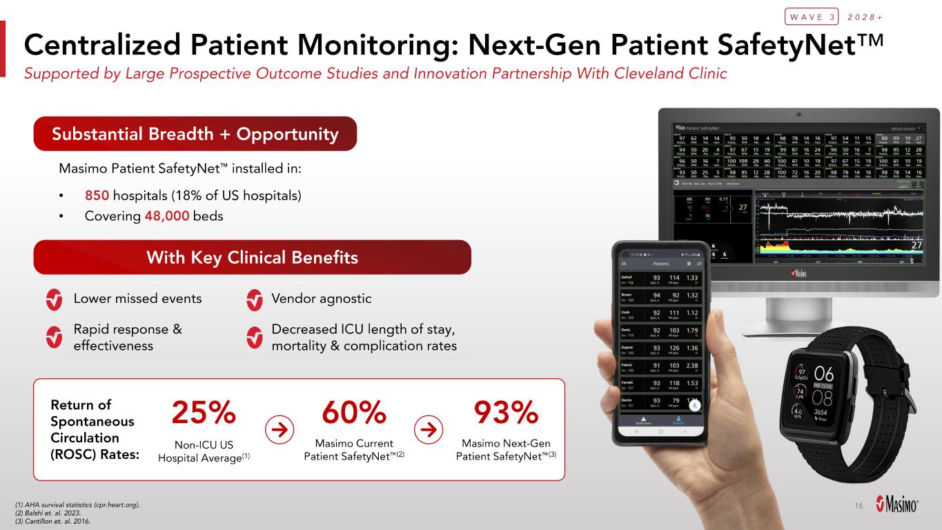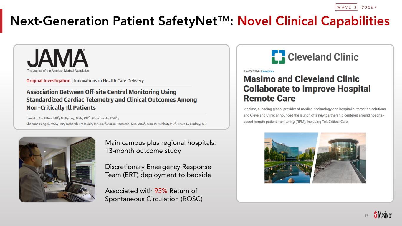WAVE 3 2028+ (1) AHA survival statistics (cpr.heart.org). (2) Balshi et. al. 2023. (3) Cantillon et. al. 2016. With Key Clinical Benefits Substantial Breadth + Opportunity Masimo Patient SafetyNet installed in: • 850 hospitals (18% of US hospitals) • Covering 48,000 beds Lower missed events Rapid response & effectiveness Vendor agnostic Decreased ICU length of stay, mortality & complication rates Return of Spontaneous Circulation (ROSC) Rates : 25% Non -ICU US Hospital Average (1) Masimo Current Patient SafetyNet (2) 60% Masimo Next -Gen Patient SafetyNet (3) 93% Centralized Patient Monitoring: Next -Gen Patient SafetyNet Supported by Large Prospective Outcome Studies and Innovation Partnership With Cleveland Clinic 16