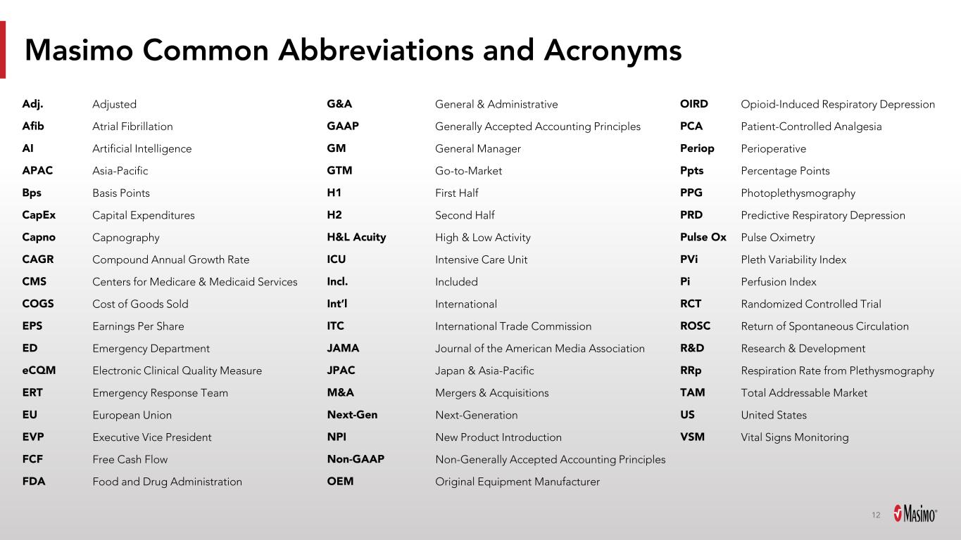 Masimo Common Abbreviations and Acronyms Adj. Adjusted G&A General & Administrative OIRD Opioid-Induced Respiratory Depression Afib Atrial Fibrillation GAAP Generally Accepted Accounting Principles PCA Patient-Controlled Analgesia AI Artificial Intelligence GM General Manager Periop Perioperative APAC Asia-Pacific GTM Go-to-Market Ppts Percentage Points Bps Basis Points H1 First Half PPG Photoplethysmography CapEx Capital Expenditures H2 Second Half PRD Predictive Respiratory Depression Capno Capnography H&L Acuity High & Low Activity Pulse Ox Pulse Oximetry CAGR Compound Annual Growth Rate ICU Intensive Care Unit PVi Pleth Variability Index CMS Centers for Medicare & Medicaid Services Incl. Included Pi Perfusion Index COGS Cost of Goods Sold Int’l International RCT Randomized Controlled Trial EPS Earnings Per Share ITC International Trade Commission ROSC Return of Spontaneous Circulation ED Emergency Department JAMA Journal of the American Media Association R&D Research & Development eCQM Electronic Clinical Quality Measure JPAC Japan & Asia-Pacific RRp Respiration Rate from Plethysmography ERT Emergency Response Team M&A Mergers & Acquisitions TAM Total Addressable Market EU European Union Next-Gen Next-Generation US United States EVP Executive Vice President NPI New Product Introduction VSM Vital Signs Monitoring FCF Free Cash Flow Non-GAAP Non-Generally Accepted Accounting Principles FDA Food and Drug Administration OEM Original Equipment Manufacturer 12