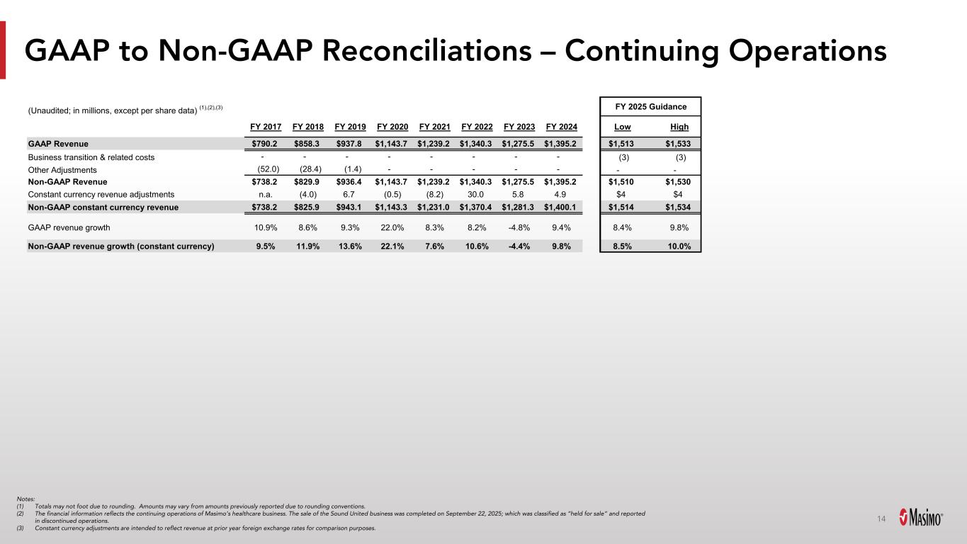 GAAP to Non-GAAP Reconciliations – Continuing Operations Notes: (1) Totals may not foot due to rounding. Amounts may vary from amounts previously reported due to rounding conventions. (2) The financial information reflects the continuing operations of Masimo’s healthcare business. The sale of the Sound United business was completed on September 22, 2025; which was classified as “held for sale” and reported in discontinued operations. (3) Constant currency adjustments are intended to reflect revenue at prior year foreign exchange rates for comparison purposes. (Unaudited; in millions, except per share data) (1),(2),(3) FY 2025 Guidance FY 2017 FY 2018 FY 2019 FY 2020 FY 2021 FY 2022 FY 2023 FY 2024 Low High GAAP Revenue $790.2 $858.3 $937.8 $1,143.7 $1,239.2 $1,340.3 $1,275.5 $1,395.2 $1,513 $1,533 Business transition & related costs - - - - - - - - (3) (3) Other Adjustments (52.0) (28.4) (1.4) - - - - - - - Non-GAAP Revenue $738.2 $829.9 $936.4 $1,143.7 $1,239.2 $1,340.3 $1,275.5 $1,395.2 $1,510 $1,530 Constant currency revenue adjustments n.a. (4.0) 6.7 (0.5) (8.2) 30.0 5.8 4.9 $4 $4 Non-GAAP constant currency revenue $738.2 $825.9 $943.1 $1,143.3 $1,231.0 $1,370.4 $1,281.3 $1,400.1 $1,514 $1,534 GAAP revenue growth 10.9% 8.6% 9.3% 22.0% 8.3% 8.2% -4.8% 9.4% 8.4% 9.8% Non-GAAP revenue growth (constant currency) 9.5% 11.9% 13.6% 22.1% 7.6% 10.6% -4.4% 9.8% 8.5% 10.0% 14