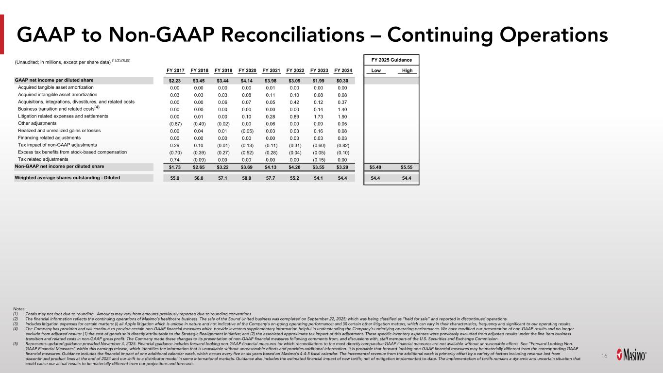 GAAP to Non-GAAP Reconciliations – Continuing Operations Notes: (1) Totals may not foot due to rounding. Amounts may vary from amounts previously reported due to rounding conventions. (2) The financial information reflects the continuing operations of Masimo’s healthcare business. The sale of the Sound United business was completed on September 22, 2025; which was being classified as “held for sale” and reported in discontinued operations. (3) Includes litigation expenses for certain matters: (i) all Apple litigation which is unique in nature and not indicative of the Company’s on-going operating performance; and (ii) certain other litigation matters, which can vary in their characteristics, frequency and significant to our operating results. (4) The Company has provided and will continue to provide certain non-GAAP financial measures which provide investors supplementary information helpful in understanding the Company’s underlying operating performance. We have modified our presentation of non-GAAP results and no longer exclude from adjusted results: (1) the cost of goods sold directly attributable to the Strategic Realignment Initiative; and (2) the associated approximate tax impact of this adjustment. These specific inventory expenses were previously excluded from adjusted results under the line item business transition and related costs in non-GAAP gross profit. The Company made these changes to its presentation of non-GAAP financial measures following comments from, and discussions with, staff members of the U.S. Securities and Exchange Commission. (5) Represents updated guidance provided November 4, 2025. Financial guidance includes forward-looking non-GAAP financial measures for which reconciliations to the most directly comparable GAAP financial measures are not available without unreasonable efforts. See “Forward-Looking Non- GAAP Financial Measures" within this earnings release, which identifies the information that is unavailable without unreasonable efforts and provides additional information. It is probable that forward-looking non-GAAP financial measures may be materially different from the corresponding GAAP financial measures. Guidance includes the financial impact of one additional calendar week, which occurs every five or six years based on Masimo’s 4-4-5 fiscal calendar. The incremental revenue from the additional week is primarily offset by a variety of factors including revenue lost from discontinued product lines at the end of 2024 and our shift to a distributor model in some international markets. Guidance also includes the estimated financial impact of new tariffs, net of mitigation implemented to-date. The implementation of tariffs remains a dynamic and uncertain situation that could cause our actual results to be materially different from our projections and forecasts. (4) (Unaudited; in millions, except per share data) (1),(2),(3) FY 2025 Guidance FY 2017 FY 2018 FY 2019 FY 2020 FY 2021 FY 2022 FY 2023 FY 2024 Low High GAAP net income per diluted share $2.23 $3.45 $3.44 $4.14 $3.98 $3.09 $1.99 $0.30 Acquired tangible asset amortization 0.00 0.00 0.00 0.00 0.01 0.00 0.00 0.00 Acquired intangible asset amortization 0.03 0.03 0.03 0.08 0.11 0.10 0.08 0.08 Acquisitions, integrations, divestitures, and related costs 0.00 0.00 0.06 0.07 0.05 0.42 0.12 0.37 Business transition and related costs 0.00 0.00 0.00 0.00 0.00 0.00 0.14 1.40 Litigation related expenses and settlements 0.00 0.01 0.00 0.10 0.28 0.89 1.73 1.90 Other adjustments (0.87) (0.49) (0.02) 0.00 0.06 0.00 0.09 0.05 Realized and unrealized gains or losses 0.00 0.04 0.01 (0.05) 0.03 0.03 0.16 0.08 Financing related adjustments 0.00 0.00 0.00 0.00 0.00 0.03 0.03 0.03 Tax impact of non-GAAP adjustments 0.29 0.10 (0.01) (0.13) (0.11) (0.31) (0.60) (0.82) Excess tax benefits from stock-based compensation (0.70) (0.39) (0.27) (0.52) (0.28) (0.04) (0.05) (0.10) Tax related adjustments 0.74 (0.09) 0.00 0.00 0.00 0.00 (0.15) 0.00 Non-GAAP net income per diluted share $1.73 $2.65 $3.22 $3.69 $4.13 $4.20 $3.55 $3.29 $5.40 $5.55 Weighted average shares outstanding - Diluted 55.9 56.0 57.1 58.0 57.7 55.2 54.1 54.4 54.4 54.4 ,(5) 16