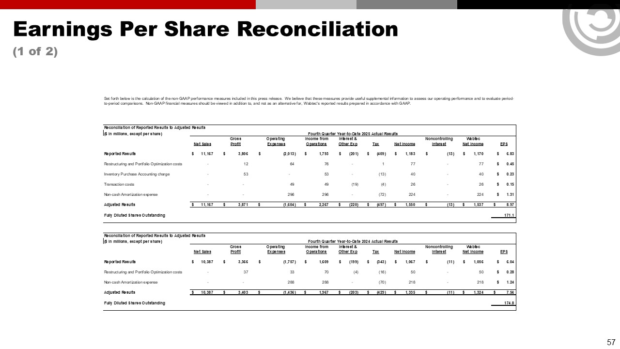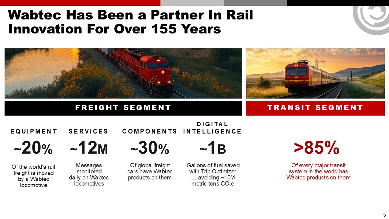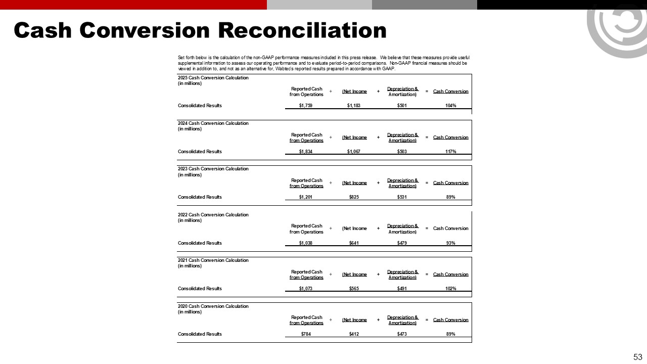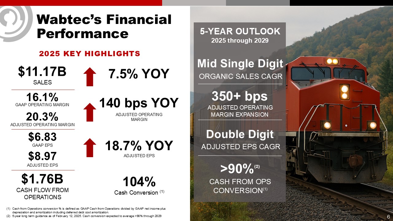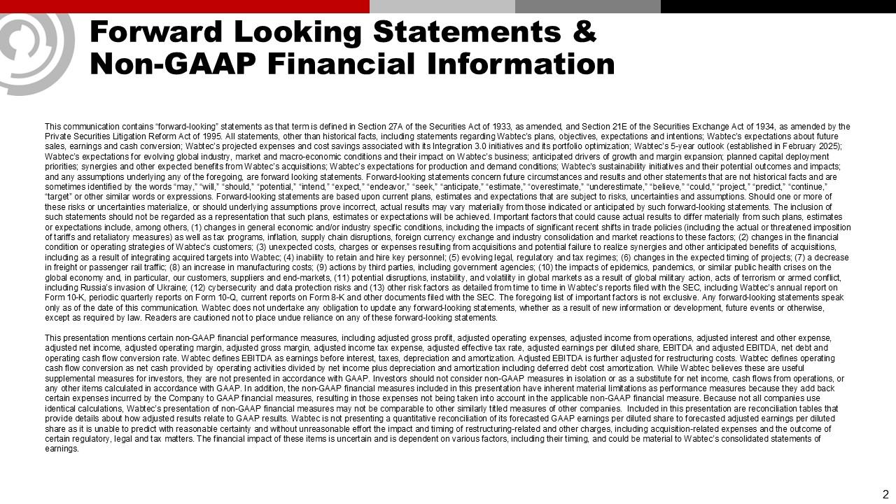 Forward Looking Statements & Non-GAAP Financial Information  This communication contains “forward-looking” statements as that term is defined in Section 27A of the Securities Act of 1933, as amended, and Section 21E of the Securities Exchange Act of 1934, as amended by the Private Securities Litigation Reform Act of 1995. All statements, other than historical facts, including statements regarding Wabtec’s plans, objectives, expectations and intentions; Wabtec’s expectations about future sales, earnings and cash conversion; Wabtec’s projected expenses and cost savings associated with its Integration 3.0 initiatives and its portfolio optimization; Wabtec’s 5-year outlook (established in February 2025); Wabtec’s expectations for evolving global industry, market and macro-economic conditions and their impact on Wabtec’s business; anticipated drivers of growth and margin expansion; planned capital deployment priorities; synergies and other expected benefits from Wabtec’s acquisitions; Wabtec’s expectations for production and demand conditions; Wabtec’s sustainability initiatives and their potential outcomes and impacts; and any assumptions underlying any of the foregoing, are forward looking statements. Forward-looking statements concern future circumstances and results and other statements that are not historical facts and are sometimes identified by the words “may,” “will,” “should,” “potential,” “intend,” “expect,” “endeavor,” “seek,” “anticipate,” “estimate,” “overestimate,” “underestimate,” “believe,” “could,” “project,” “predict,” “continue,” “target” or other similar words or expressions. Forward-looking statements are based upon current plans, estimates and expectations that are subject to risks, uncertainties and assumptions. Should one or more of these risks or uncertainties materialize, or should underlying assumptions prove incorrect, actual results may vary materially from those indicated or anticipated by such forward-looking statements. The inclusion of such statements should not be regarded as a representation that such plans, estimates or expectations will be achieved. Important factors that could cause actual results to differ materially from such plans, estimates or expectations include, among others, (1) changes in general economic and/or industry specific conditions, including the impacts of significant recent shifts in trade policies (including the actual or threatened imposition of tariffs and retaliatory measures) as well as tax programs, inflation, supply chain disruptions, foreign currency exchange and industry consolidation and market reactions to these factors; (2) changes in the financial condition or operating strategies of Wabtec's customers; (3) unexpected costs, charges or expenses resulting from acquisitions and potential failure to realize synergies and other anticipated benefits of acquisitions, including as a result of integrating acquired targets into Wabtec; (4) inability to retain and hire key personnel; (5) evolving legal, regulatory and tax regimes; (6) changes in the expected timing of projects; (7) a decrease in freight or passenger rail traffic; (8) an increase in manufacturing costs; (9) actions by third parties, including government agencies; (10) the impacts of epidemics, pandemics, or similar public health crises on the global economy and, in particular, our customers, suppliers and end-markets, (11) potential disruptions, instability, and volatility in global markets as a result of global military action, acts of terrorism or armed conflict, including Russia’s invasion of Ukraine; (12) cybersecurity and data protection risks and (13) other risk factors as detailed from time to time in Wabtec’s reports filed with the SEC, including Wabtec’s annual report on Form 10-K, periodic quarterly reports on Form 10-Q, current reports on Form 8-K and other documents filed with the SEC. The foregoing list of important factors is not exclusive. Any forward-looking statements speak only as of the date of this communication. Wabtec does not undertake any obligation to update any forward-looking statements, whether as a result of new information or development, future events or otherwise, except as required by law. Readers are cautioned not to place undue reliance on any of these forward-looking statements.   This presentation mentions certain non-GAAP financial performance measures, including adjusted gross profit, adjusted operating expenses, adjusted income from operations, adjusted interest and other expense, adjusted net income, adjusted operating margin, adjusted gross margin, adjusted income tax expense, adjusted effective tax rate, adjusted earnings per diluted share, EBITDA and adjusted EBITDA, net debt and operating cash flow conversion rate. Wabtec defines EBITDA as earnings before interest, taxes, depreciation and amortization. Adjusted EBITDA is further adjusted for restructuring costs. Wabtec defines operating cash flow conversion as net cash provided by operating activities divided by net income plus depreciation and amortization including deferred debt cost amortization. While Wabtec believes these are useful supplemental measures for investors, they are not presented in accordance with GAAP. Investors should not consider non-GAAP measures in isolation or as a substitute for net income, cash flows from operations, or any other items calculated in accordance with GAAP. In addition, the non-GAAP financial measures included in this presentation have inherent material limitations as performance measures because they add back certain expenses incurred by the Company to GAAP financial measures, resulting in those expenses not being taken into account in the applicable non-GAAP financial measure. Because not all companies use identical calculations, Wabtec’s presentation of non-GAAP financial measures may not be comparable to other similarly title