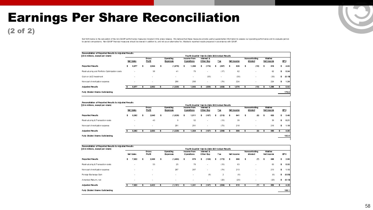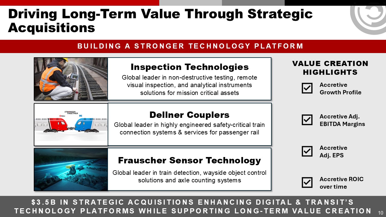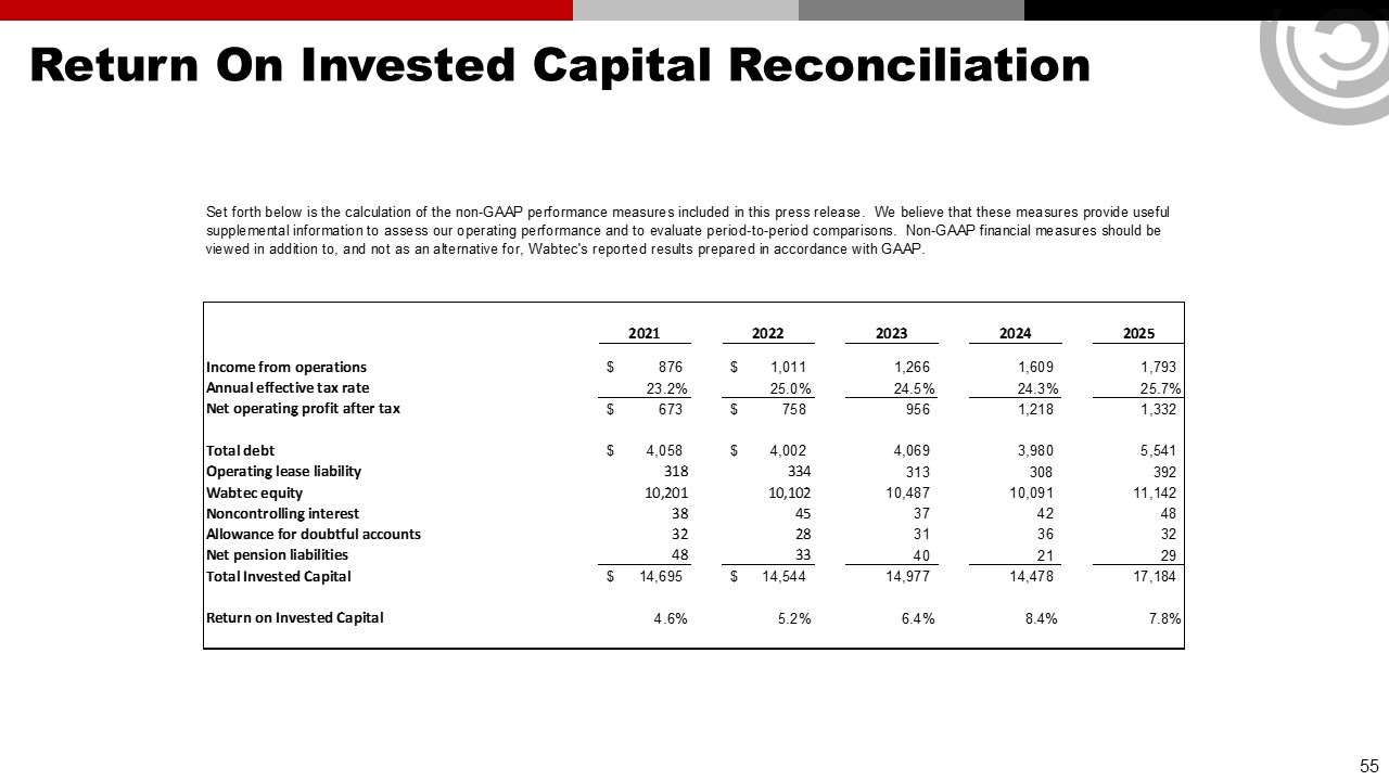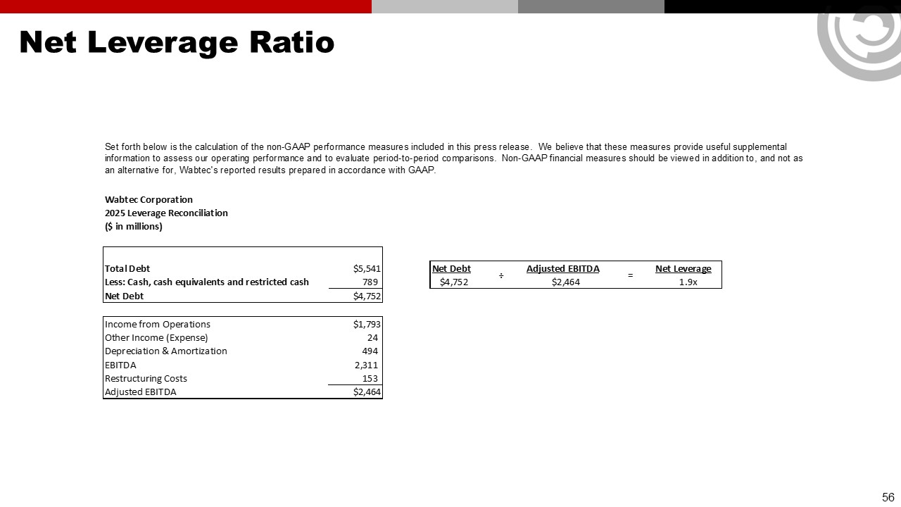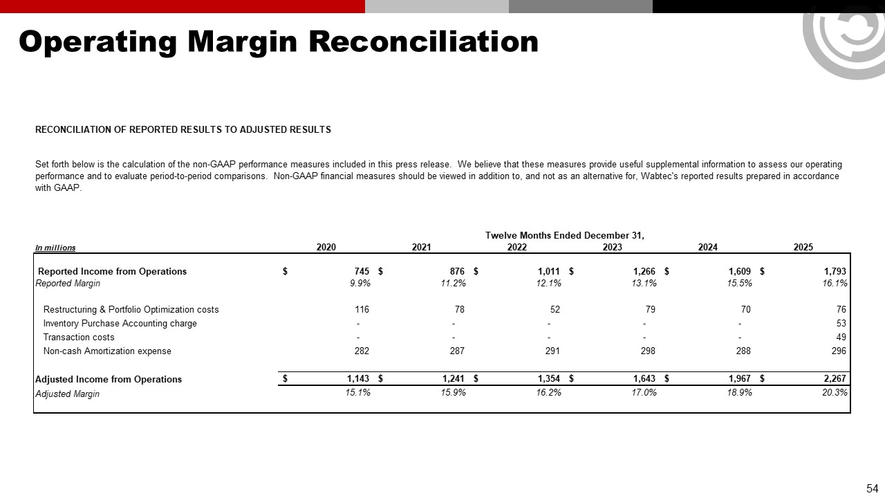 Forward Looking Statements & Non-GAAP Financial Information  This communication contains “forward-looking” statements as that term is defined in Section 27A of the Securities Act of 1933, as amended, and Section 21E of the Securities Exchange Act of 1934, as amended by the Private Securities Litigation Reform Act of 1995. All statements, other than historical facts, including statements regarding Wabtec’s plans, objectives, expectations and intentions; Wabtec’s expectations about future sales, earnings and cash conversion; Wabtec’s projected expenses and cost savings associated with its Integration 3.0 initiatives and its portfolio optimization; Wabtec’s 5-year outlook (established in February 2025); Wabtec’s expectations for evolving global industry, market and macro-economic conditions and their impact on Wabtec’s business; anticipated drivers of growth and margin expansion; planned capital deployment priorities; synergies and other expected benefits from Wabtec’s acquisitions; Wabtec’s expectations for production and demand conditions; Wabtec’s sustainability initiatives and their potential outcomes and impacts; and any assumptions underlying any of the foregoing, are forward looking statements. Forward-looking statements concern future circumstances and results and other statements that are not historical facts and are sometimes identified by the words “may,” “will,” “should,” “potential,” “intend,” “expect,” “endeavor,” “seek,” “anticipate,” “estimate,” “overestimate,” “underestimate,” “believe,” “could,” “project,” “predict,” “continue,” “target” or other similar words or expressions. Forward-looking statements are based upon current plans, estimates and expectations that are subject to risks, uncertainties and assumptions. Should one or more of these risks or uncertainties materialize, or should underlying assumptions prove incorrect, actual results may vary materially from those indicated or anticipated by such forward-looking statements. The inclusion of such statements should not be regarded as a representation that such plans, estimates or expectations will be achieved. Important factors that could cause actual results to differ materially from such plans, estimates or expectations include, among others, (1) changes in general economic and/or industry specific conditions, including the impacts of significant recent shifts in trade policies (including the actual or threatened imposition of tariffs and retaliatory measures) as well as tax programs, inflation, supply chain disruptions, foreign currency exchange and industry consolidation and market reactions to these factors; (2) changes in the financial condition or operating strategies of Wabtec's customers; (3) unexpected costs, charges or expenses resulting from acquisitions and potential failure to realize synergies and other anticipated benefits of acquisitions, including as a result of integrating acquired targets into Wabtec; (4) inability to retain and hire key personnel; (5) evolving legal, regulatory and tax regimes; (6) changes in the expected timing of projects; (7) a decrease in freight or passenger rail traffic; (8) an increase in manufacturing costs; (9) actions by third parties, including government agencies; (10) the impacts of epidemics, pandemics, or similar public health crises on the global economy and, in particular, our customers, suppliers and end-markets, (11) potential disruptions, instability, and volatility in global markets as a result of global military action, acts of terrorism or armed conflict, including Russia’s invasion of Ukraine; (12) cybersecurity and data protection risks and (13) other risk factors as detailed from time to time in Wabtec’s reports filed with the SEC, including Wabtec’s annual report on Form 10-K, periodic quarterly reports on Form 10-Q, current reports on Form 8-K and other documents filed with the SEC. The foregoing list of important factors is not exclusive. Any forward-looking statements speak only as of the date of this communication. Wabtec does not undertake any obligation to update any forward-looking statements, whether as a result of new information or development, future events or otherwise, except as required by law. Readers are cautioned not to place undue reliance on any of these forward-looking statements.   This presentation mentions certain non-GAAP financial performance measures, including adjusted gross profit, adjusted operating expenses, adjusted income from operations, adjusted interest and other expense, adjusted net income, adjusted operating margin, adjusted gross margin, adjusted income tax expense, adjusted effective tax rate, adjusted earnings per diluted share, EBITDA and adjusted EBITDA, net debt and operating cash flow conversion rate. Wabtec defines EBITDA as earnings before interest, taxes, depreciation and amortization. Adjusted EBITDA is further adjusted for restructuring costs. Wabtec defines operating cash flow conversion as net cash provided by operating activities divided by net income plus depreciation and amortization including deferred debt cost amortization. While Wabtec believes these are useful supplemental measures for investors, they are not presented in accordance with GAAP. Investors should not consider non-GAAP measures in isolation or as a substitute for net income, cash flows from operations, or any other items calculated in accordance with GAAP. In addition, the non-GAAP financial measures included in this presentation have inherent material limitations as performance measures because they add back certain expenses incurred by the Company to GAAP financial measures, resulting in those expenses not being taken into account in the applicable non-GAAP financial measure. Because not all companies use identical calculations, Wabtec’s presentation of non-GAAP financial measures may not be comparable to other similarly title