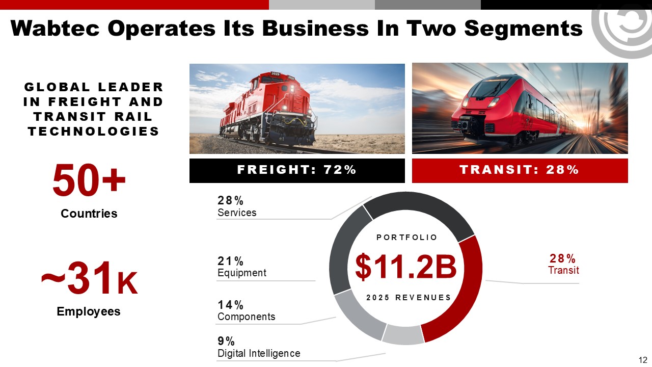Wabtec Operates Its Business In Two Segments  FREIGHT: 72%  TRANSIT: 28%  12  50+  Countries  ~31K  Employees  GLOBAL LEADER IN FREIGHT AND TRANSIT RAIL TECHNOLOGIES  28%  Services  $11.2B  portfolio  2025 revenues  21%  Equipment  28%  Transit  14%  Components  9%  Digital Intelligence