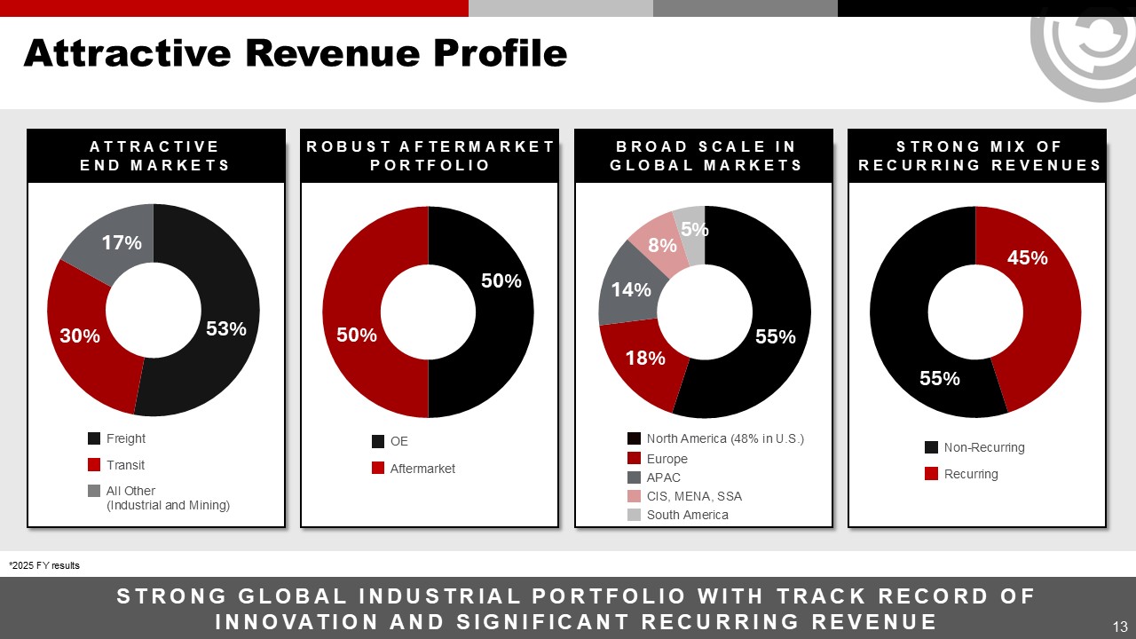 Attractive Revenue Profile  13  STRONG GLOBAL INDUSTRIAL PORTFOLIO WITH TRACK RECORD OF INNOVATION AND SIGNIFICANT RECURRING REVENUE  *2025 FY results  53%  50%  50%  45%  Attractiveend markets   Robust aftermarket portfolio   Broad scale in global markets  Strong mix of recurring revenues  Freight  Transit  All Other   (Industrial and Mining)  30%  17%  OE  Aftermarket  55%  18%  14%  Non-Recurring  Recurring  55%  North America (48% in U.S.)  Europe  APAC  CIS, MENA, SSA  South America  8%  5%