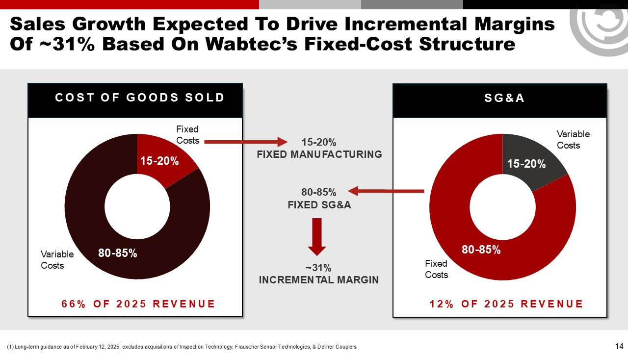Sales Growth Expected To Drive Incremental Margins Of ~31% Based On Wabtec’s Fixed-Cost Structure  15-20%  SG&A  80-85%  66% of 2025 Revenue  15-20%   FIXED MANUFACTURING  80-85%  FIXED SG&A  ~31%  INCREMENTAL MARGIN  COST OF GOODS SOLD  12% of 2025 Revenue  Variable  Costs  Variable Costs  15-20%  80-85%  Fixed Costs  Fixed Costs  14  (1) Long-term guidance as of February 12, 2025; excludes acquisitions of Inspection Technology, Frauscher Sensor Technologies, & Dellner Couplers