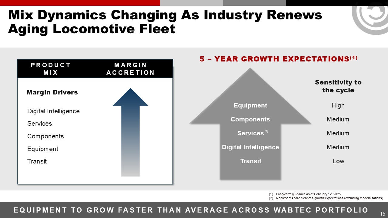 Mix Dynamics Changing As Industry Renews Aging Locomotive Fleet  15  EQUIPMENT TO GROW FASTER THAN AVERAGE ACROSS WABTEC PORTFOLIO  5 – YEAR GROWTH EXPECTATIONS(1)  Sensitivity to   the cycle   Equipment  High  Components  Medium  Services  Medium  Digital Intelligence  Medium  Transit  Low  PRODUCT MIX  Digital Intelligence  Services  Components  Equipment  Transit  Margin Drivers  Margin accretion  Long-term guidance as of February 12, 2025  Represents core Services growth expectations (excluding modernizations)  (2)