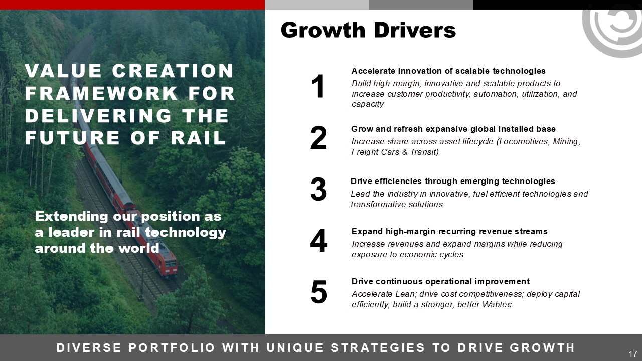 Growth Drivers  17  DIVERSE PORTFOLIO WITH UNIQUE STRATEGIES TO DRIVE GROWTH  VALUE CREATION FRAMEWORK FOR DELIVERING THE FUTURE OF RAIL  Extending our position as  a leader in rail technology  around the world  1  2  3  4  5  Drive efficiencies through emerging technologies  Lead the industry in innovative, fuel efficient technologies and transformative solutions  Grow and refresh expansive global installed base  Increase share across asset lifecycle (Locomotives, Mining, Freight Cars & Transit)  Expand high-margin recurring revenue streams  Increase revenues and expand margins while reducing exposure to economic cycles  Accelerate innovation of scalable technologies  Build high-margin, innovative and scalable products to increase customer productivity, automation, utilization, and capacity  Drive continuous operational improvement  Accelerate Lean; drive cost competitiveness; deploy capital efficiently; build a stronger, better Wabtec