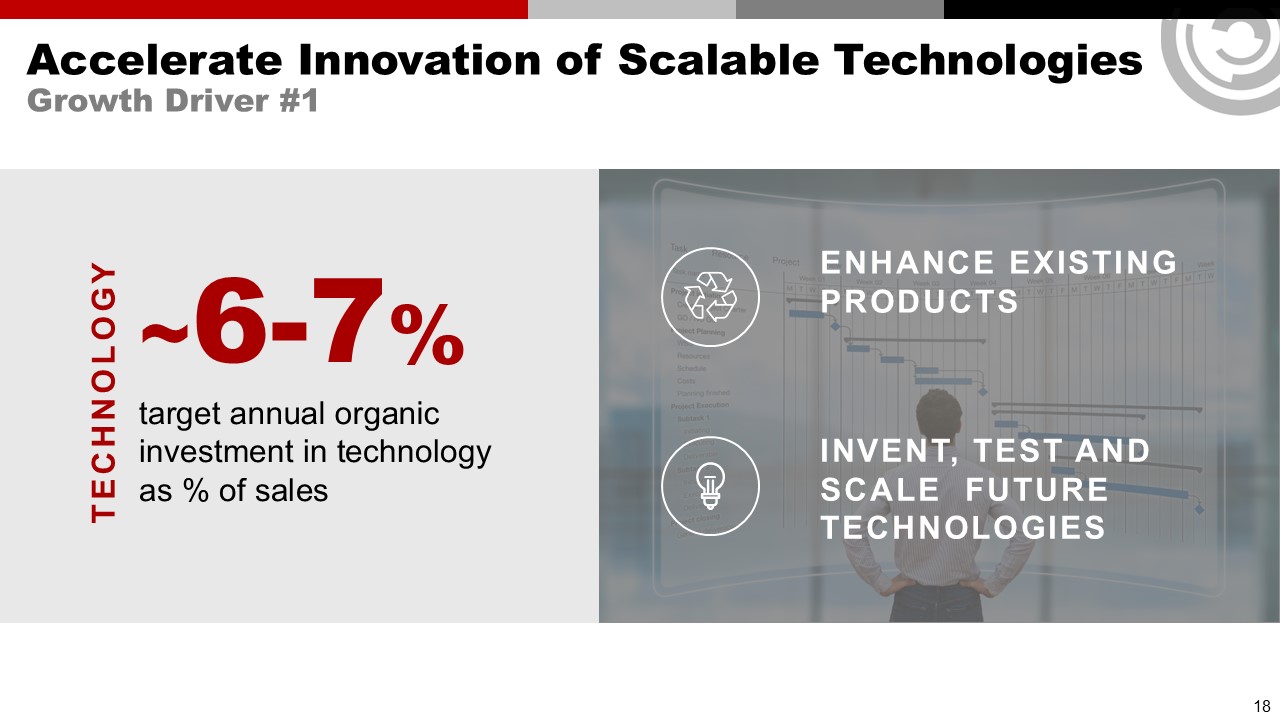 Accelerate Innovation of Scalable Technologies  Growth Driver #1  ENHANCE EXISTING PRODUCTS   INVENT, TEST AND SCALE FUTURE technologies   ~6-7%  target annual organic investment in technology as % of sales   TECHNOLOGY  18
