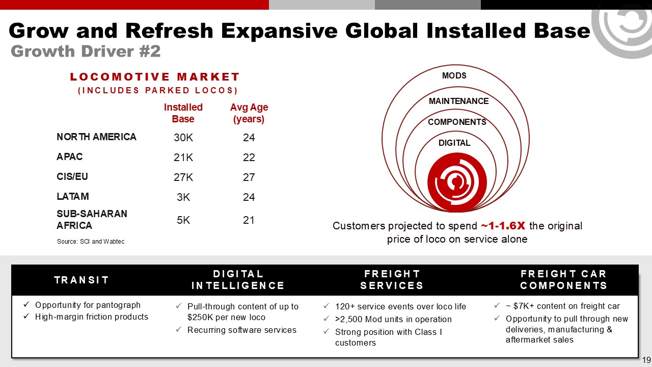 Grow and Refresh Expansive Global Installed Base  Growth Driver #2  Opportunity for pantograph   High-margin friction products   transit  Pull-through content of up to $250K per new loco  Recurring software services   DigitalIntelligence  120+ service events over loco life  >2,500 Mod units in operation  Strong position with Class I customers  Freightservices  ~ $7K+ content on freight car  Opportunity to pull through new deliveries, manufacturing & aftermarket sales  Freight Car Components   Installed Base  Avg Age   (years)  NORTH AMERICA  30K  24  APAC  21K  22  CIS/EU  27K  27  LATAM  3K  24  SUB-SAHARAN AFRICA  5K  21  LOCOMOTIVE market   (Includes Parked Locos)  Customers projected to spend ~1-1.6X the original price of loco on service alone  DIGITAL  COMPONENTS  MODS  MAINTENANCE  Source: SCI and Wabtec  19