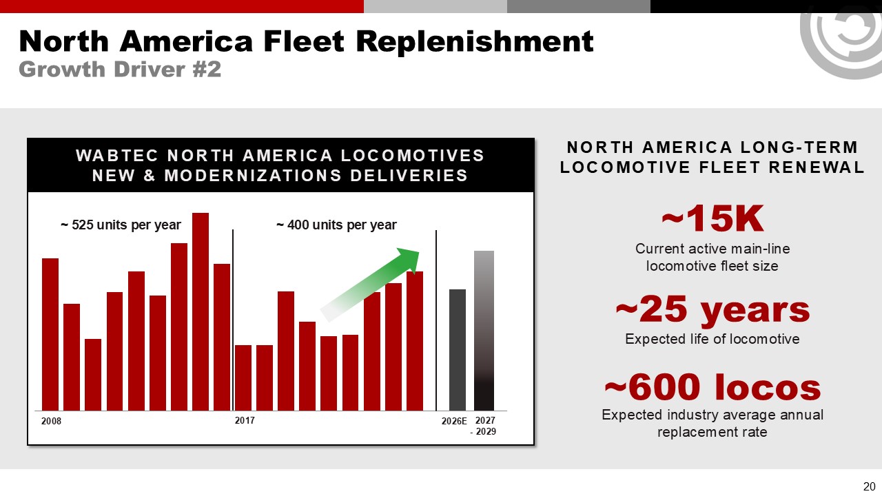 Wabtec North America Locomotives   New & Modernizations deliveries  ~ 525 units per year  ~ 400 units per year  2008  2017   2027 - 2029  North America Fleet Replenishment  Growth Driver #2  Current active main-line locomotive fleet size  ~15K  ~25 years  ~600 locos  North America long-term locomotive fleet renewal  Expected life of locomotive  Expected industry average annual replacement rate  20  2026E