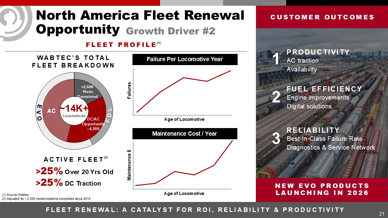 North America Fleet RenewalOpportunity  Growth Driver #2  21  T1  T4  DC  fleet profile  T3  Fleet renewal: A catalyst for ROI, Reliability & Productivity  21  ~14K+  Locomotives  EVO   FDL  AC  DC/AC  Opportunity  ~4,900  Failure Per Locomotive Year  Maintenance Cost / Year  Age of Locomotive  Age of Locomotive  WABTEC’S TOTAL FLEET BREAKDOWN  >25% Over 20 Yrs Old  >25% DC Traction  ACTIVE FLEET  (2)  (1) Source Wabtec  (2) Adjusted for ~2,500 modernizations completed since 2015  Maintenance $  Failures  (1)  New EVO Products Launching in 2026  1  Productivity  AC traction  Availability  2  Fuel efficiency  Engine improvements  Digital solutions  3  Reliability  Best-In-Class Failure Rate  Diagnostics & Service Network  Customer outcomes