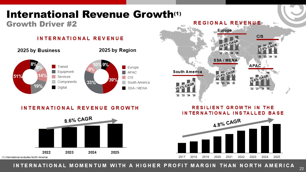 INTERNATIONAL MOMENTUM WITH A HIGHER PROFIT MARGIN THAN NORTH aMERICA  International Revenue Growth(1)  Growth Driver #2  22  REGIONAL Revenue  Europe  South America  SSA / MENA  CIS  APAC  Resilient Growth in the International INSTALLED BASE  4.8% CAGR  8.6% CAGR  International Revenue growth  International Revenue  2025 by Business  2025 by Region  Digital  Transit  Equipment  Services  Components  19%  51%  14%  8%  8%  39%  33%  9%  10%  9%  Europe  APAC  CIS  South America  SSA / MENA  10.6% CAGR  15.1% CAGR  11.4% CAGR  2.6% CAGR  5.6% CAGR  (1) International excludes North America